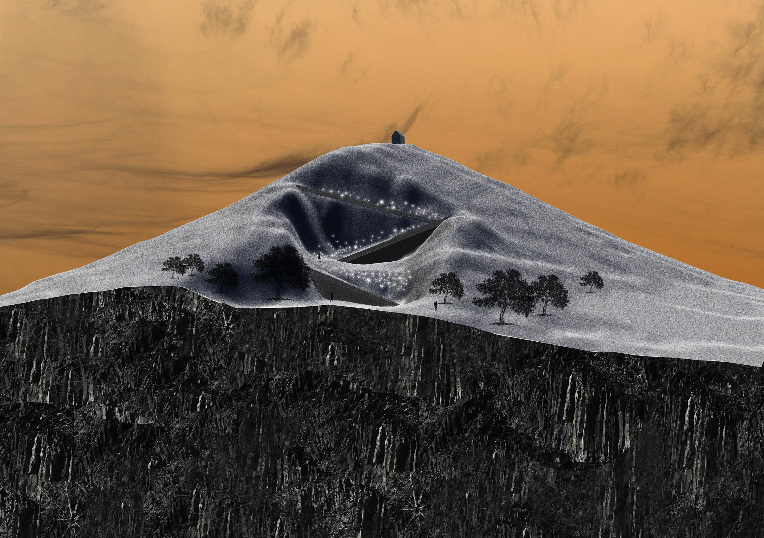 Kompozice návrhu zdůrazňuje stávající dominantu vyhlídky. Betonové schodiště ve tvaru elipsy kopíruje tvar údolí lomu a zároveň slouží jako nosný prvek pro zařízení letní scény (plátno, osvětlení). V údolí jsou rozmístěna demontovatelná dřevěná mola, ze kterých diváci sledují představení. Vše betonové je trvanlivé, vše dřevěné obnovitelné.