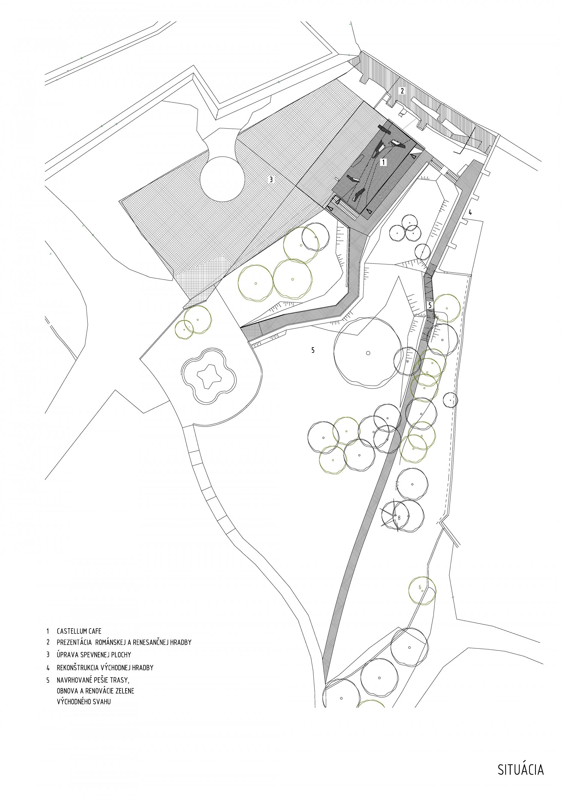 Návrh umiestnil do tohto priestoru objekt reštaurácie Castellum Cafe spájajúci funkcie oddychovej a vyhliadkovej terasy, reštaurácie a zázemia s toaletami pre návštevníkov reštaurácie a hradu. Koncept riešenia objektu jednoduchou architektonickou formou odpovedá na požiadavky zadania, danosti miesta a podmienky pamiatkovej ochrany. Objekt reštaurácie je zapustený do východného svahu hradného kopca. Viditeľnými časťami tak je iba transparentná fasáda reštaurácie a strešná drevená terasa.
