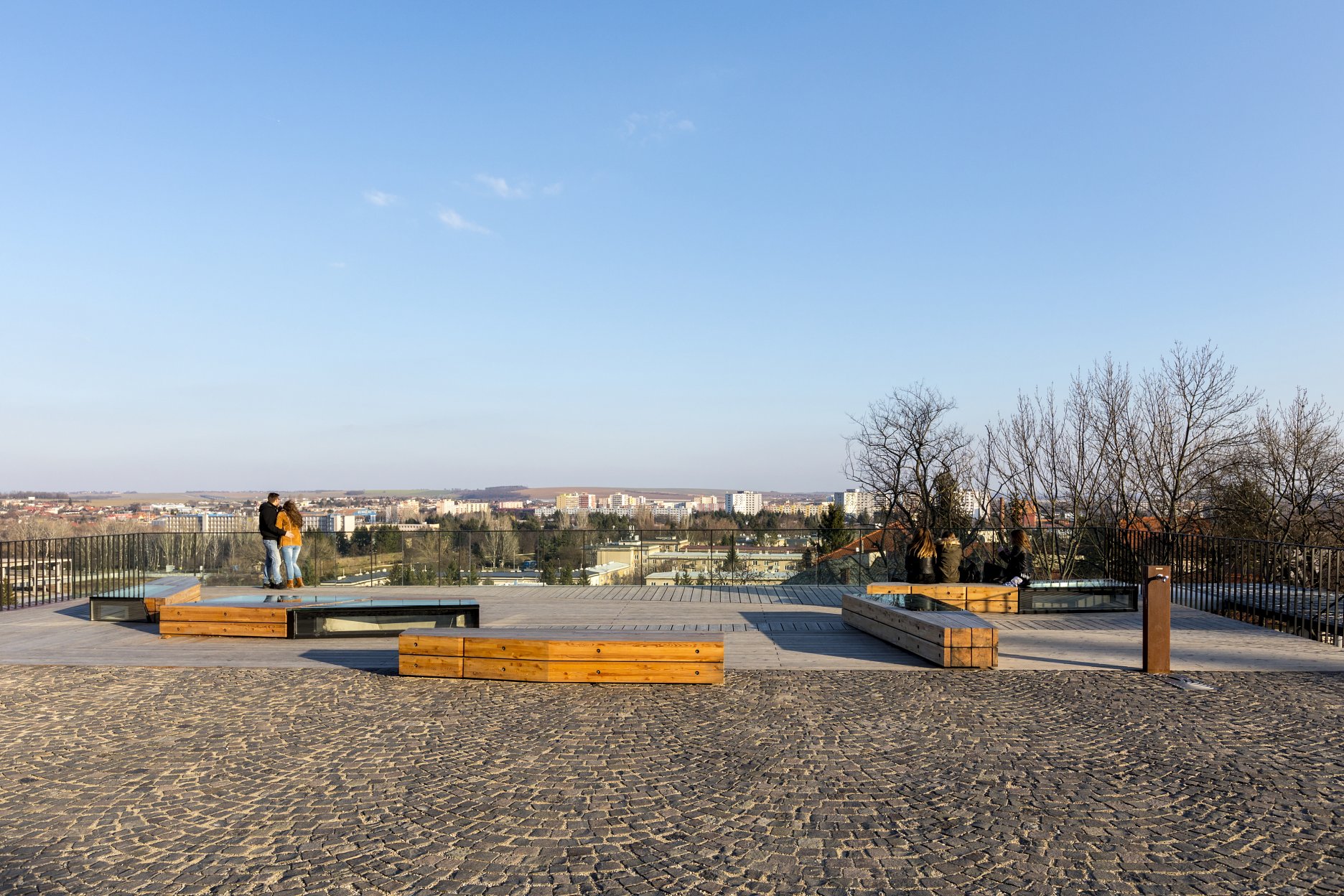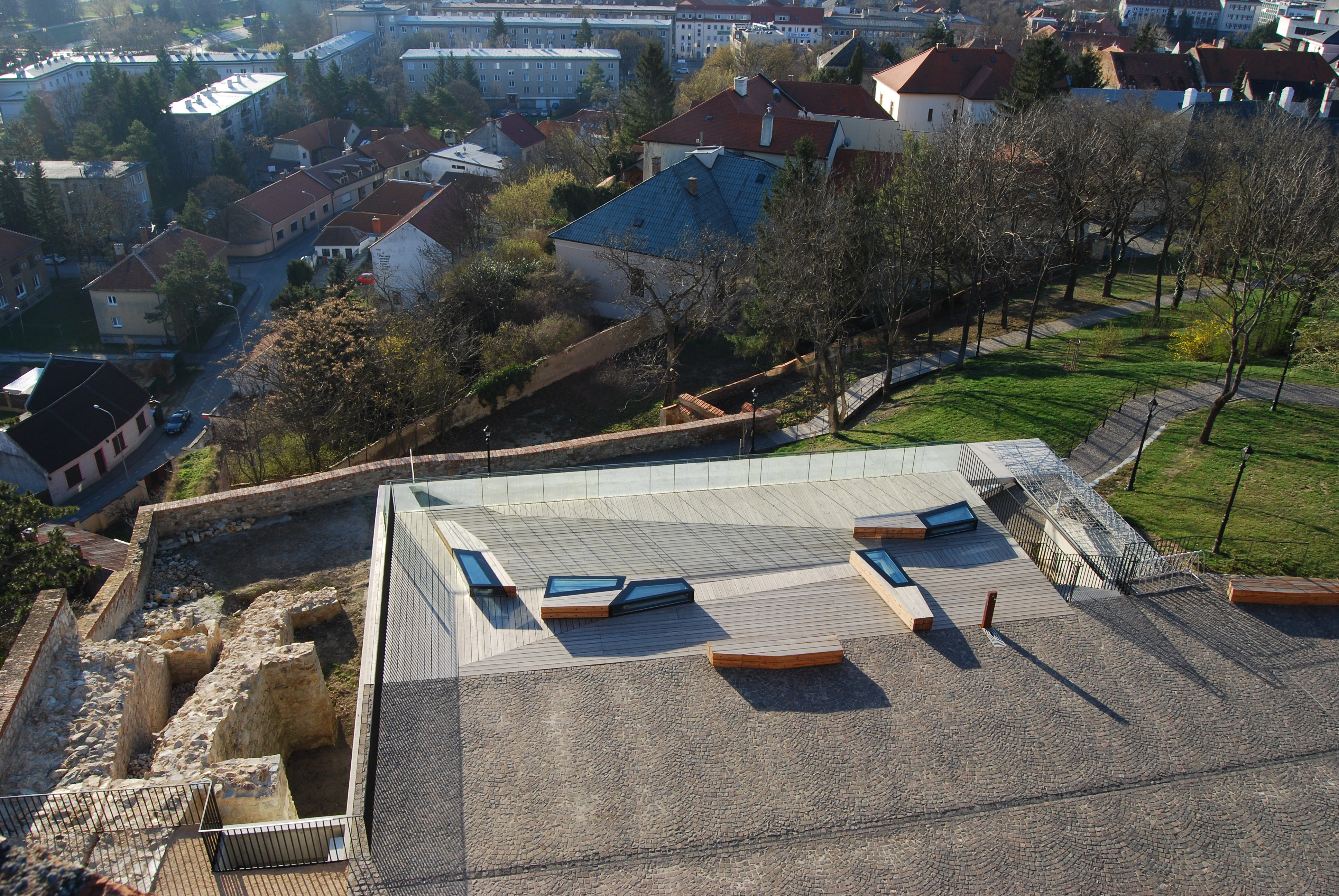 M.D.: V rámci projektu "Zlepšenie turistickej infraštruktúry sprístupnenia národnej kultúrnej pamiatky – Nitra hrad – vrátane obnovy jeho častí" sa riešilo viacero priestorov Nitrianskeho hradu. Našim zadaním bolo riešenie objektu služieb turistom - Castellum Cafe, vrátane interiéru. Objekt Castelum Cafe spája funkcie reštaurácie, oddychovej terasy s výhľadom na mesto a hrad a toaliet pre návštevníkov hradu. Súčasťou projektu bolo aj riešenie prezentácie historických hradieb nájdených pri archeologickom výskume v mieste objektu, oprava spadnutej časti východnej hradby, rekonštrukcia zelene a návrh peších trás na východnom svahu hradného kopca a rekonštrukcia povrchovej úpravy priestoru bývalého parkoviska pred vstupom do hradu. Okrem nášho projektu boli ďalšími stavebnými úpravami na hrade aj projekty rekonštrukcie a sprístupnenia hradnej pivnice a veže katedrály sv. Emeráma.