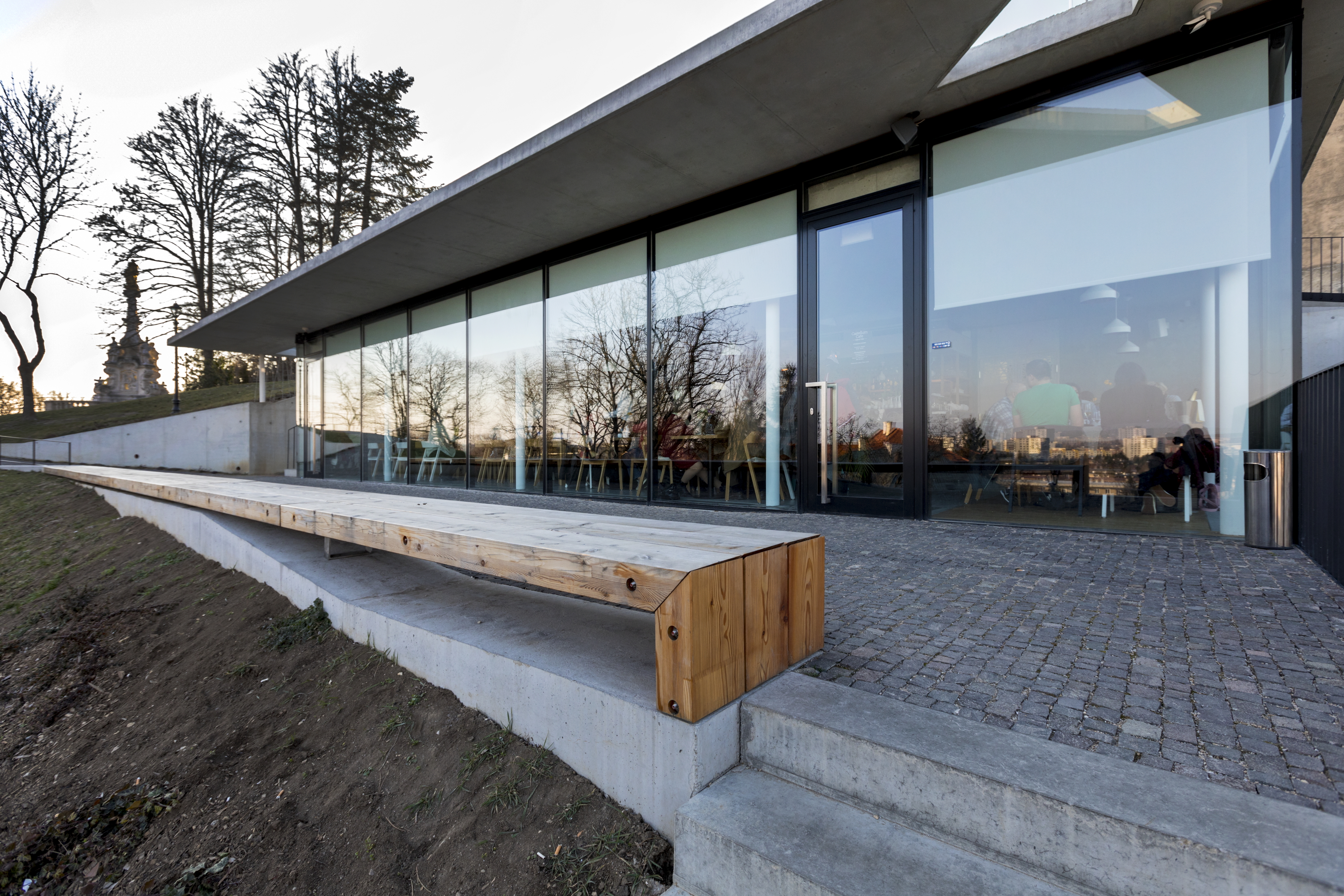 Pod strešnou drevenou terasou je prevádzka reštaurácie. So strešnej terasy sa betónovým exteriérovým schodiskom schádza na menšiu dláždenú terasu, ktorá je na úrovni vstupu do reštaurácie a ústi do nej aj chodník vedúci od Mariánskeho súsošia. Koncept reštaurácie je navrhnutý tak, aby čo najviac využíval možnosti výhľadu. Z reštaurácie je cez presklenú stenu smerom na východ výhľad na mesto, severným smerom na odkryté stredoveké hradby. Nosné konštrukcie monolitických stien a stropu sú priznané. Strešná betónová konštrukcia presahuje pred fasádu objektu a vytvára zatienenie interiéru a krytý priestor pre možnosť vonkajšieho sedenia na vstupnej terase. Priestor reštaurácie je so strešnou terasou vizuálne prepojený strešnými svetlíkmi v terasových laviciach, ktoré púšťajú svetlo do interiéru a večer osvetľujú terasu.