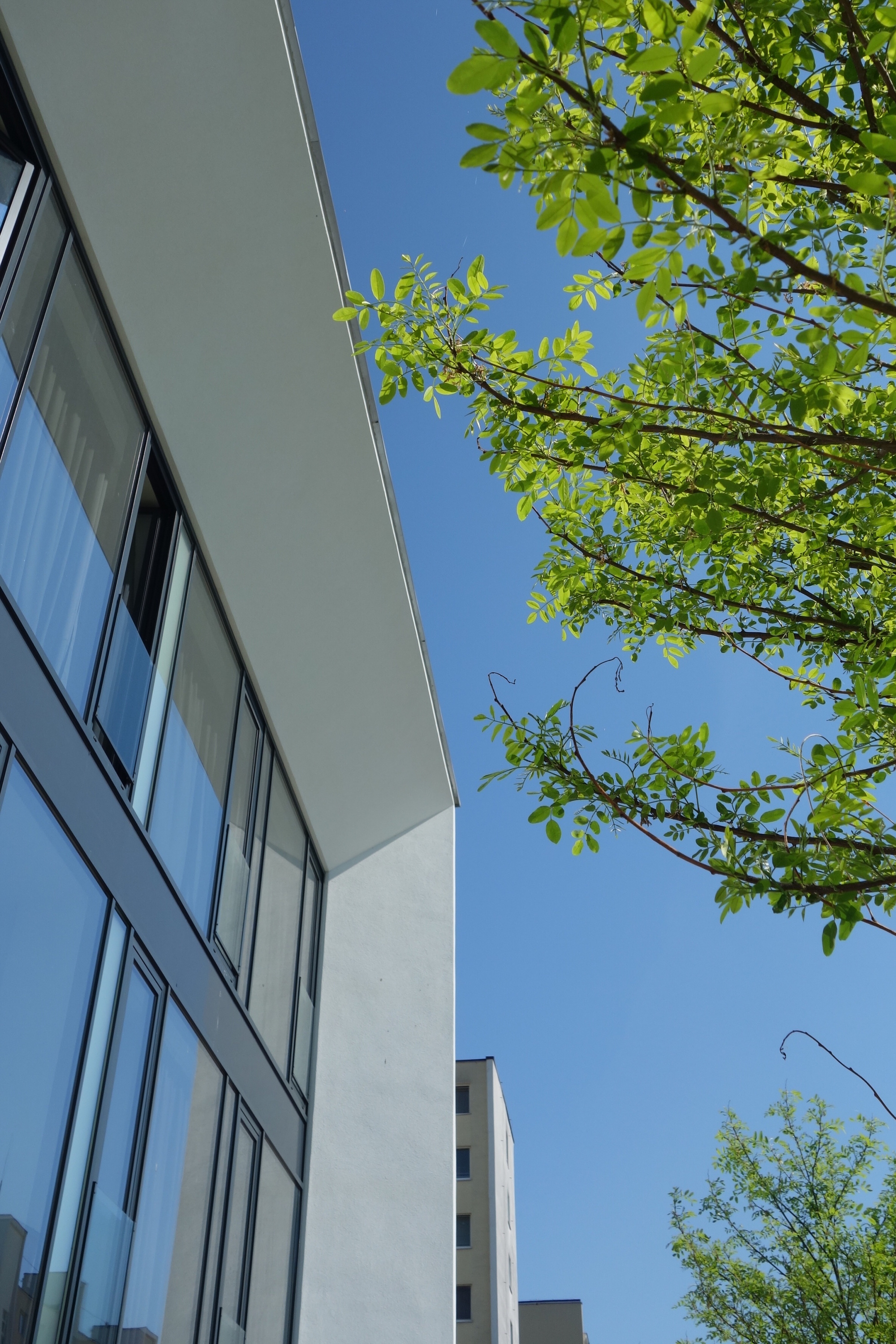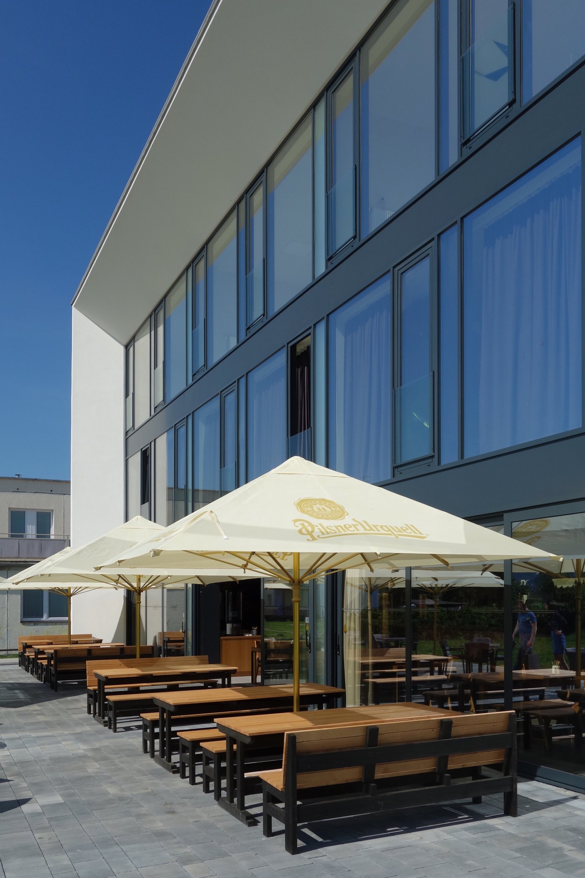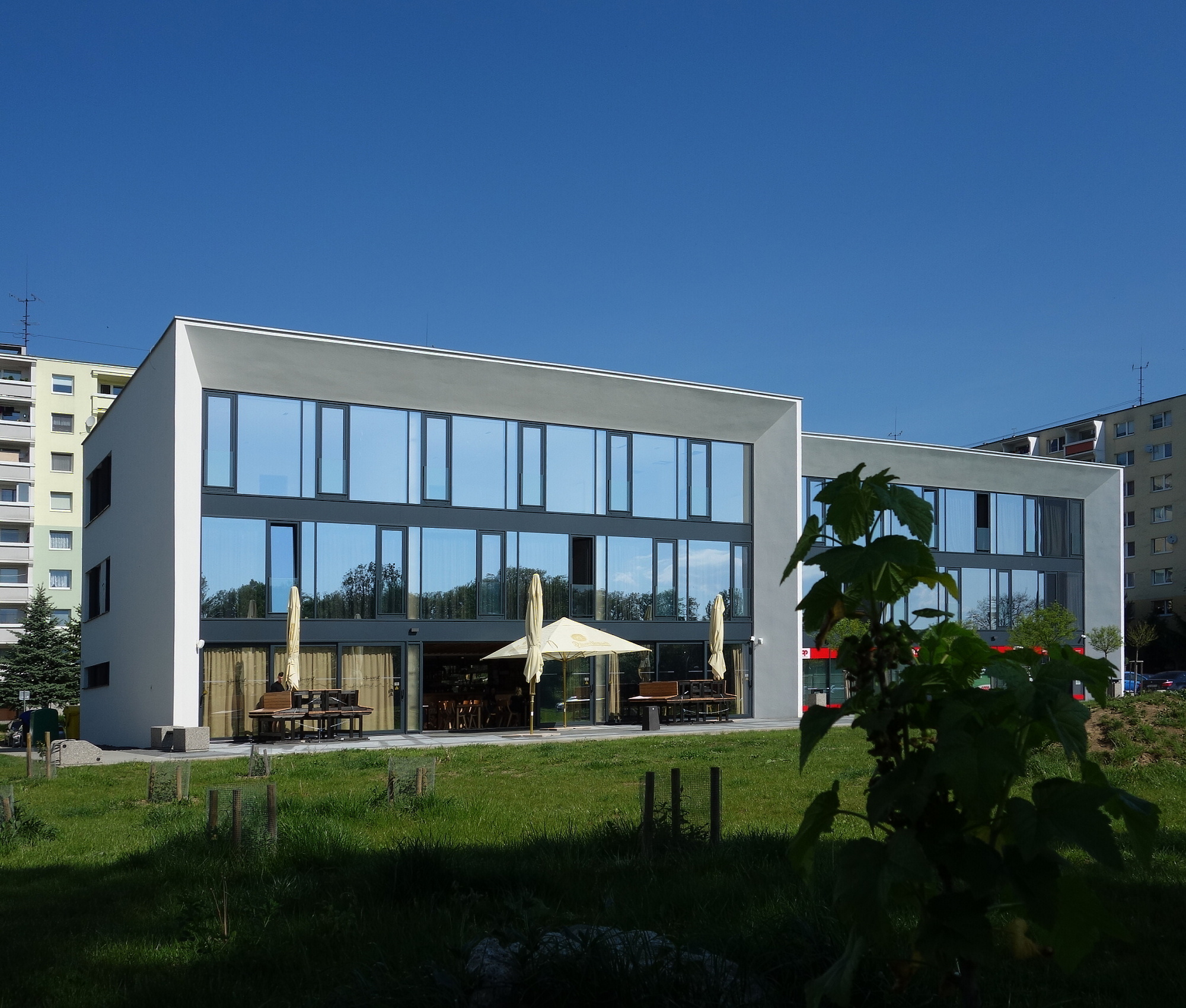 Fasády v princípe rešpektujú pôvodné členenie. Úprava spája samostatné okná do pásov s odkazom na prevažne kancelársky charakter budovy. Čelná juhovýchodná fasáda posúva pôvodnú otvorenosť ešte ďalej. Po odstránení pôvodných parapetných panelov je navrhnutá ako celopresklená s maximálnym otvorením smerom na Hron a park Lanice. Antracitové rámy splývajú zo zasklením a zanikajú na pozadí svetlosivej omietky.