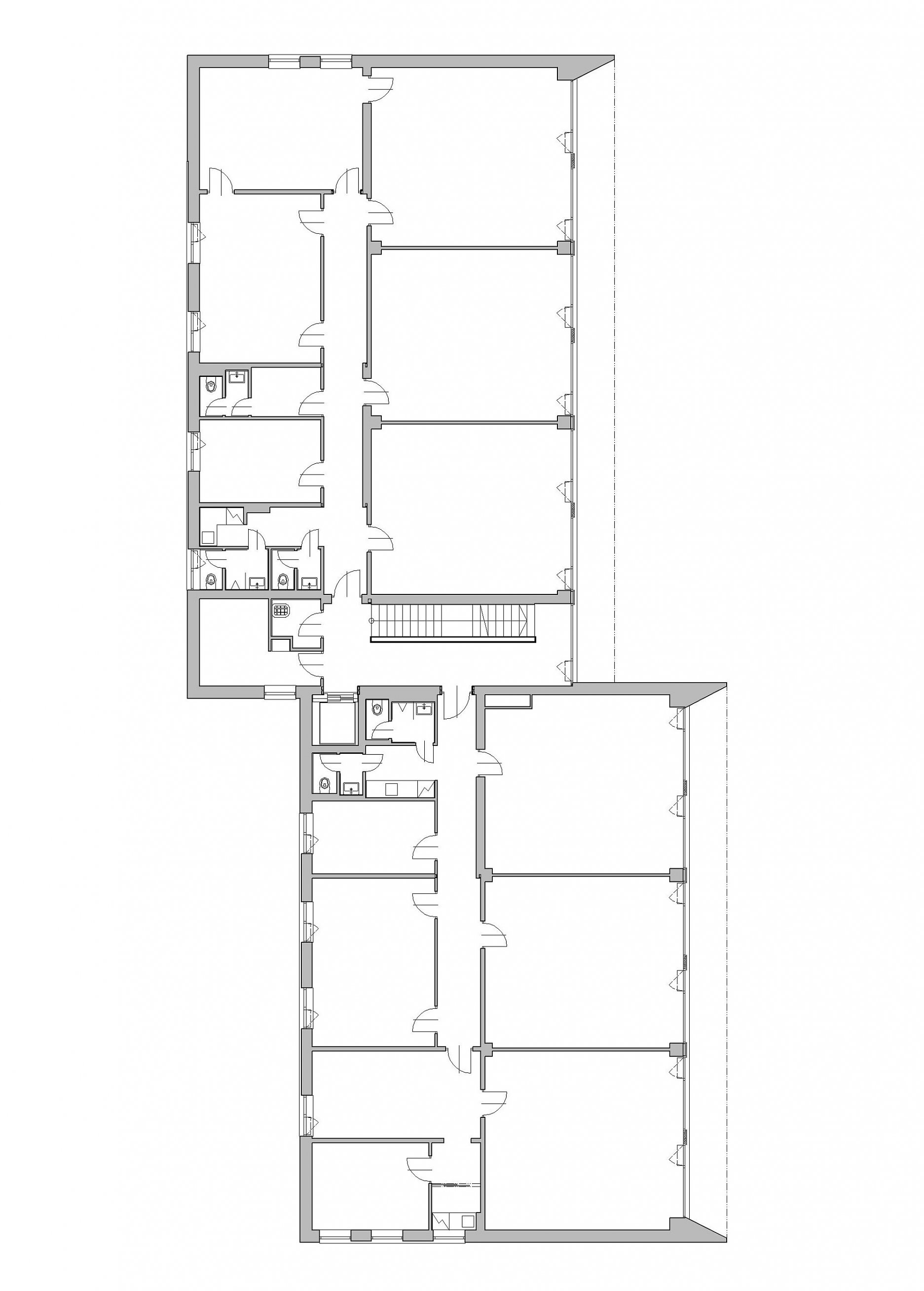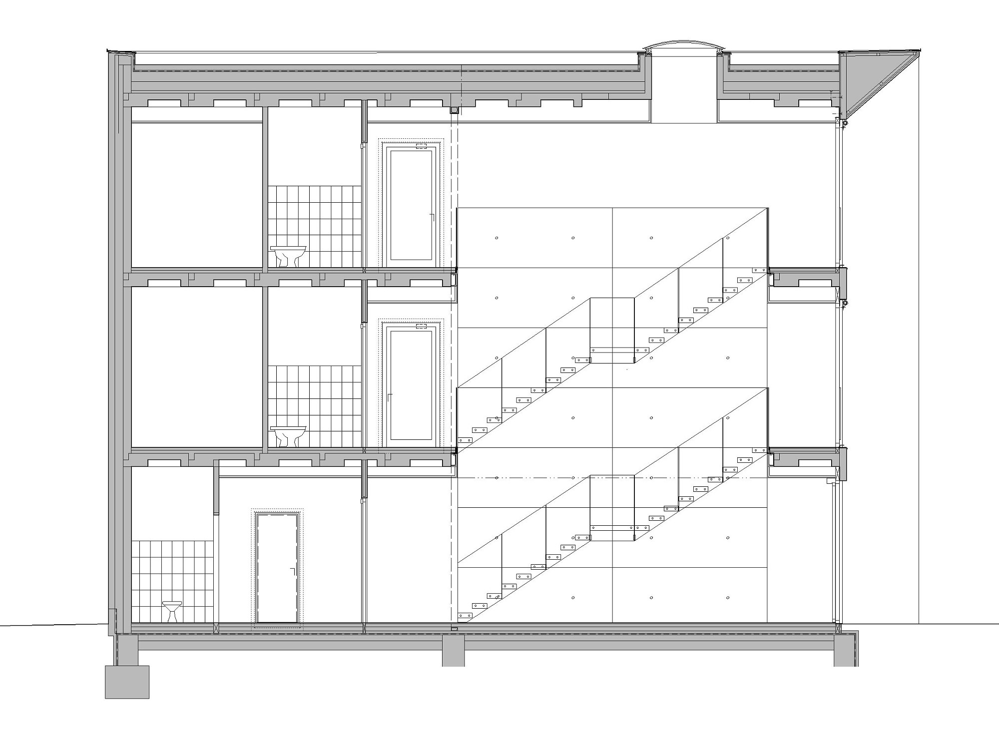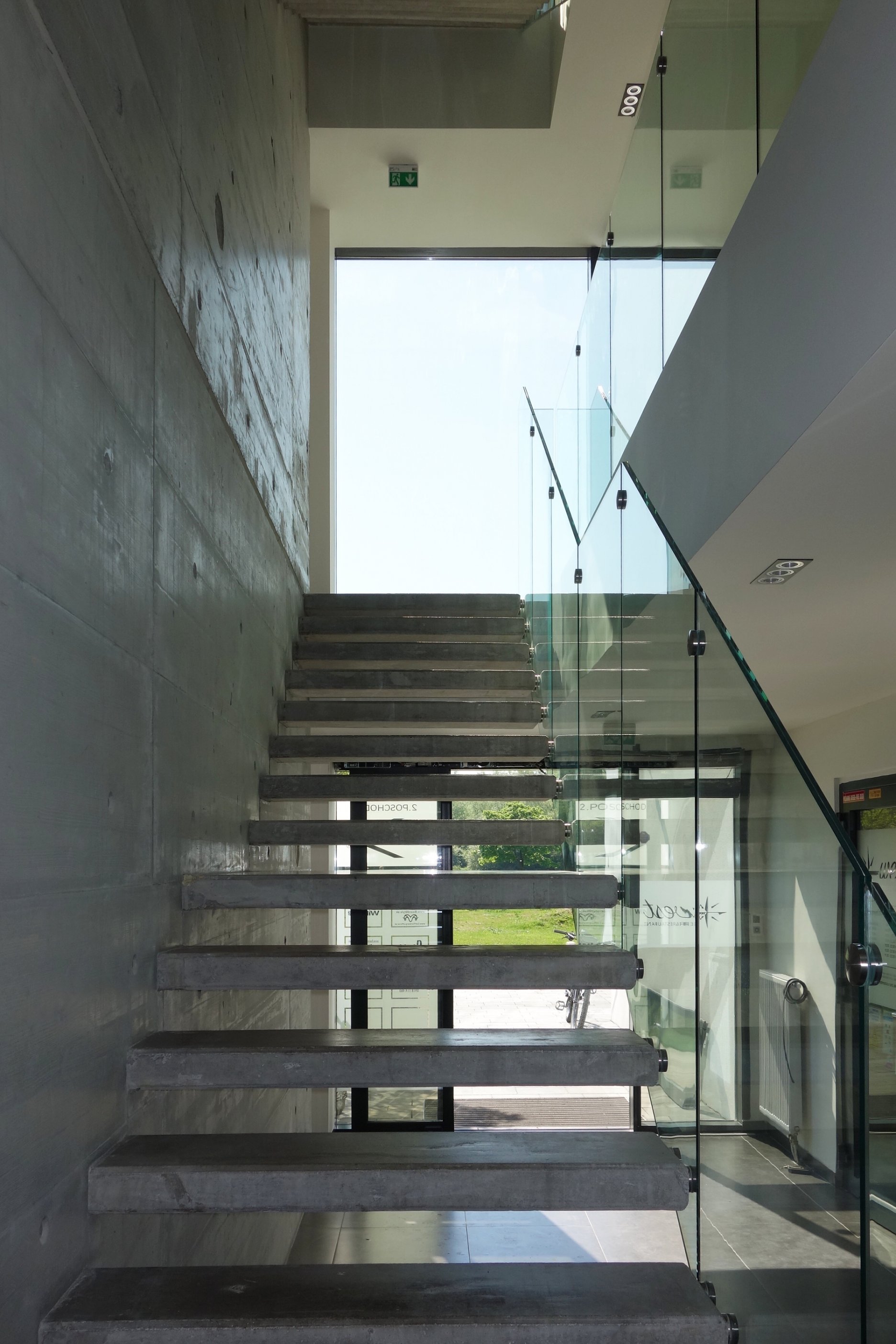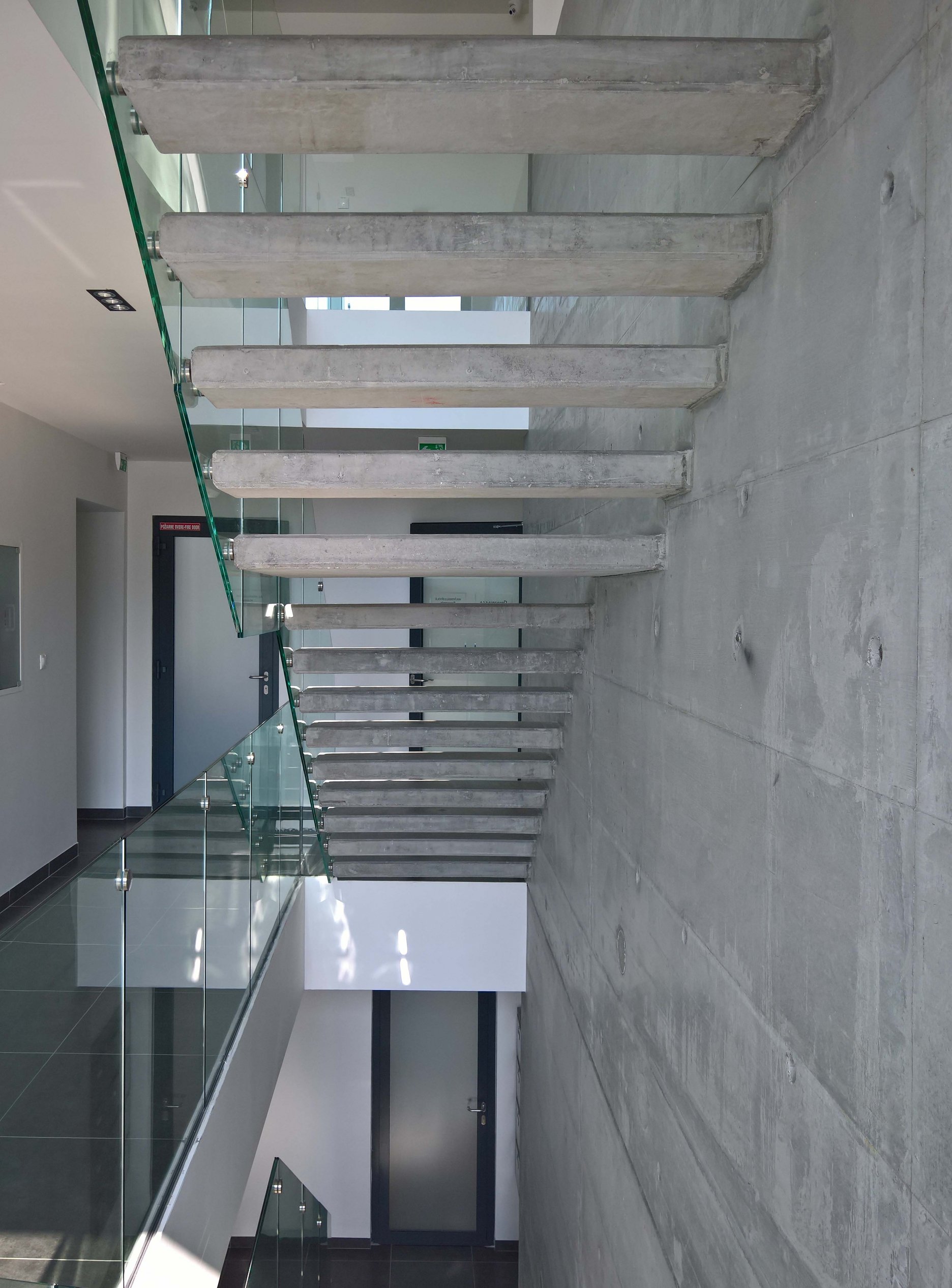 Nové monolitické steny a schodiská s vykonzolovanými železobetónovými stupňami vhodne dopĺňajú pôvodný konštrukčný systém budovy. Strohé riešenie spoločných priestorov a použité surové materiály v interiéri administratívnej časti boli zvolené so zreteľom na trvácnosť a minimálnu údržbu. Architekt navrhol aj interiér reštauračnej časti na prízemí. Do farebne neutrálneho rámca boli vložené akcenty z opaľovaného dreva a medi.