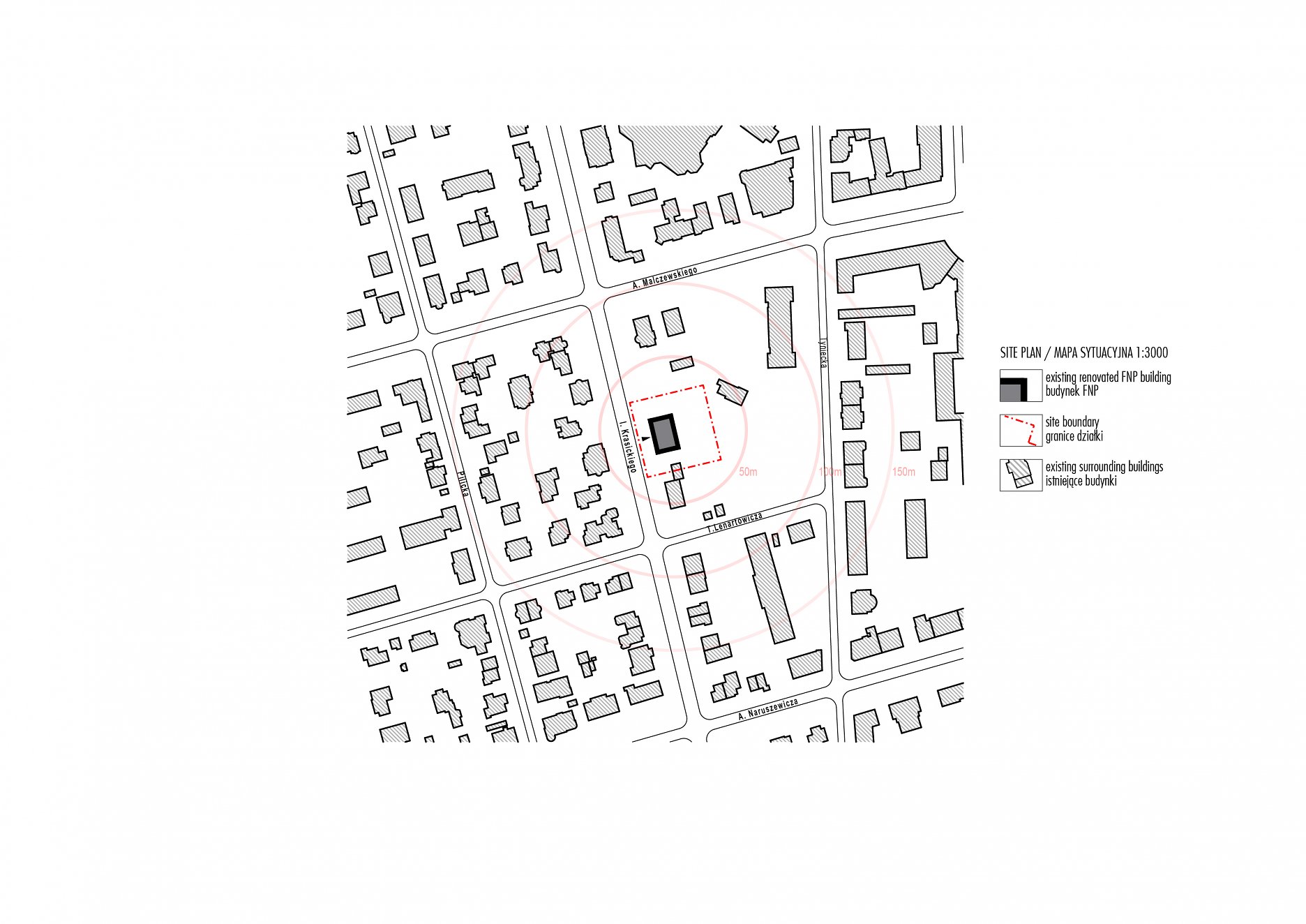 Objekt sa nachádza na sídlisku Wierzbno, ktoré je súčasťou varšavskej štvrtí Mokotów blízko centra mesta. Táto štvrť sa pripojila k mestu v tridsiatych rokoch. Krátko nato tu začala výstavba víl zasadených doprostred zelene. Pôvodná nízkopodlažná zástavba utrpela vážne škody počas bombardovania Varšavy v priebehu druhej svetovej vojny. Bytový dom, ktorý dostali architekti za úlohu prestavať bol postavený už v roku 1933. Počas vojny bol tiež vážne poškodený. Po zásahu bola zrútená väčšina prednej fasády a došlo aj vážnemu poškodeniu stropov na všetkých podlažiach. Zvyšok budovy bol zničený ohňom. “… praskliny v múroch vážne narušujú statiku budovy”.”Uličná fasáda bola zničená tlakovou vlnou, zvyšok budovy – strecha a druhé nadzemné podlažie vyhoreli”. Inšpektor J.Maliszewski, 17.08.1945.