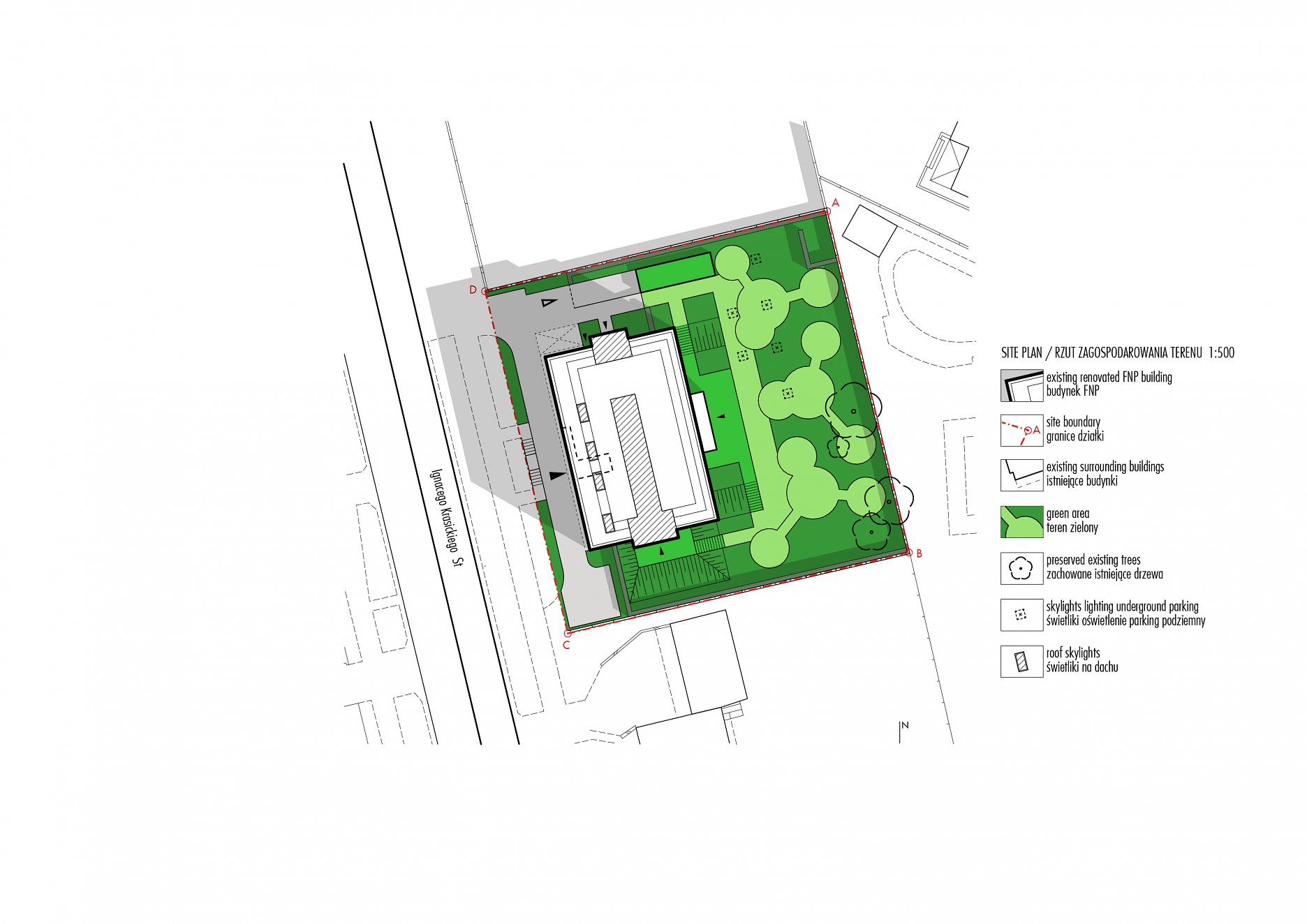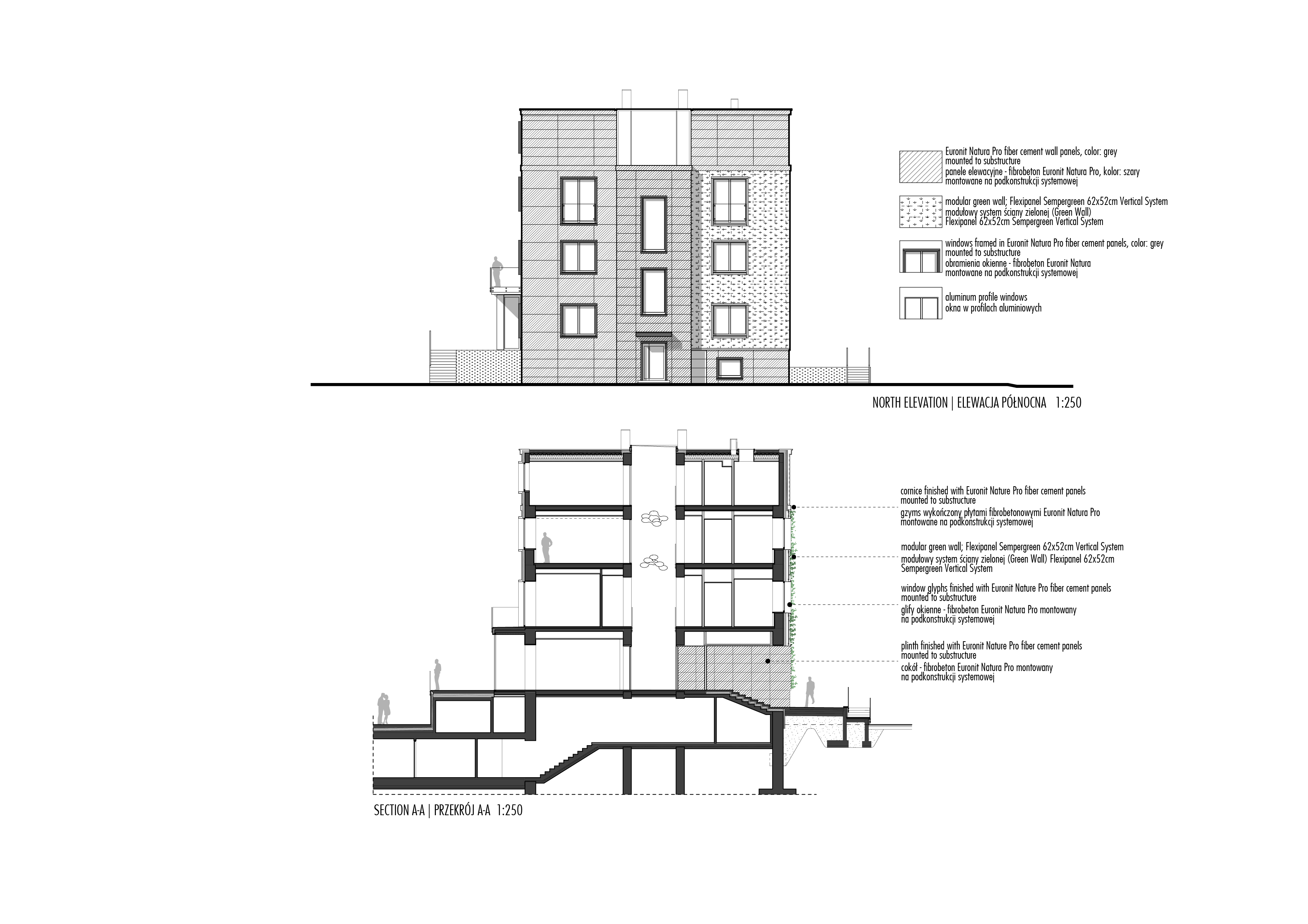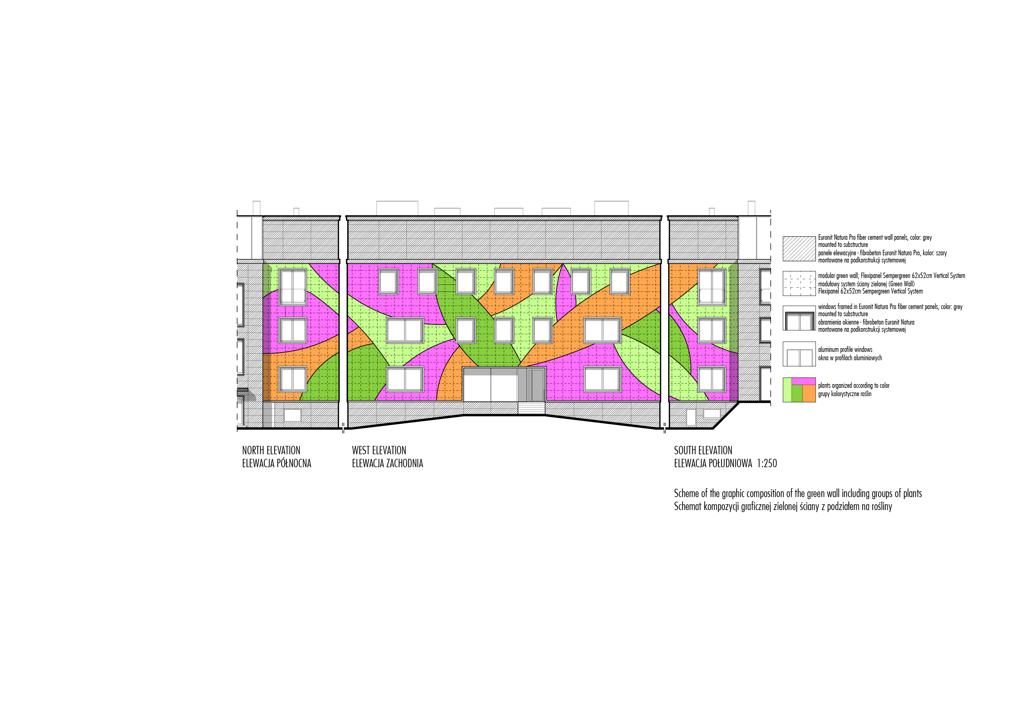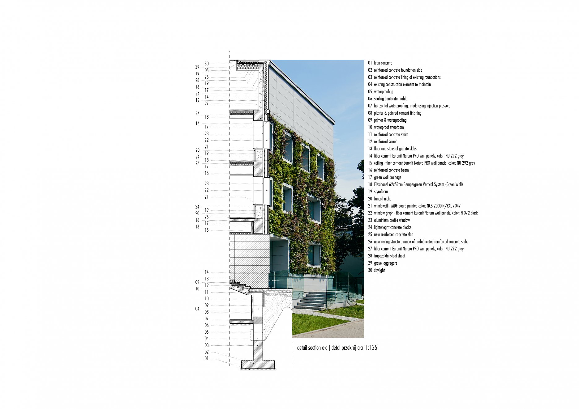 Hlavným poznávacím znakom tohto projektu je exteriérová vertikálna záhrada – prvá svojho druhu v Poľsku. Budova sa tak stala súčasťou zelene typickej pre túto mestskú časť. Zelená fasáda stiera hranice, zjemńuje hrany a kontrastuje s prísnou geometriou šedých betónových panelov. Výraz budovy sa mení s postupom času a striedaním ročných období. Výber rastlín bral v úvahu lokalitu a istá voľnosť bola ponechaná aj prírode – je iba otázkou času kedy sa tu rozrastú priviate semiačka…