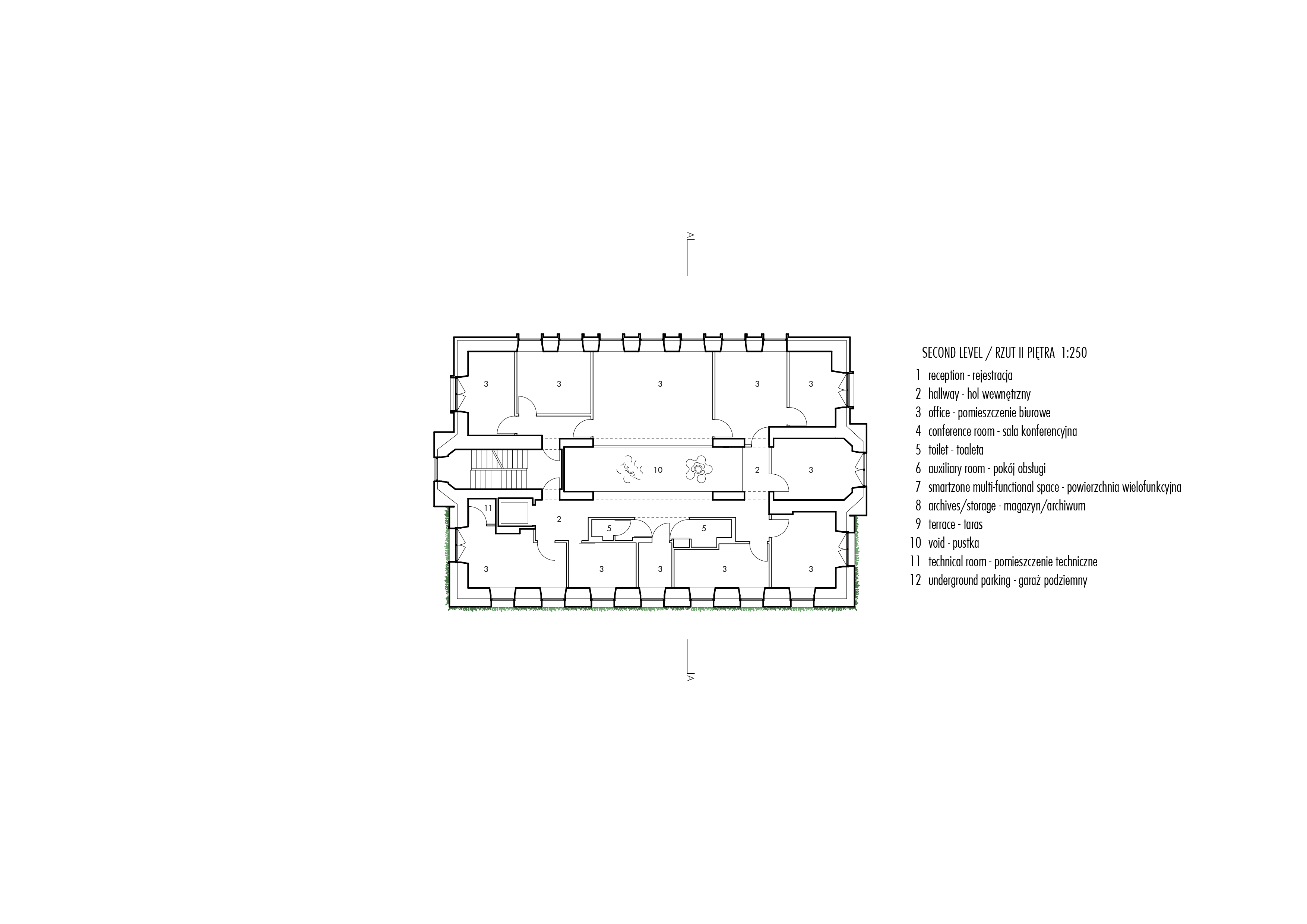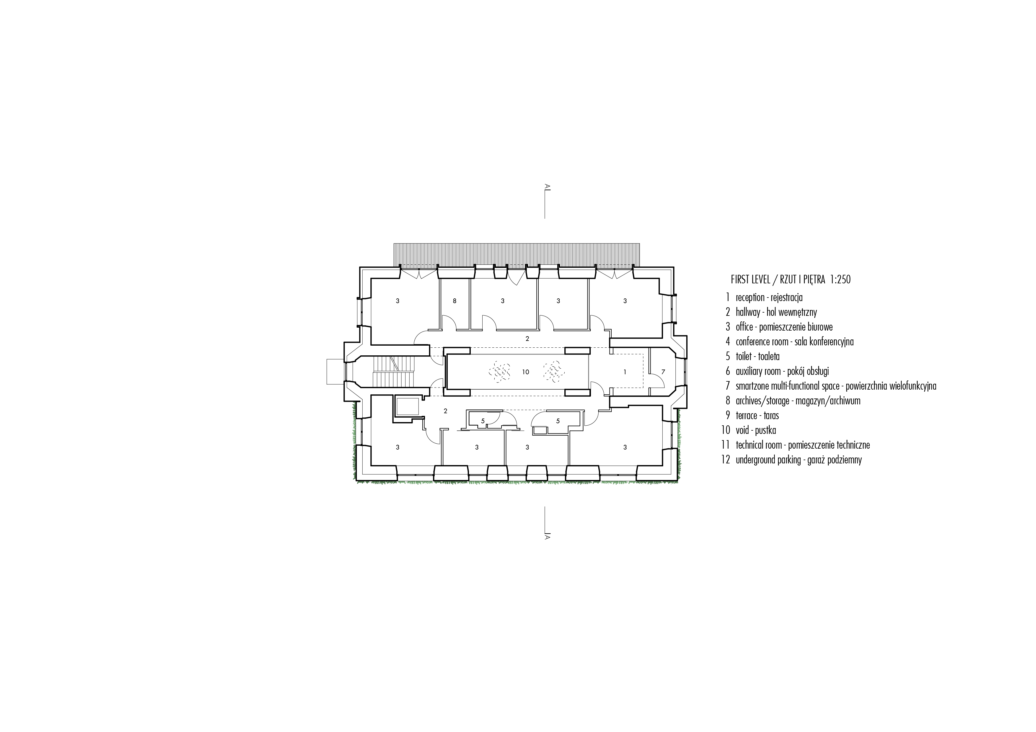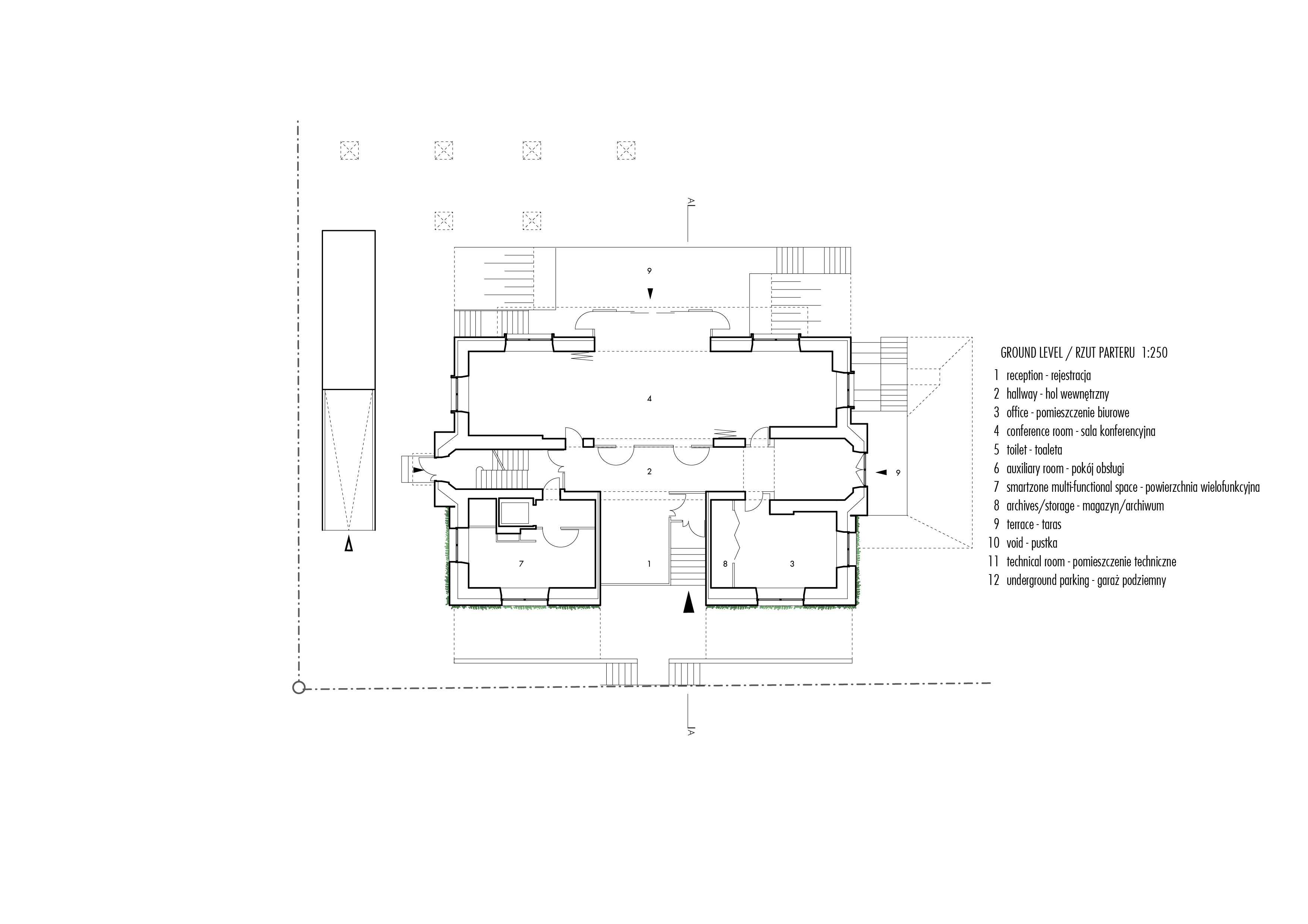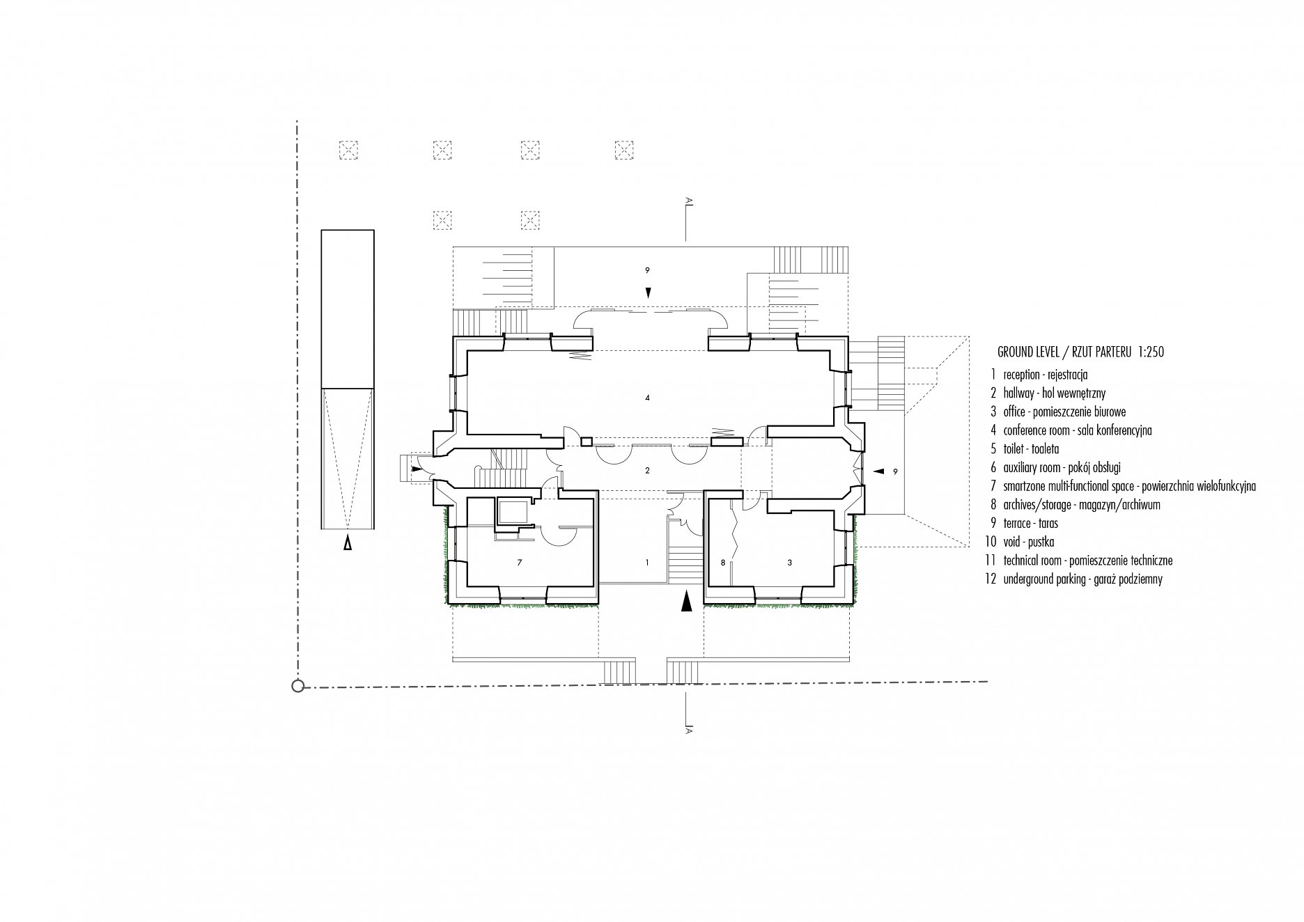 Likvidácia plotu na strane ulice umožňuje zväčšenie verejného priestoru prislúchajúceho budove. Pre verejnosť bol sprístupnená aj záhrada. Budova nie je jediným príkladom pozemku, ktorý nie je oddelený od mestskej zástavby prostredníctvom fyzickej bariéry na 900 metrovej Krasického ulici. Výrazným prvkom projektu je perforácia na úrovni prízemia, ktorá vizuálne prepája ulicu a záhradu.