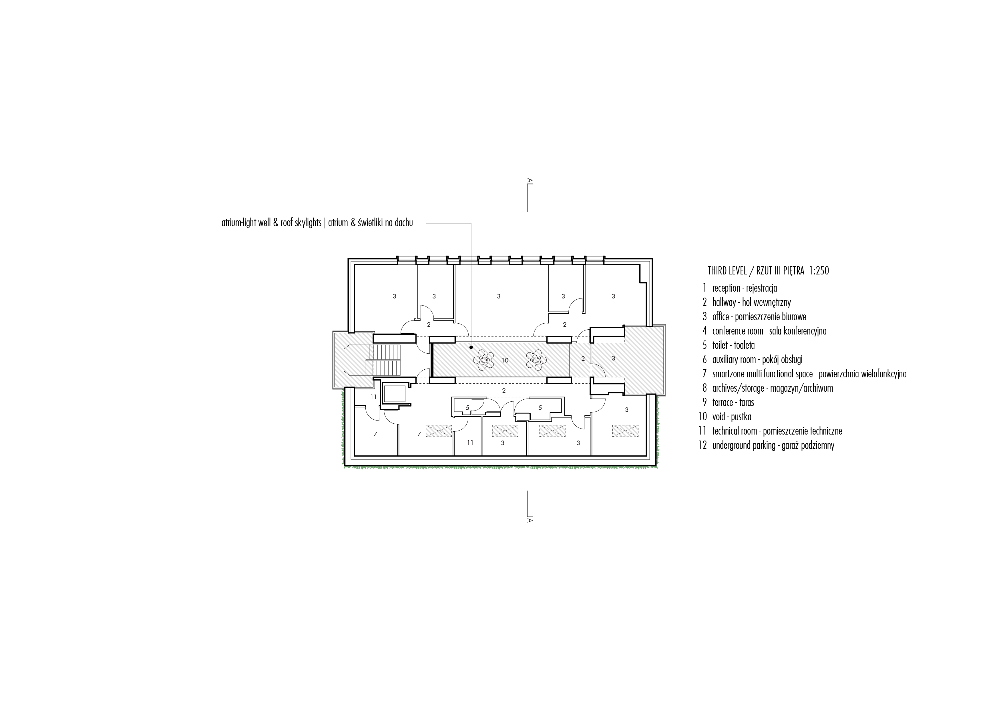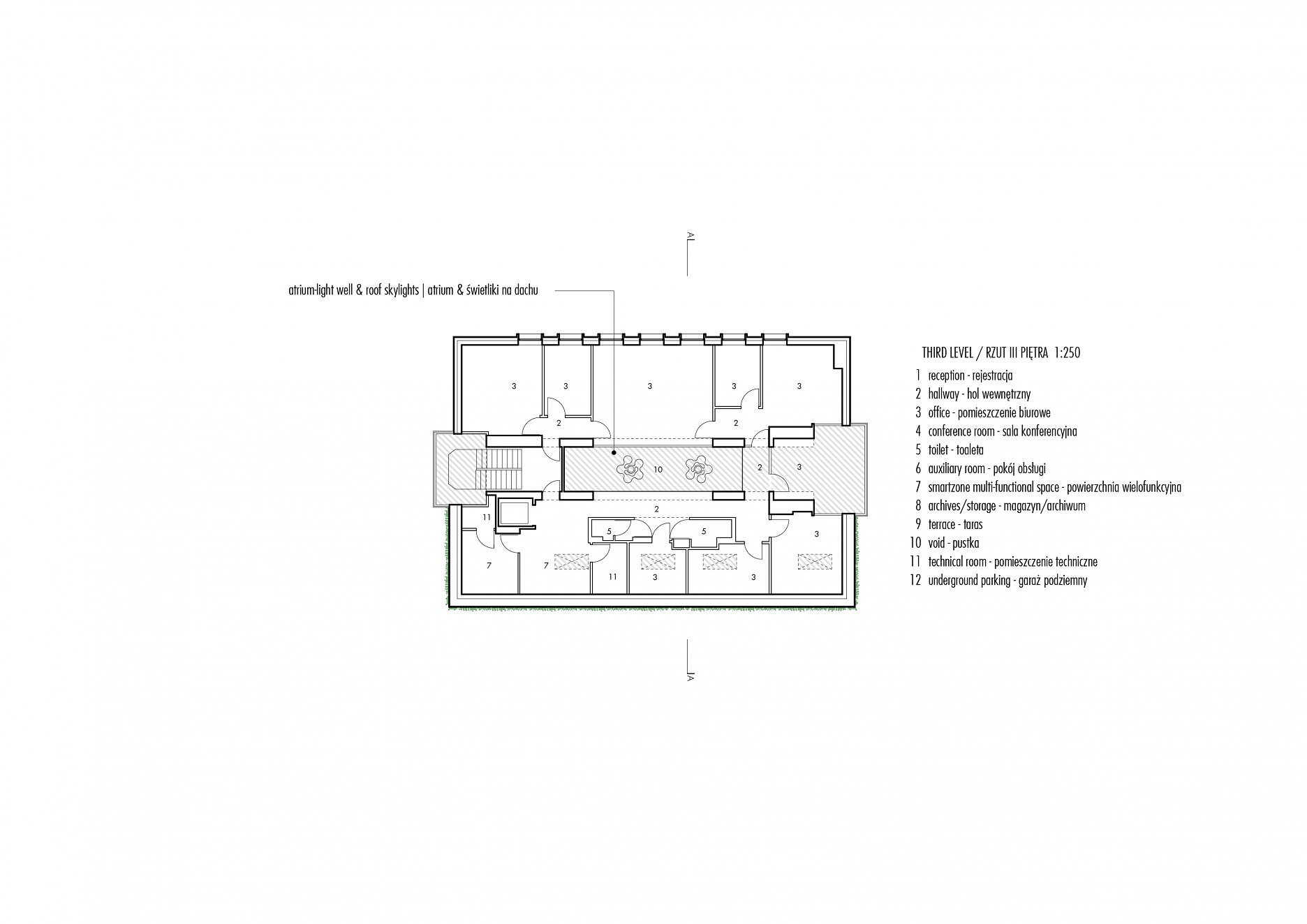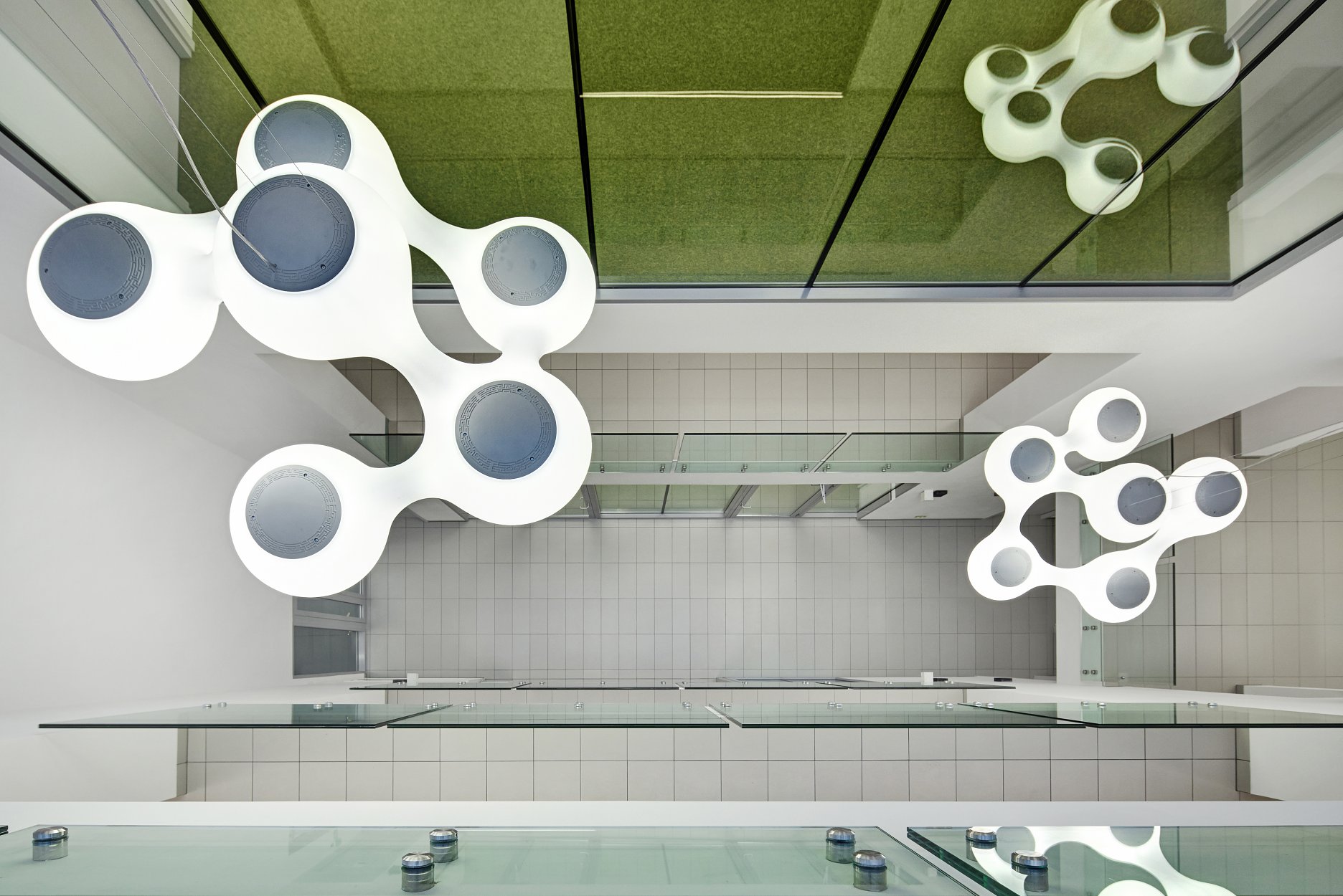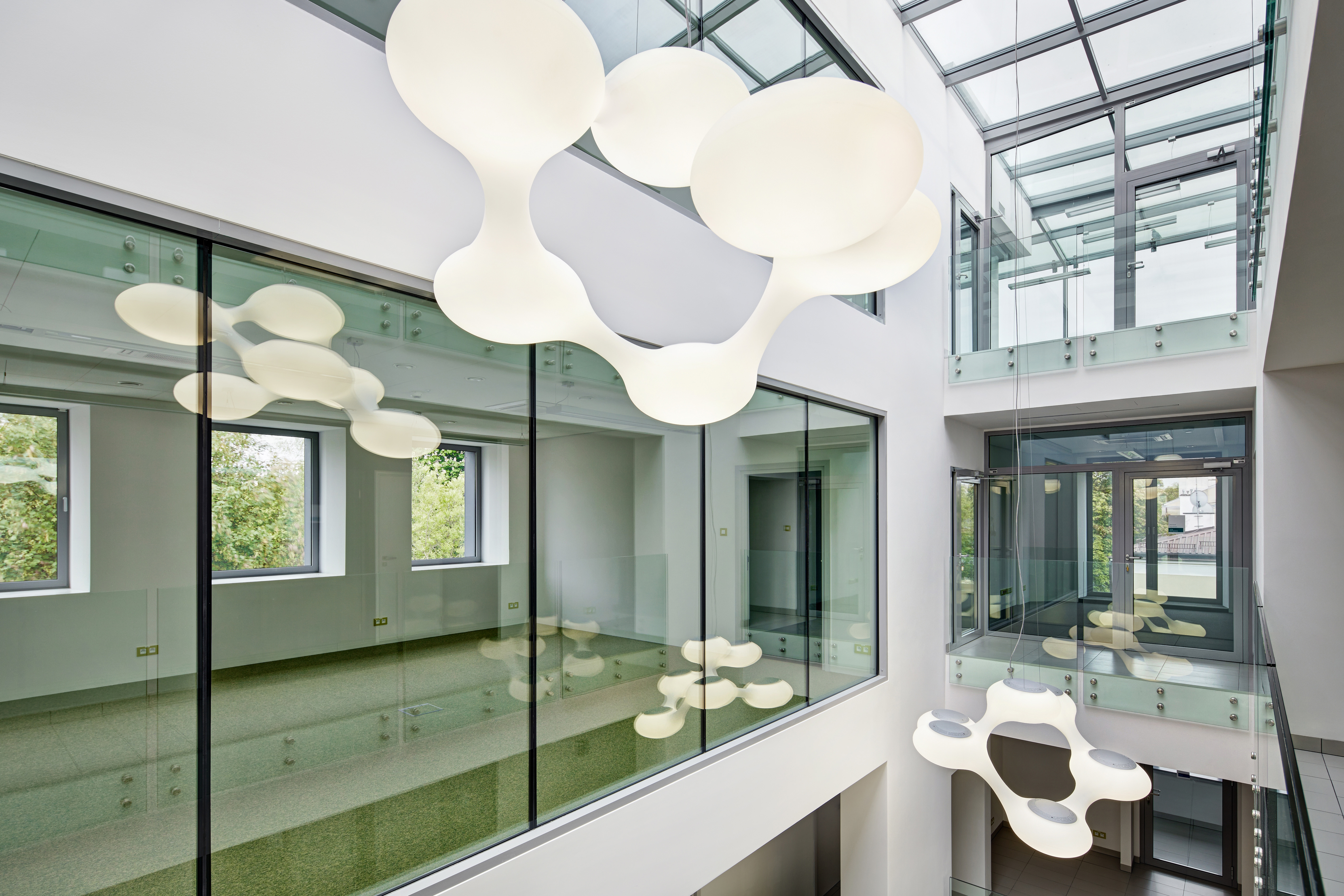Vnútorné átrium, ktoré prechádza cez všetky nadzemné podlažia vedie denné svetlo do budovy. Átrium, perforácia na úrovni prízemia a okná vytvárajú spolu systém, ktorý dovoľuje presvetliť 96% plochy interiéru vrátane kancelárií, chodieb a spoločných priestorov. Prízemie a podzemné parkovisko (presvetlené pomocou svetlíkov) nepotrebujú v priebehu dňa umelé osvetlenie.