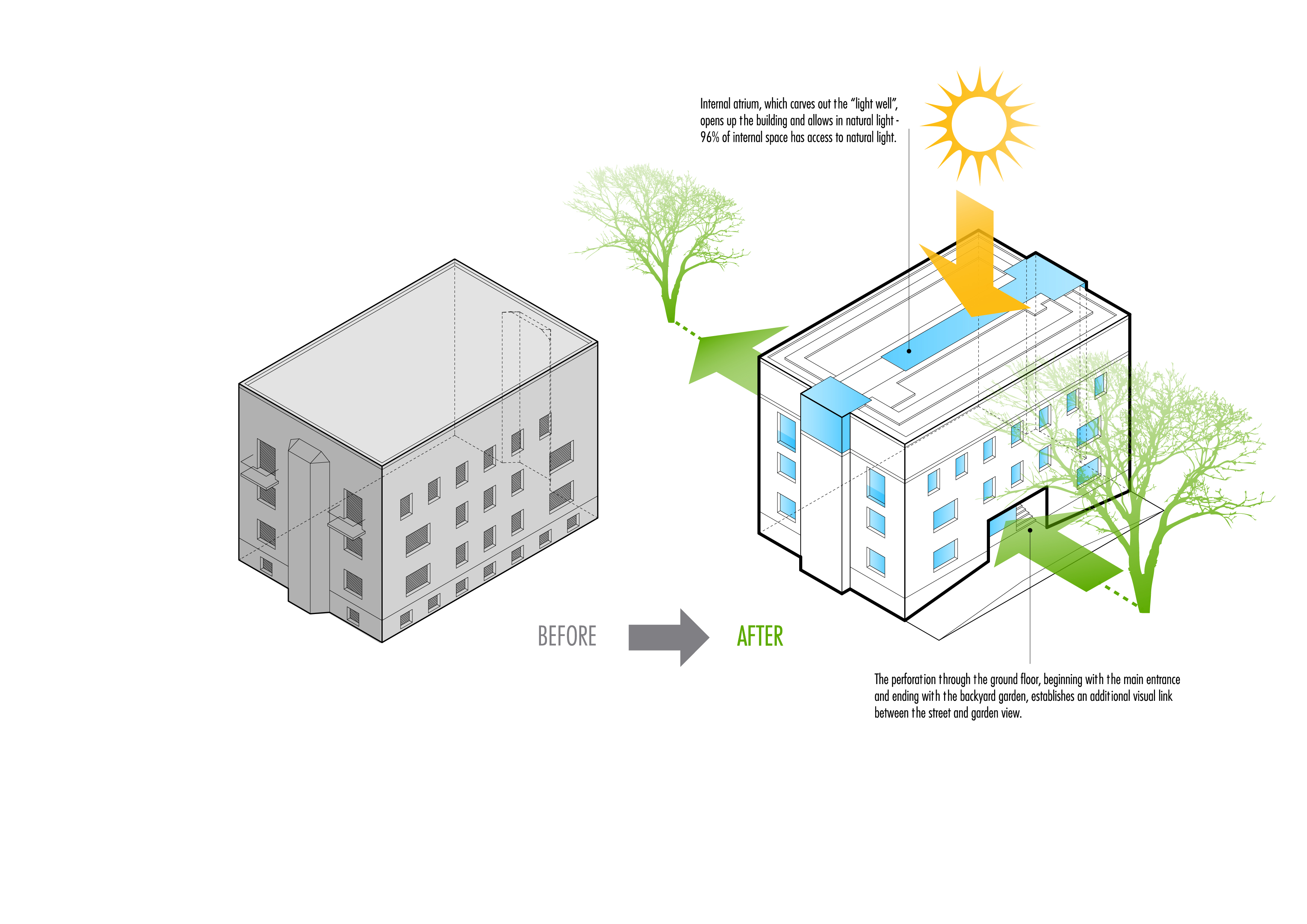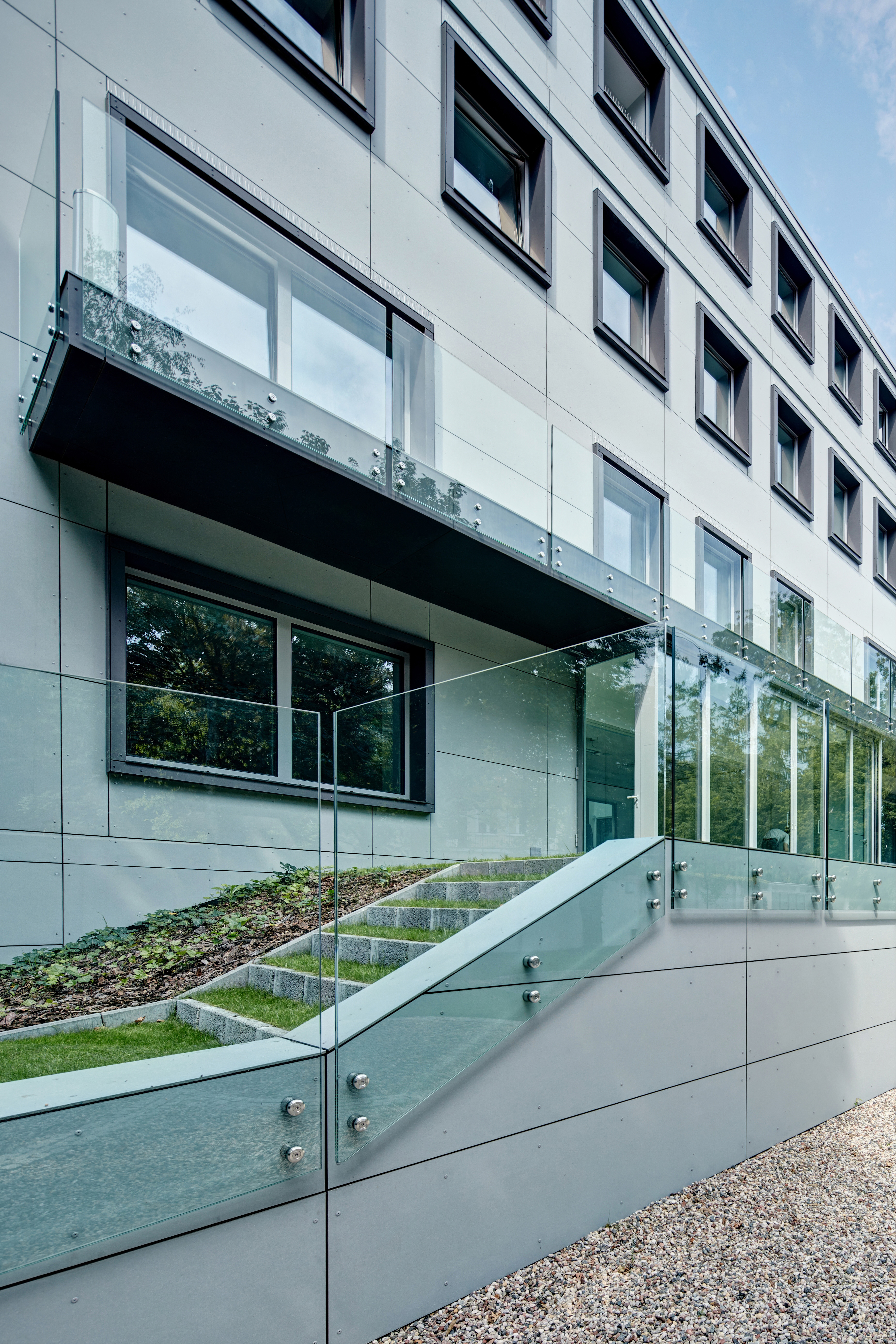 Cieľom projektu bolo vytvoriť udržateľné a moderné kancelárske priestory, pričom bolo nutné zachovať charakter pôvodnej budovy z roku 1933. Napriek vážnemu poškodeniu následkom bombardovania počas druhej svetovej vojny budova mala aj pred rekonštrukciou architektonické kvality. Podarilo sa zachrániť dôležité a hodnotné prvky budovy ako napríklad schodisko a dlaždice v interiéri, čím sa zachovala historická atmosféra budovy. Podobnú remeselnú kvalitu môžeme obdivovať v starších bytových domoch v Paríži, Amsterdame Bruseli… Lokalita výrazne ovplivnila koncept projektu. Bolo použité maximálne množstvo zelene a pozemok sa otvoril do ulice ako verejný priestor, čo odkazuje na predvojnové usporiadanie štvrte. Citlivo realizované zásahy ako strešné svetlíky a podzemné parkovisko umožnili zmenu funkcie budovy. Architekti však neostali iba pri konvenčných stavebných riešeniach, zavrhli a realizovali v stredoeurópskom kontexte ojedinelú exteriérovú vertikálnu záhradu. Toto riešenie výrazne prispelo k zlepšenej ekologickej bilancii budovy a efektívnemu vodnému hospodárstvu.