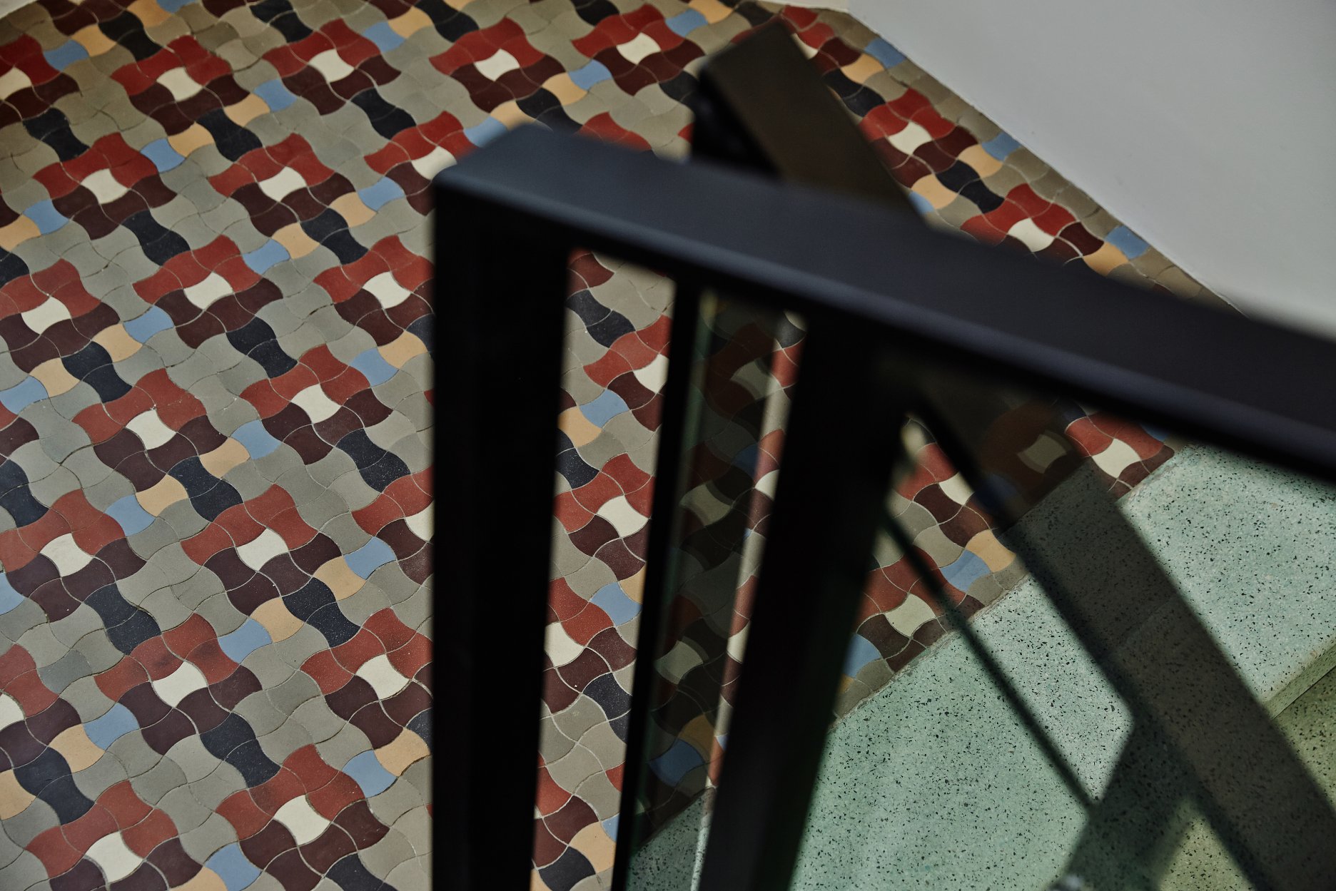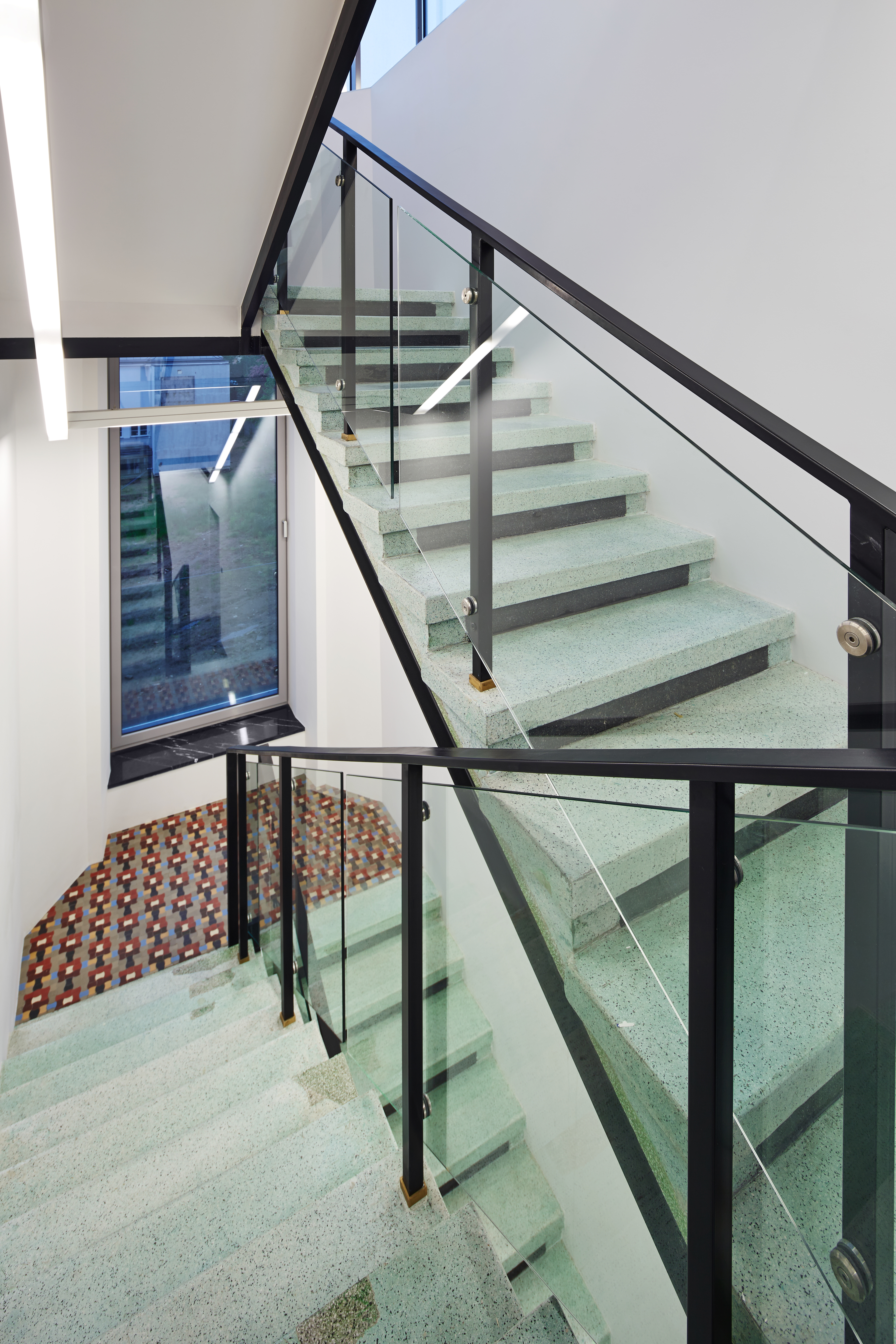 Zachované interiérové schodisko je súčasťou veľmi osobitej architektúry Varšavy 20 a 30 rokov dvadsiateho storočia. Konzolové prefabrikované stupne vyhotovené zo zeleného terrazza sú na podestách doplnené charakteristickými jemnými kachličkami. Podlahy zdobené týmito špecifivckými farebnými kachličkami možno nájsť v predvojnových budovách po celej Európe, vrátane Amsterdamu, Paríža a Bruselu. Schodisko bolo doplnené novotvarom zábradlia. Zábradlie tvoria prvky z na čierno natretej oceľe a skla, pričom oceľové časti slúžia aj ako dodatočná výstuž schodiska. Nosné sú najmä prvky nachádzajúce sa pod originálnymi stupňami