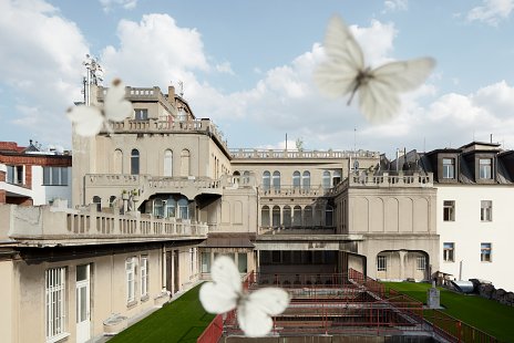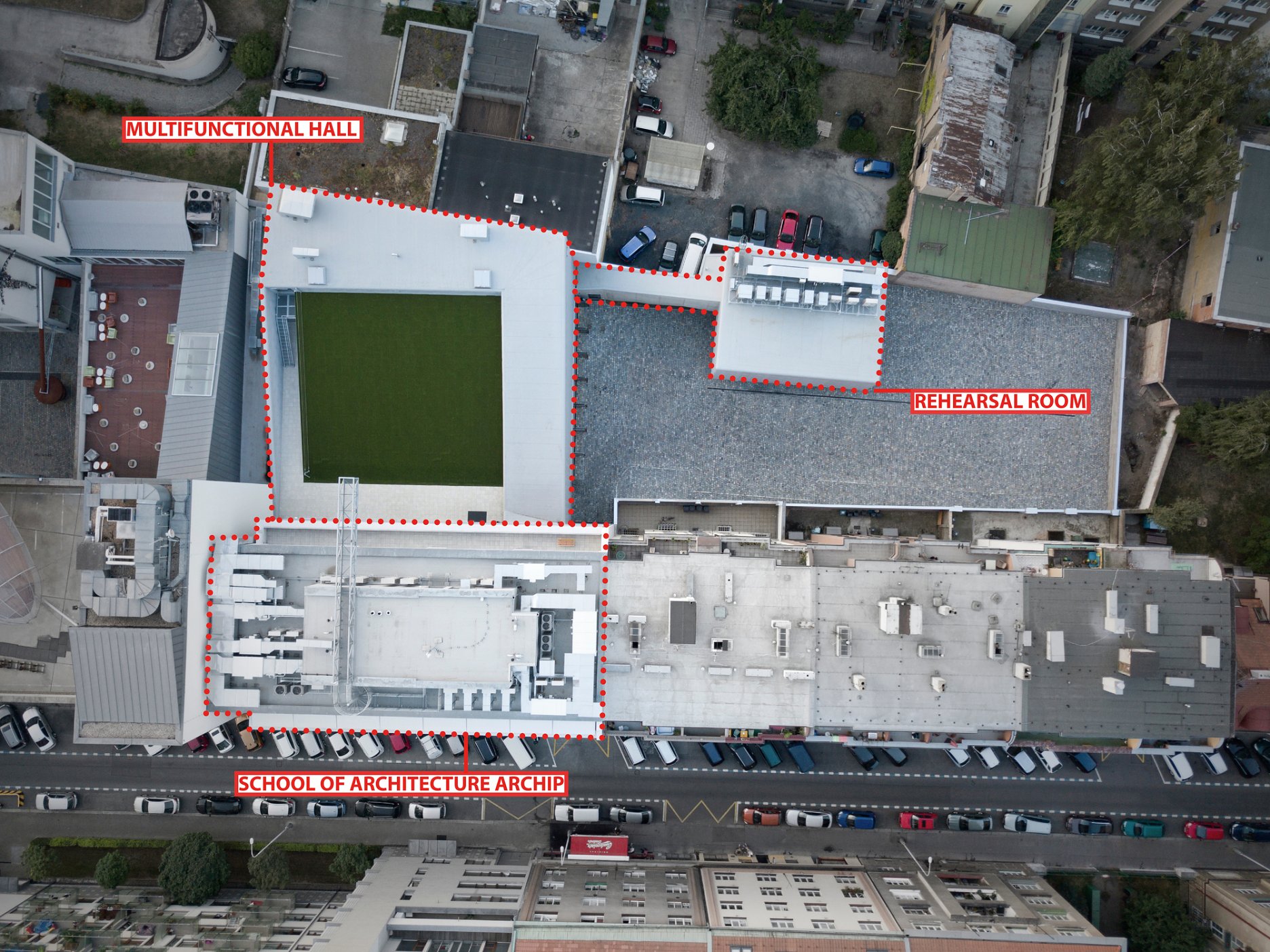 Na streche sály sa nachádza “zelená lúka”, ktorá v letných mesiacoch slúži ako miesto pre relax, vonkajšie inštalácie alebo ako hľadisko vonkajších predstavení. Nad exteriérovým hľadiskom je umiestnená vysutá lávka pre akrobatický tanec.