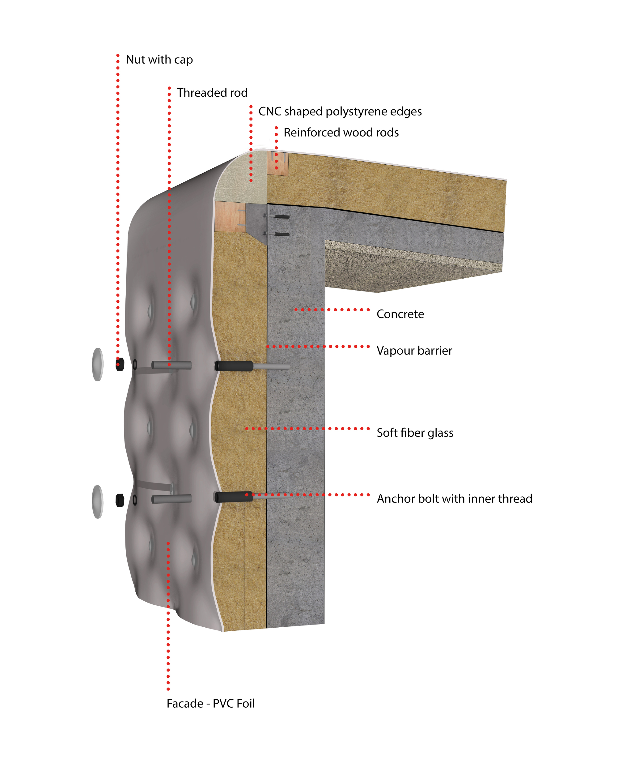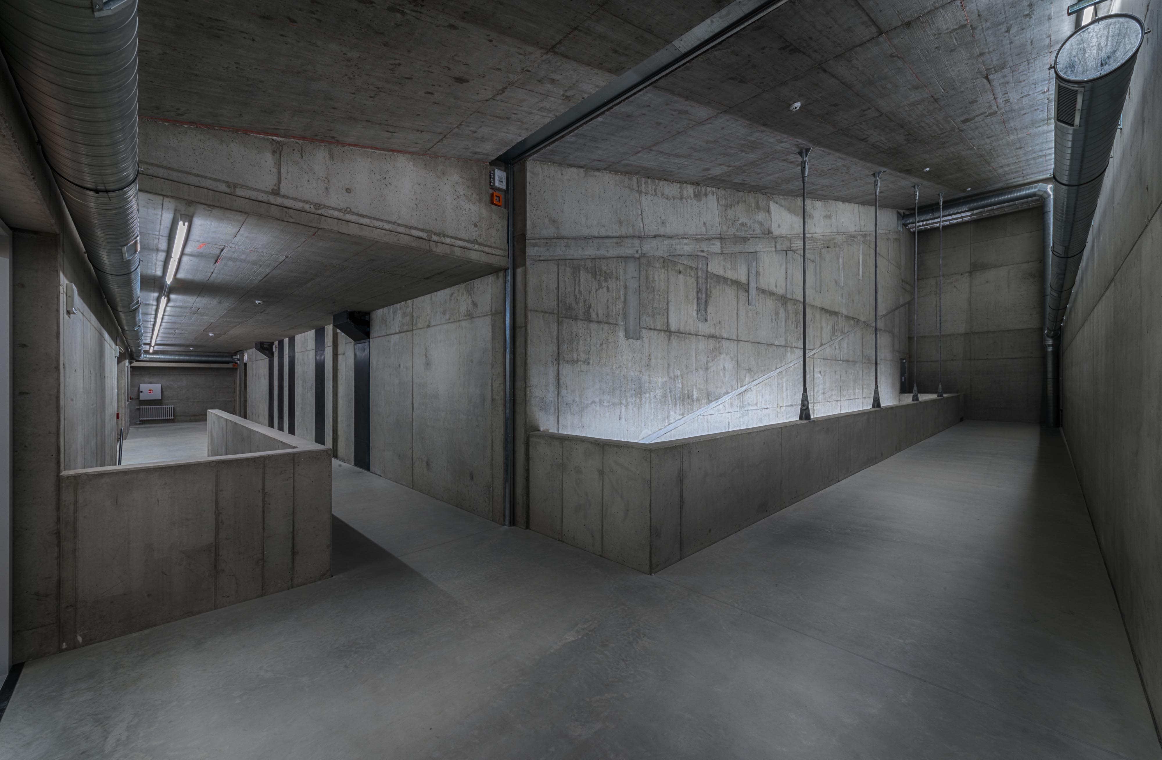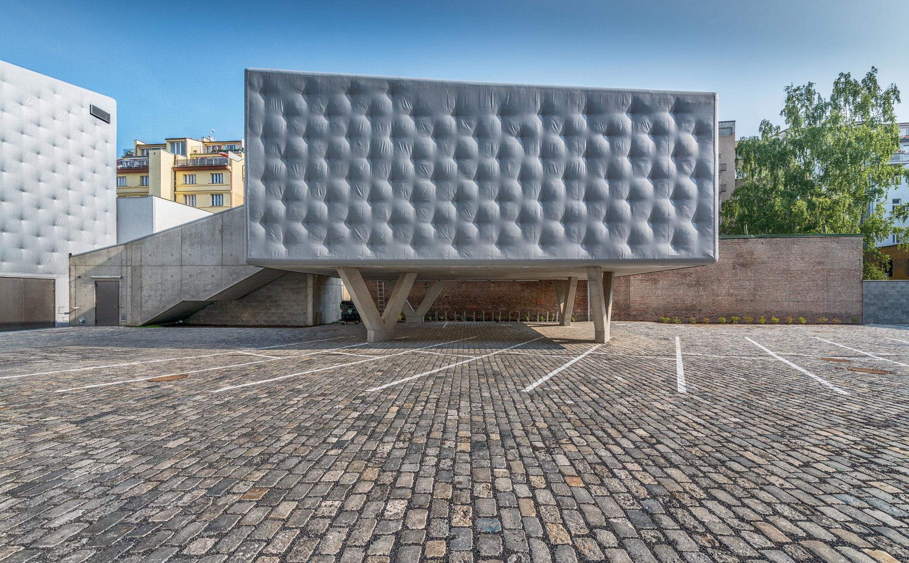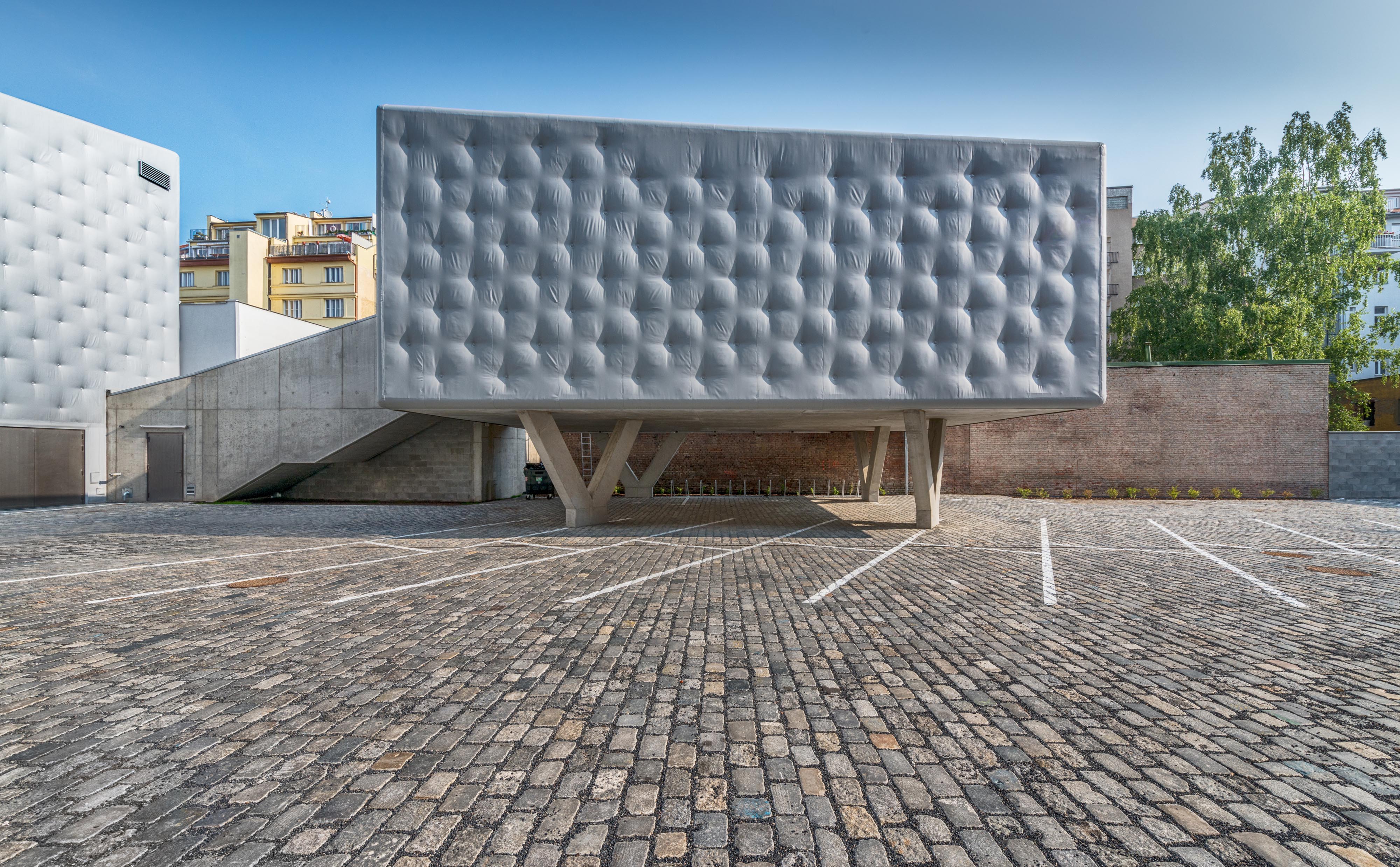 Experimentálna hudobná a tanečná sála a tanečná skúšobňa sú odliate z pohľadového betónu. Monolitické železobetónové objekty sú "oblečené" do mäkkej fasády. Minerálna vlna je potiahnutá PVC fóliou, ktorá je v pravidelnom rastri kotvená do betónu. Fasáda podľa slov architekta efektívne pohlcuje hluk vychádzajúci zo sály a znižuje akustickú záťaž obytného dvora. Uplatnenie vzoru pripomínajúceho čalúnený nábytok bolo zvolené vzhľadom na jeho účinnosť pri rozložení ťahových síl na povrchu fólie. Ani pri silných mrazoch nedochádza ku kritickému napätiu pri zmrštení fólie, alebo naopak, pri vysokých povrchových teplotách k strate predpätia.
