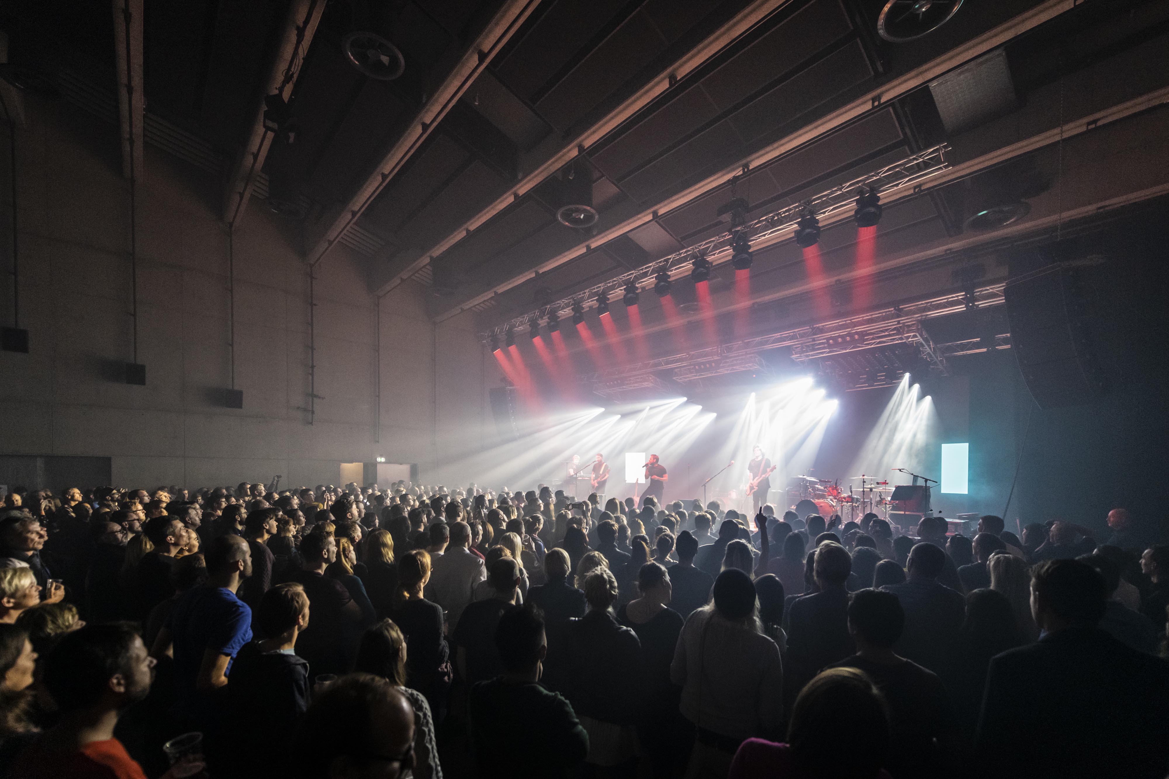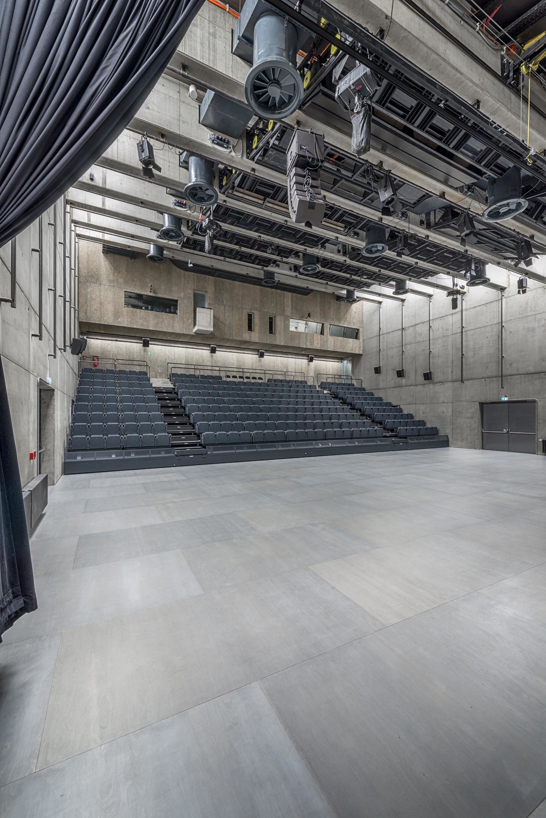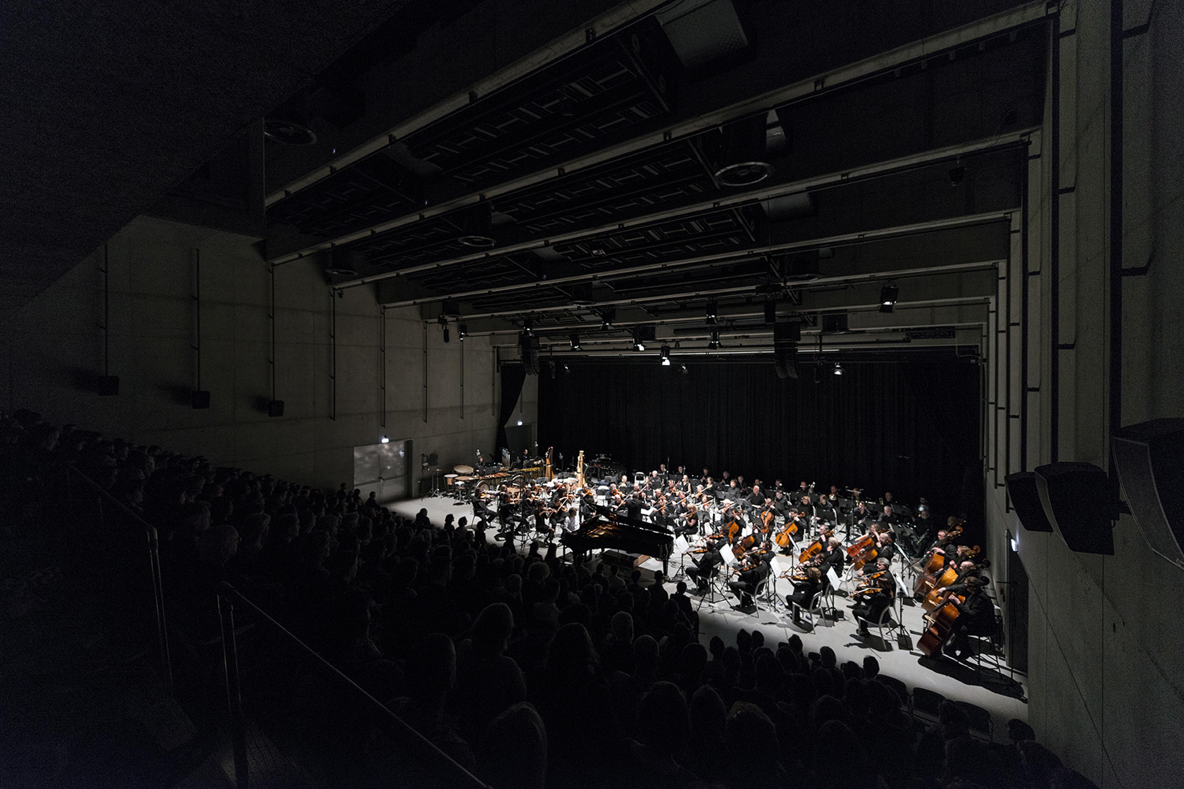 “Sál má proměnou akustiku a lze jej tak připodobnit k hudebnímu nástroji, který je možné zvukově vyladit dle potřeby konkrétní produkce,” vysvetľuje architekt. Na tento účel slúžia otočné, akustické trojhranné stropné panely a foyer slúžiaci ako dozvuková komora. Každá zo strán stropného panelu má povrch s rozdielnymi akustickými vlastnosťami. Otočením trojhranného prvku je možné voliť medzi reflexným, difúznym alebo akusticky pohltivým povrchom. Korekcia akustických vlastností stropu dokáže výrazne ovplyvniť akustické parametre celej sály. Hlavnú sálu obklopuje prstenec foyer, ktorý je možné v prípade špeciálnych predstavení využiť ako dozvukové komory. Pridaním týchto priestorov k objemu hlavnej sály dôjde k výraznému predĺženiu doby dozvuku predovšetkým v pásme nízkych frekvencií. Vďaka štvorcovému pôdorysu nebolo nutné steny obkladať akustickými obkladmi. Sála s kapacitou päťsto divákov stihla už počas svojej krátkej prevádzky preukázať svoje akustické kvality. V súčasnej dobe je využívaná aj ako referenčné nahrávacie štúdio.