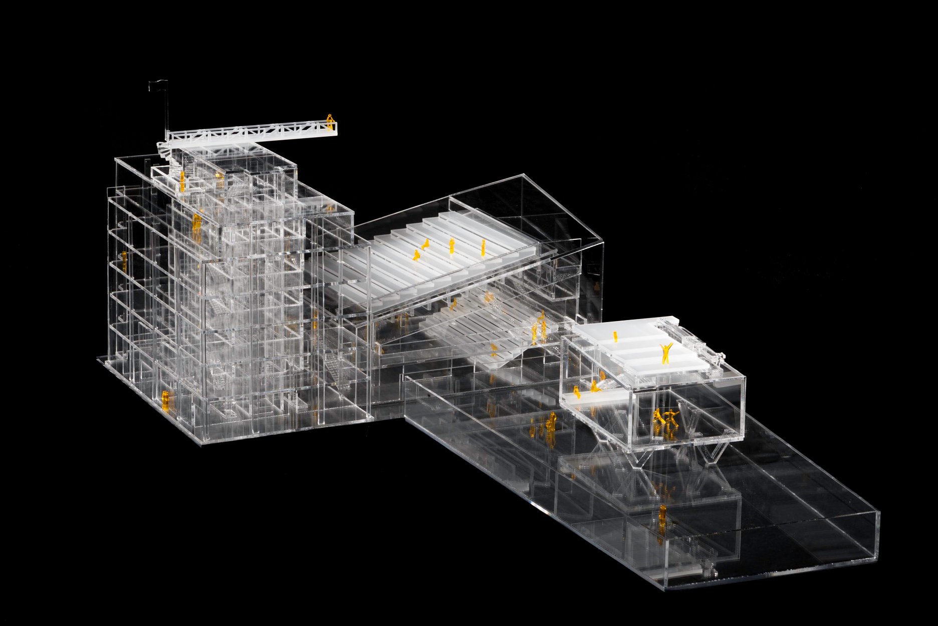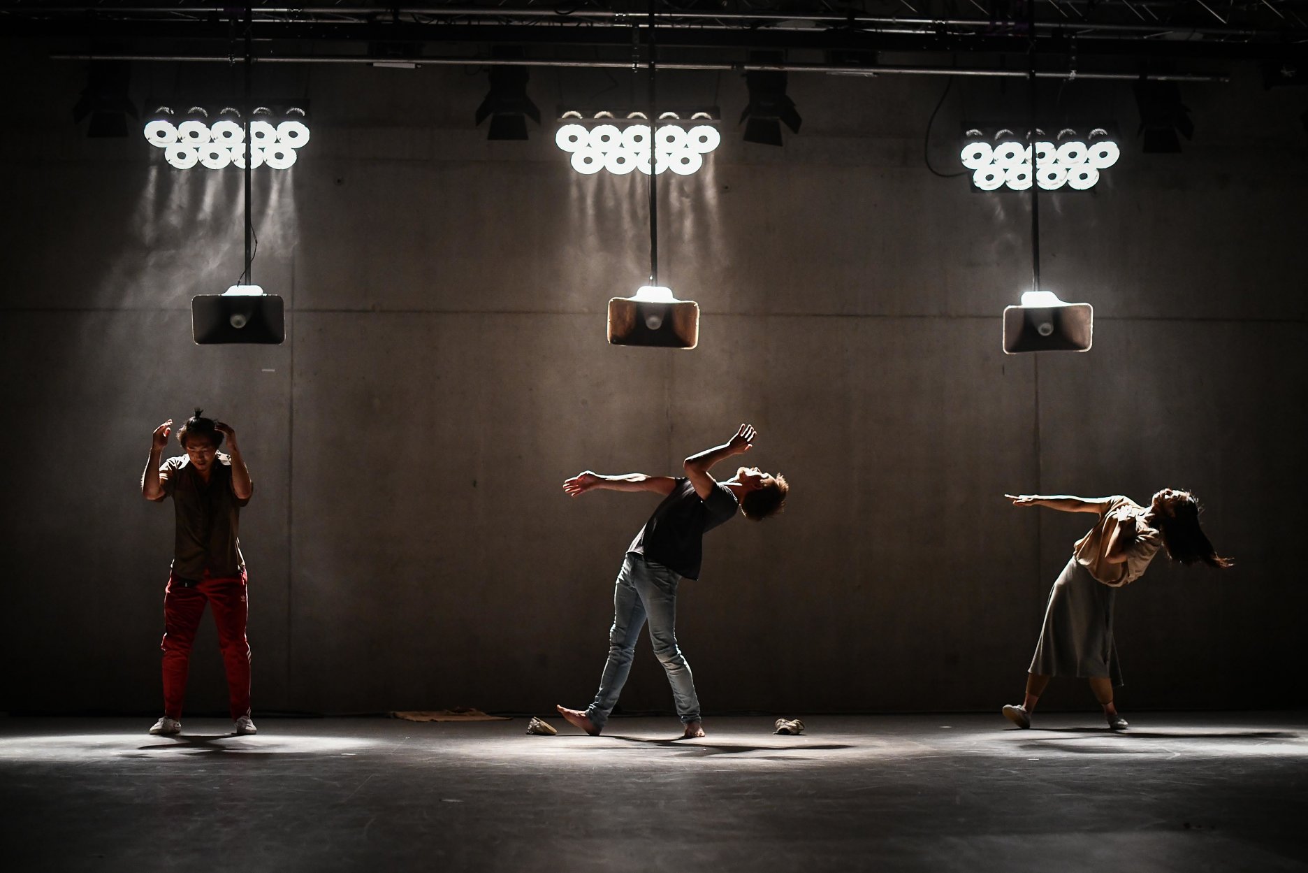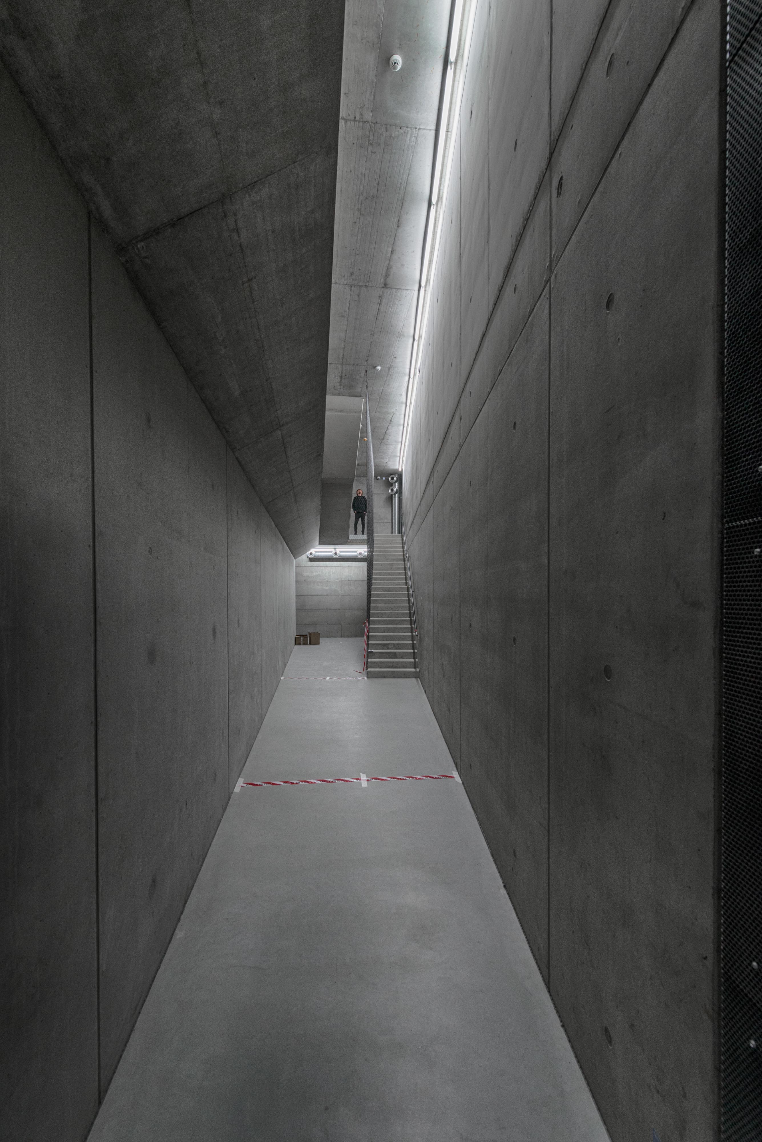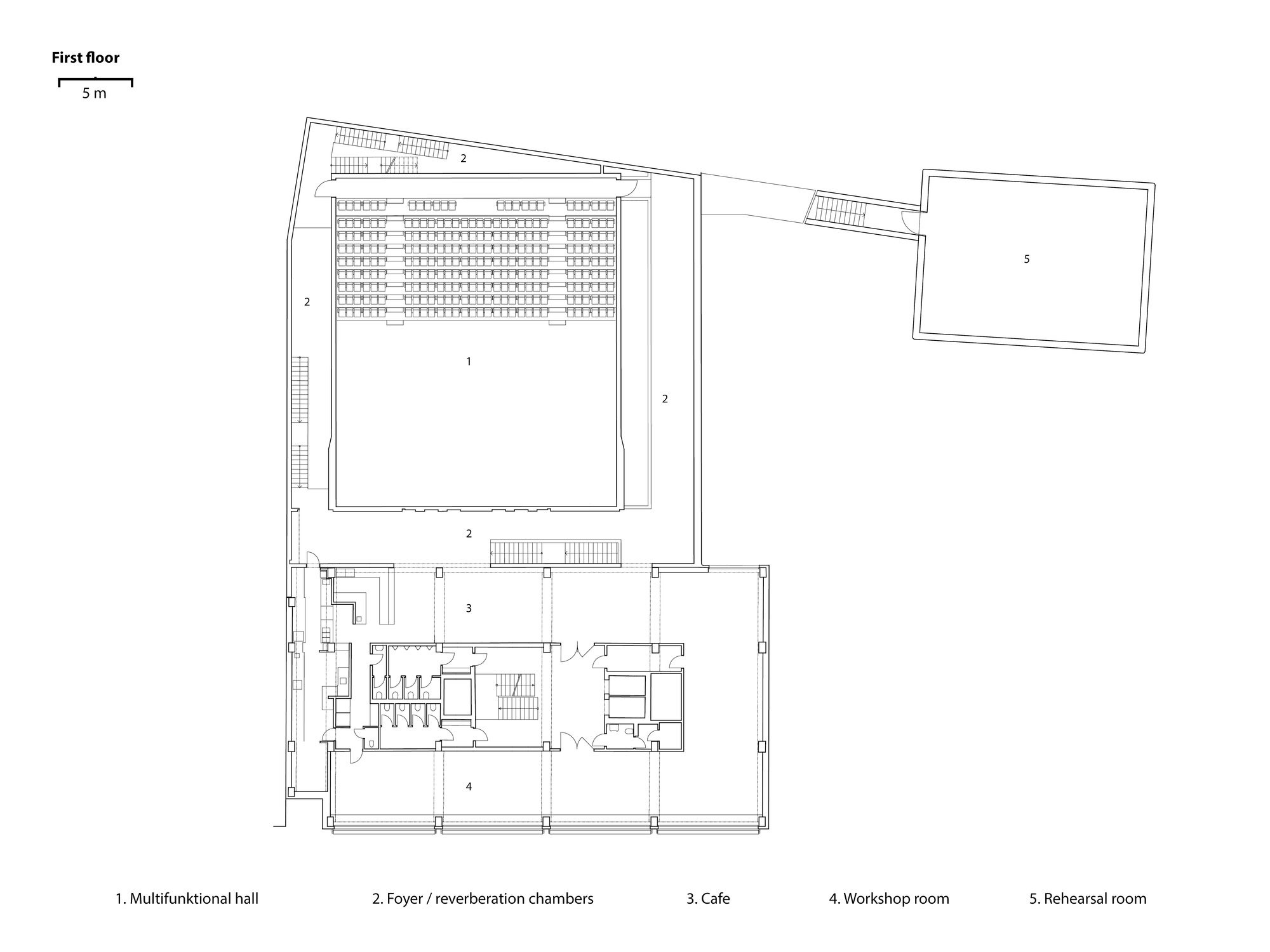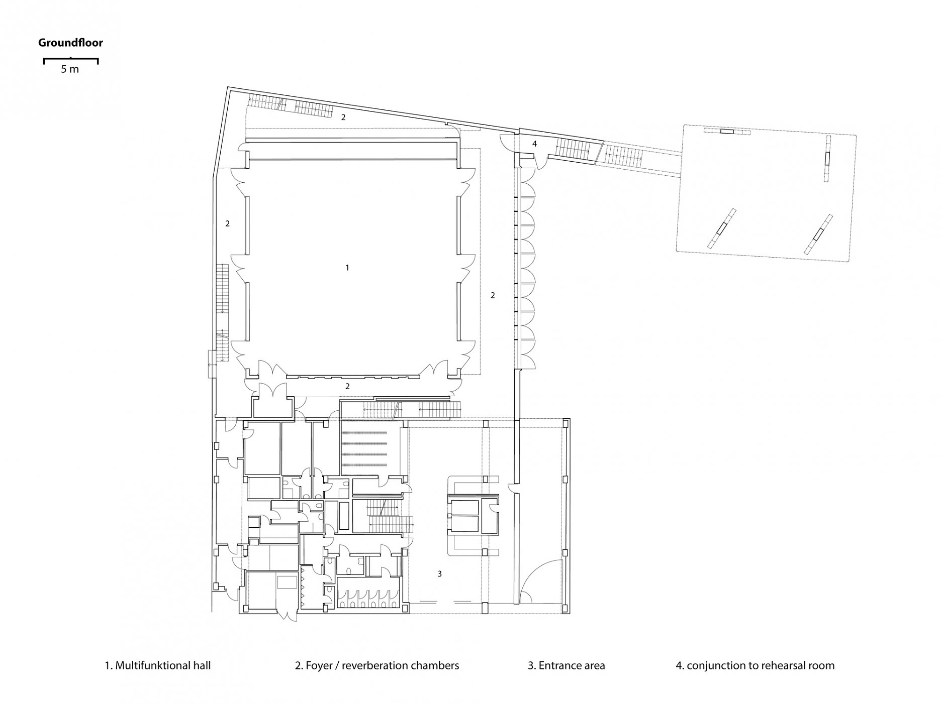 Tanečná skúšobňa má pôdorys zhodný s rozmermi javiska hlavnej sály. Nad vnútorným dvorom "tancuje" na šikmých stĺpoch. Ich geometria nie je náhodná, vyhýba sa kolíznym prevádzkovým uzlom a technickým inštaláciám pod dlažbou.