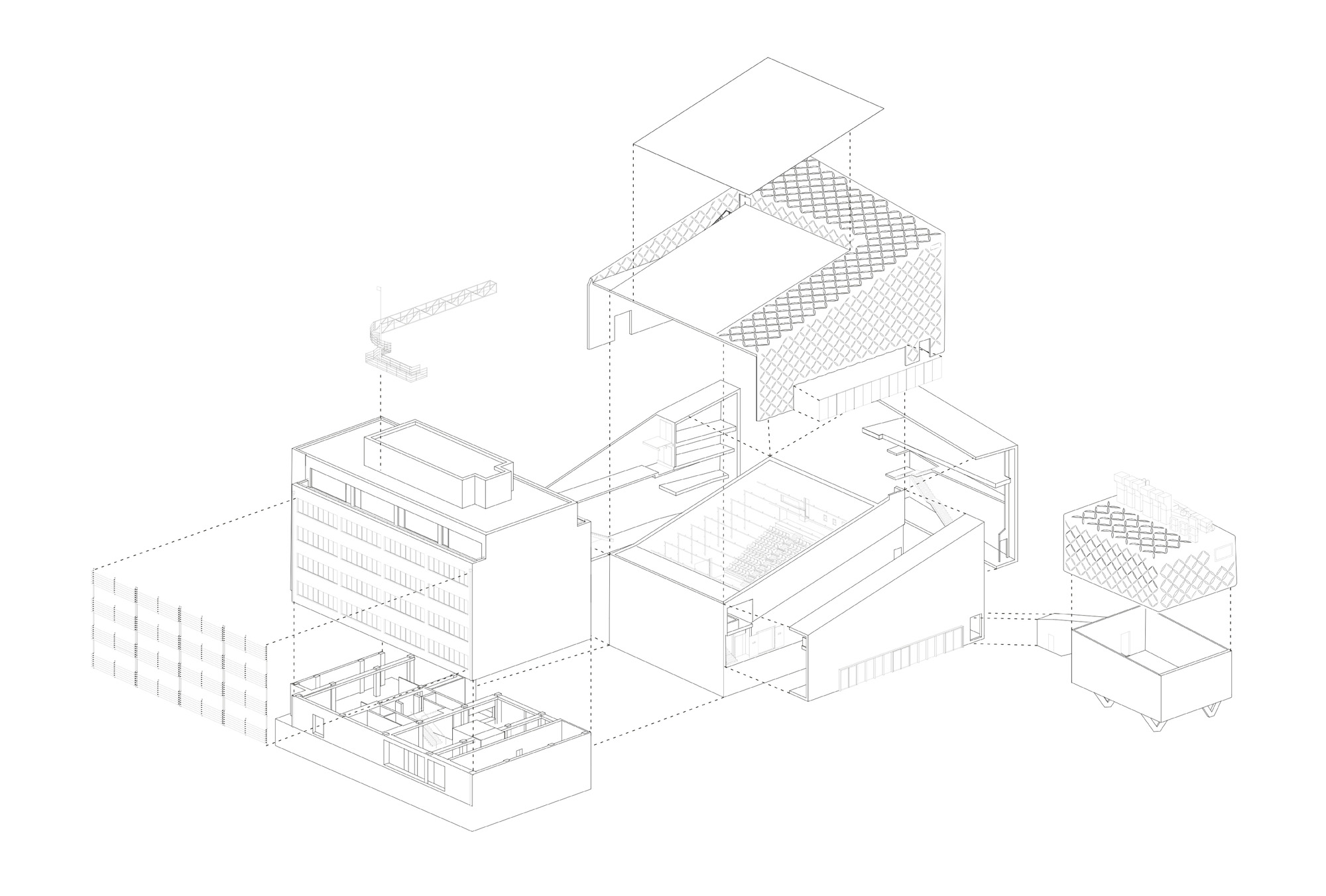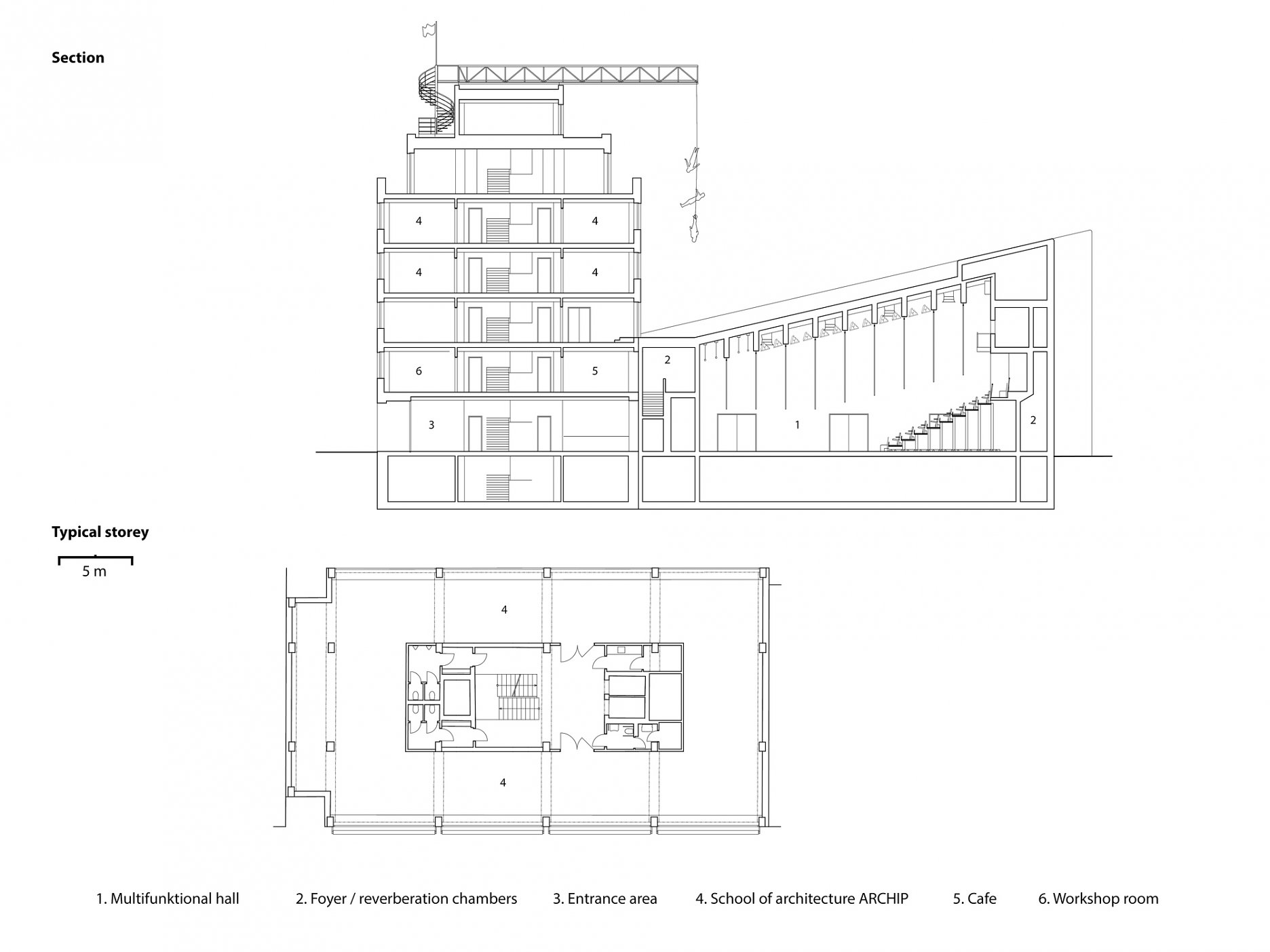 Administratívna časť so vstupnými priestormi, klubom a reštauráciou slúži zo svojej väčšej časti ako škola architektúry Archip. Budova vznikla rekonštrukciou stavby zo 70. rokov minulého storočia. Základné priestorové usporiadanie objektu a voľná dispozícia ostali zachované. Úpravy interiéru rešpektujú v detaile a materiáloch dobu vzniku objektu (linoleum, drevené dyhované dvere, terazzo...).