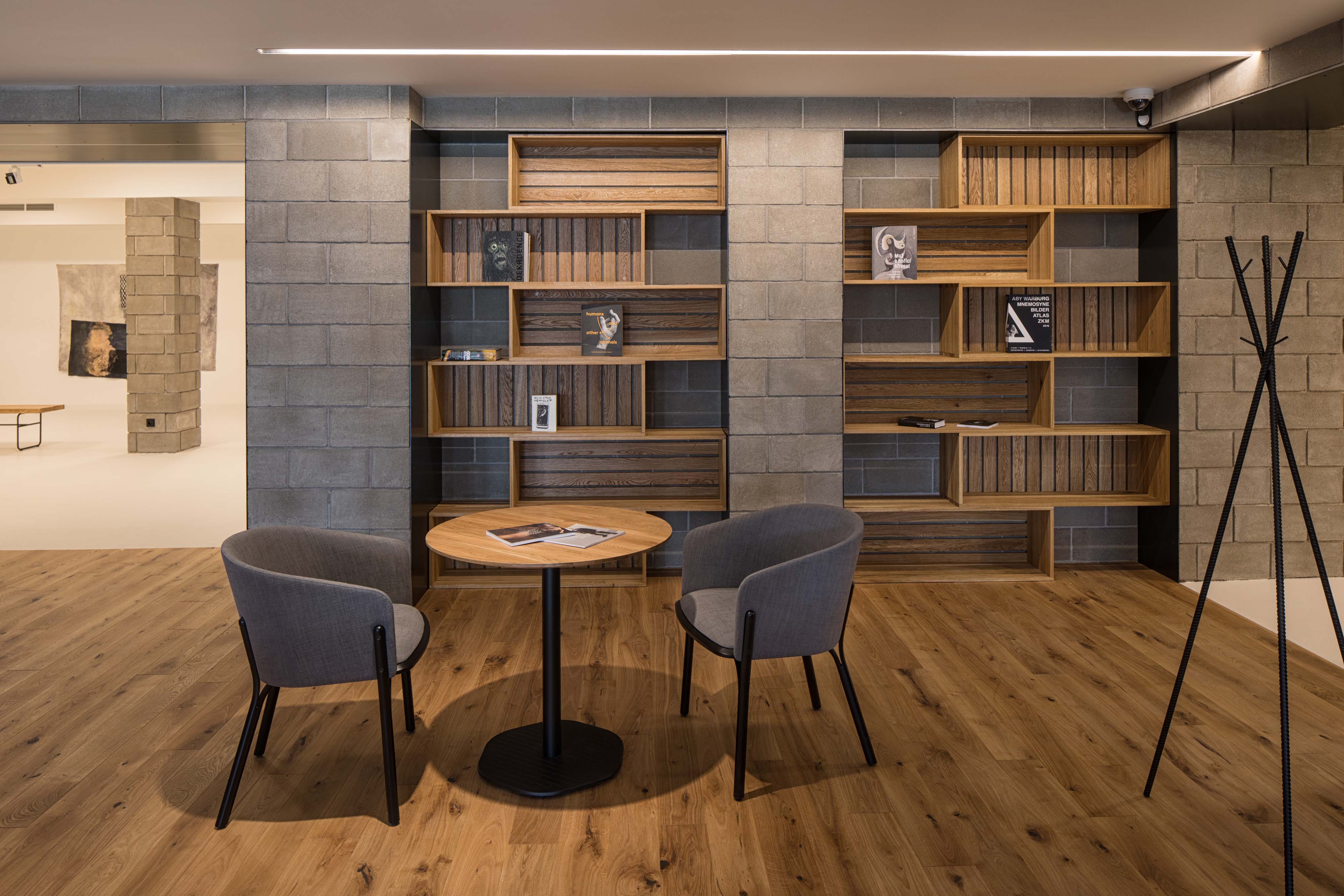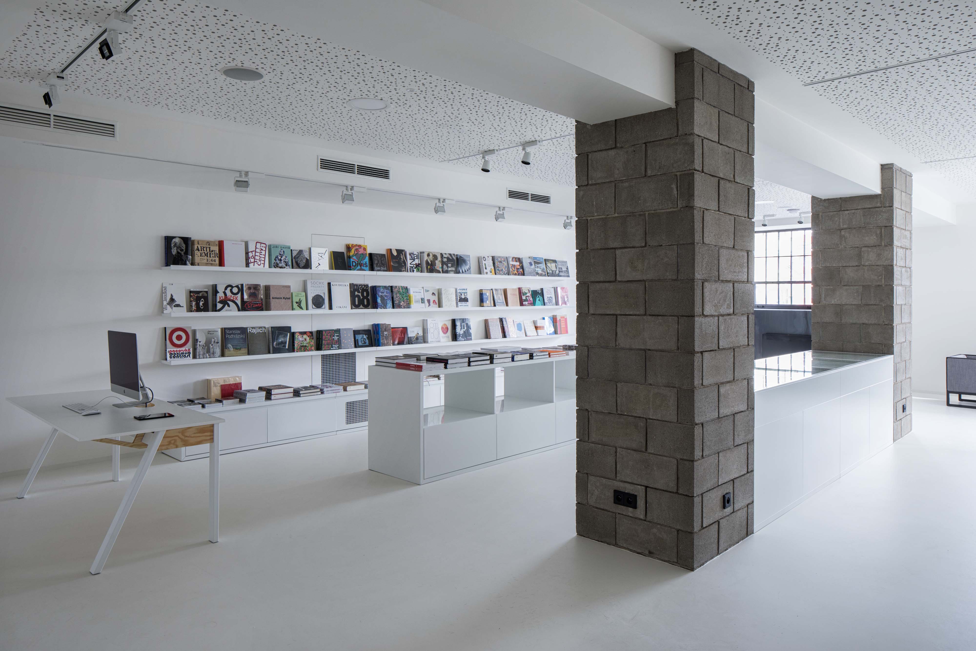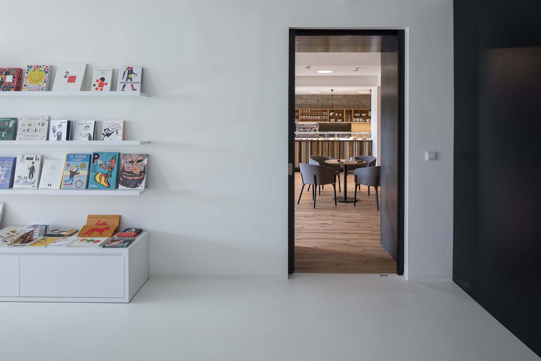 Podlahy prízemných výstavných priestorov, kníhkupectva a auditória zjednotila biela epoxidová stierka. Na prvom poschodí vrátane kaviarne sú použité dubové podlahy.