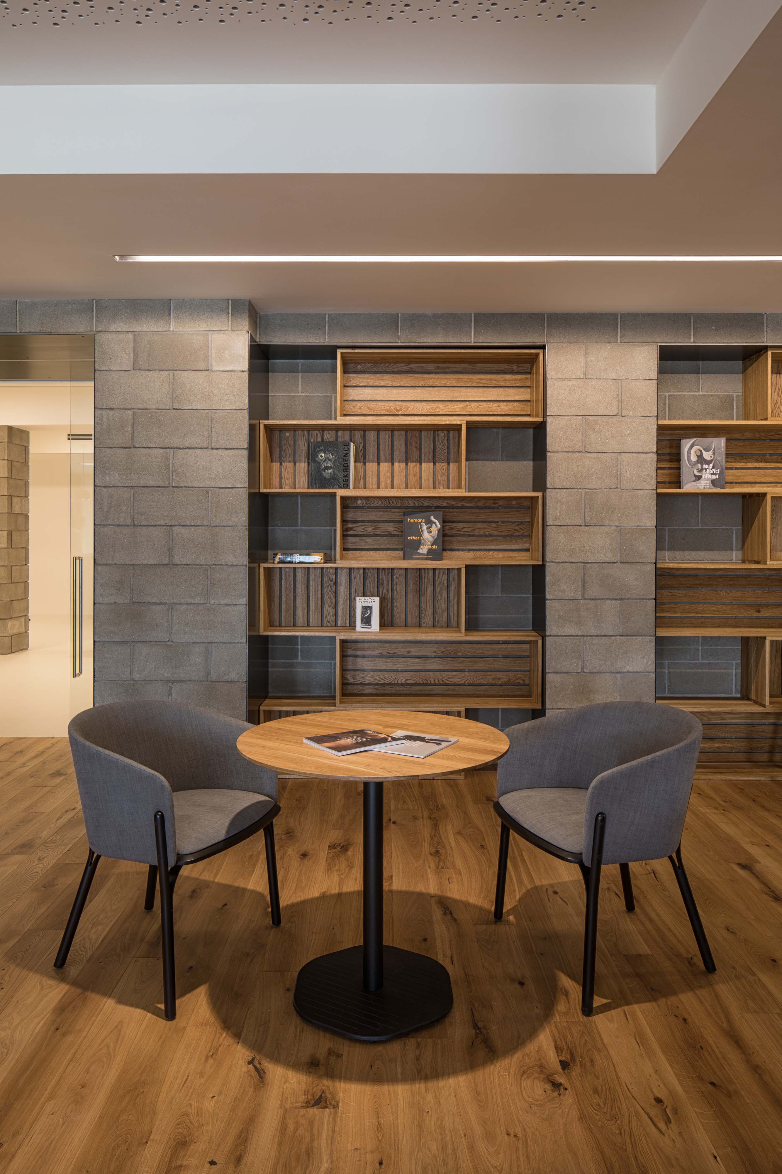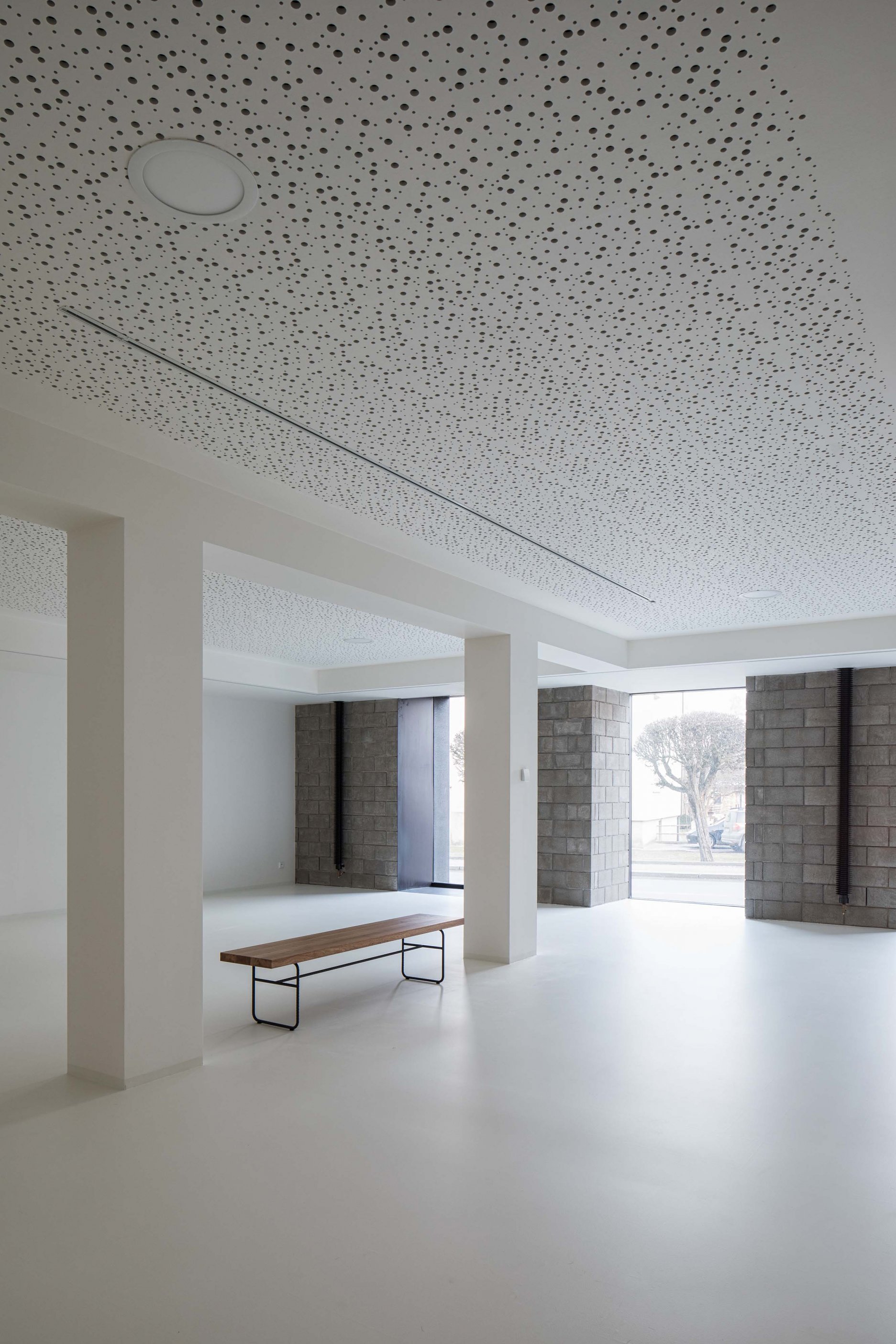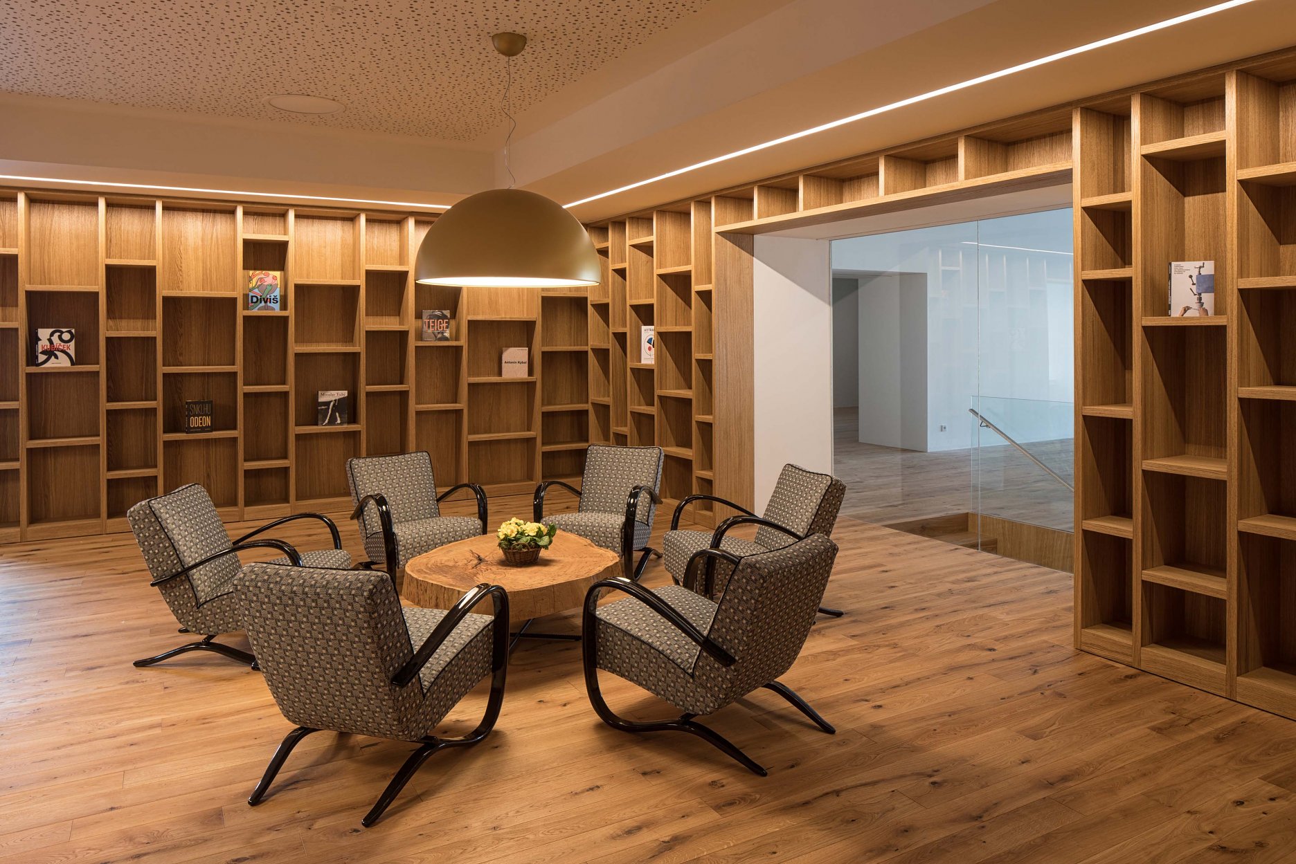 Podlahy prízemných výstavných priestorov, kníhkupectva a auditória zjednotila biela epoxidová stierka. Na prvom poschodí vrátane kaviarne sú použité dubové podlahy.