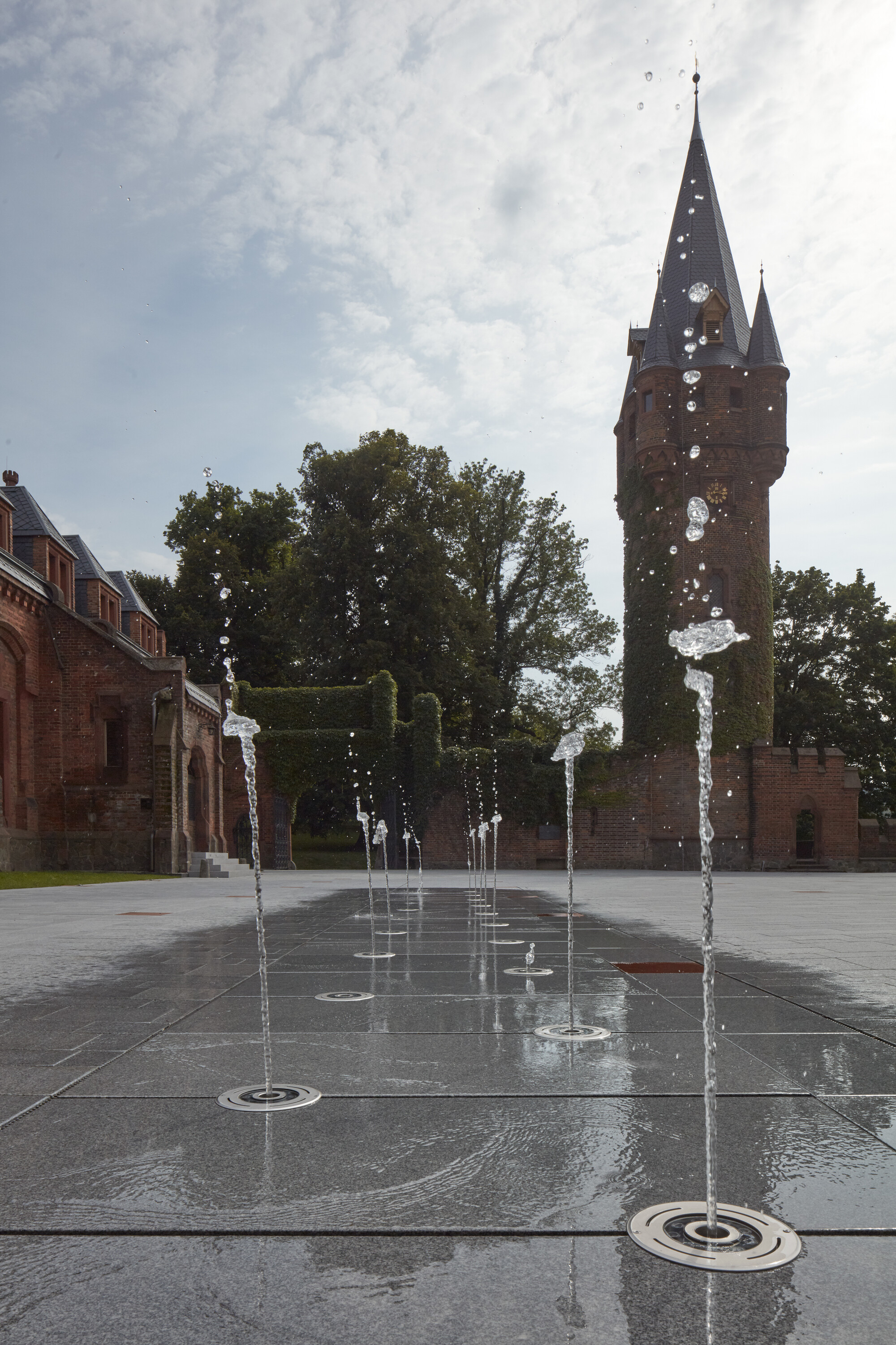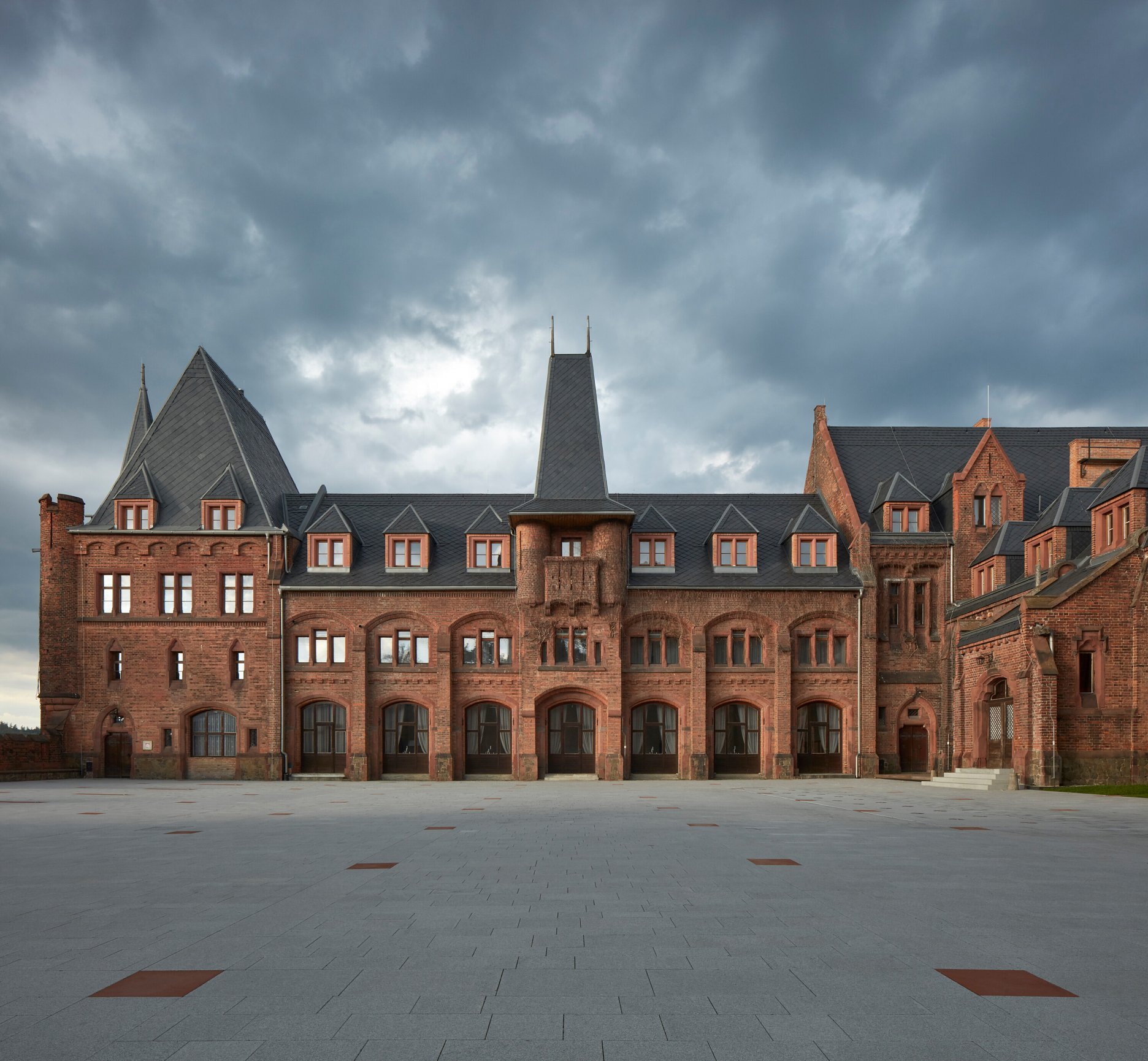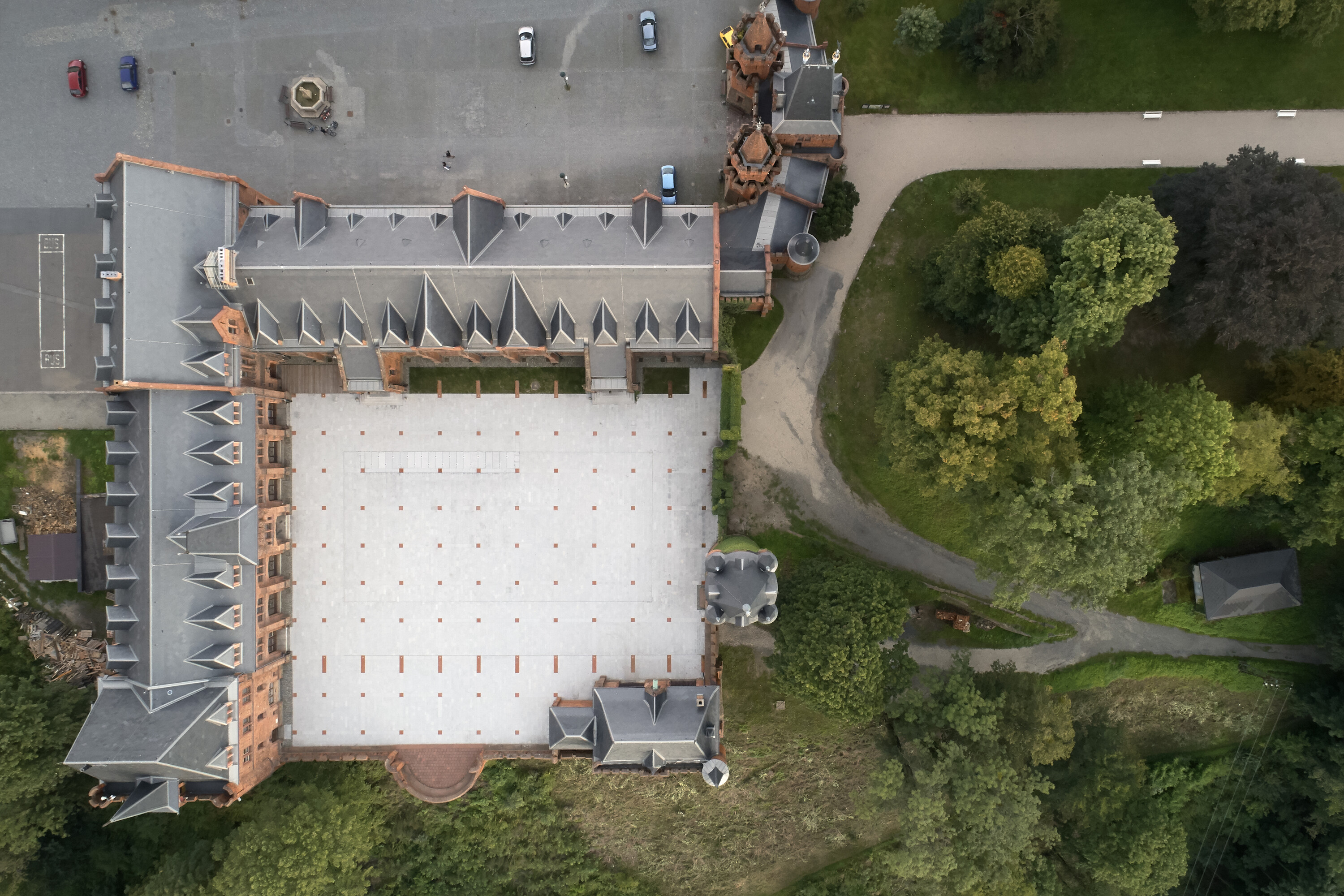 Rekonštrukcia opäť zjednotila nádvorie pre potreby kultúrnych podujatí. Plocha jednotne vydláždená žulovými platňami, tvorí dôstojné pozadie pre romantický výraz Červeného zámku. Predovšetkým v letných mesiacoch zlepšuje klímu na nádvorí fontána so skrytou hladinou.