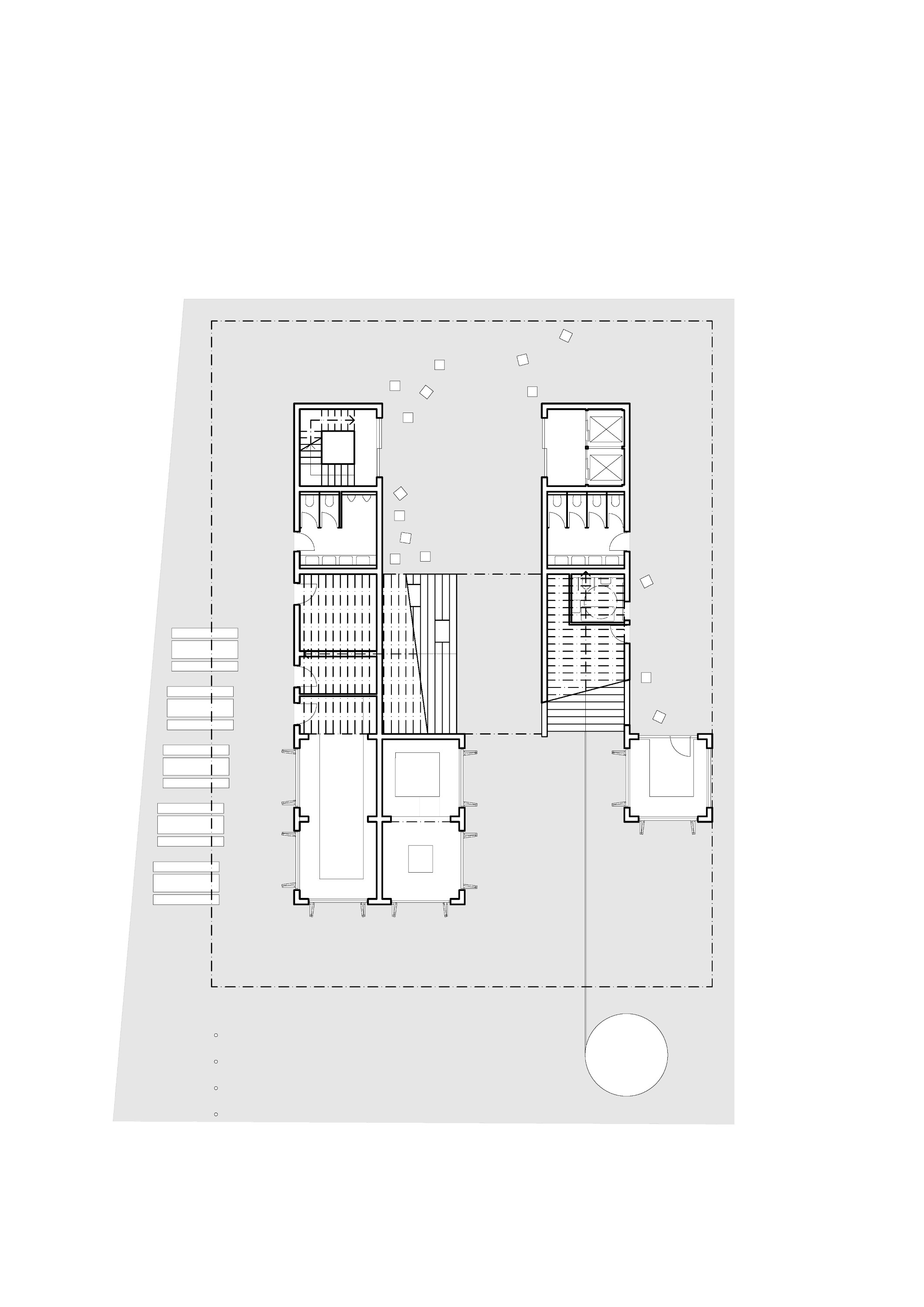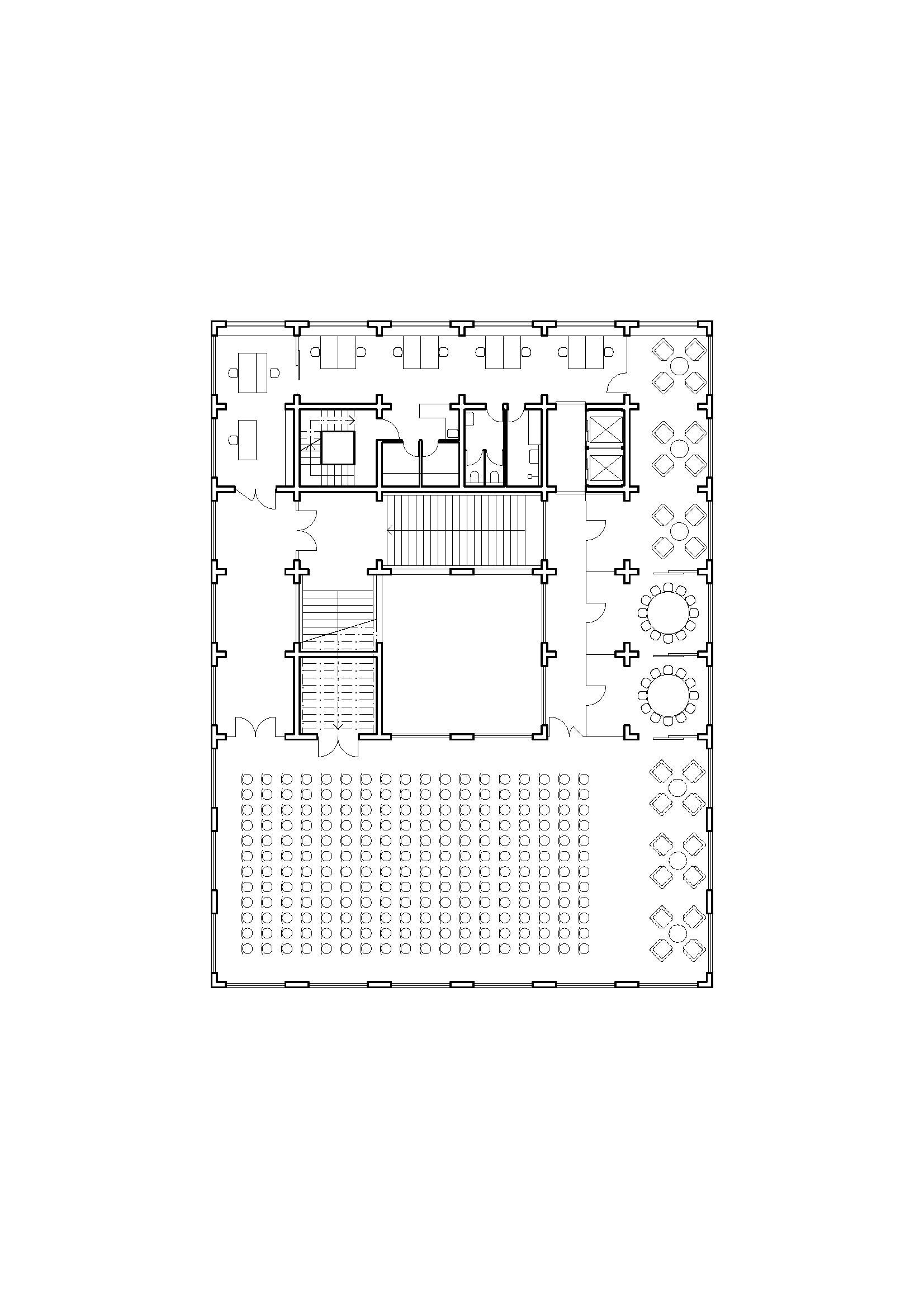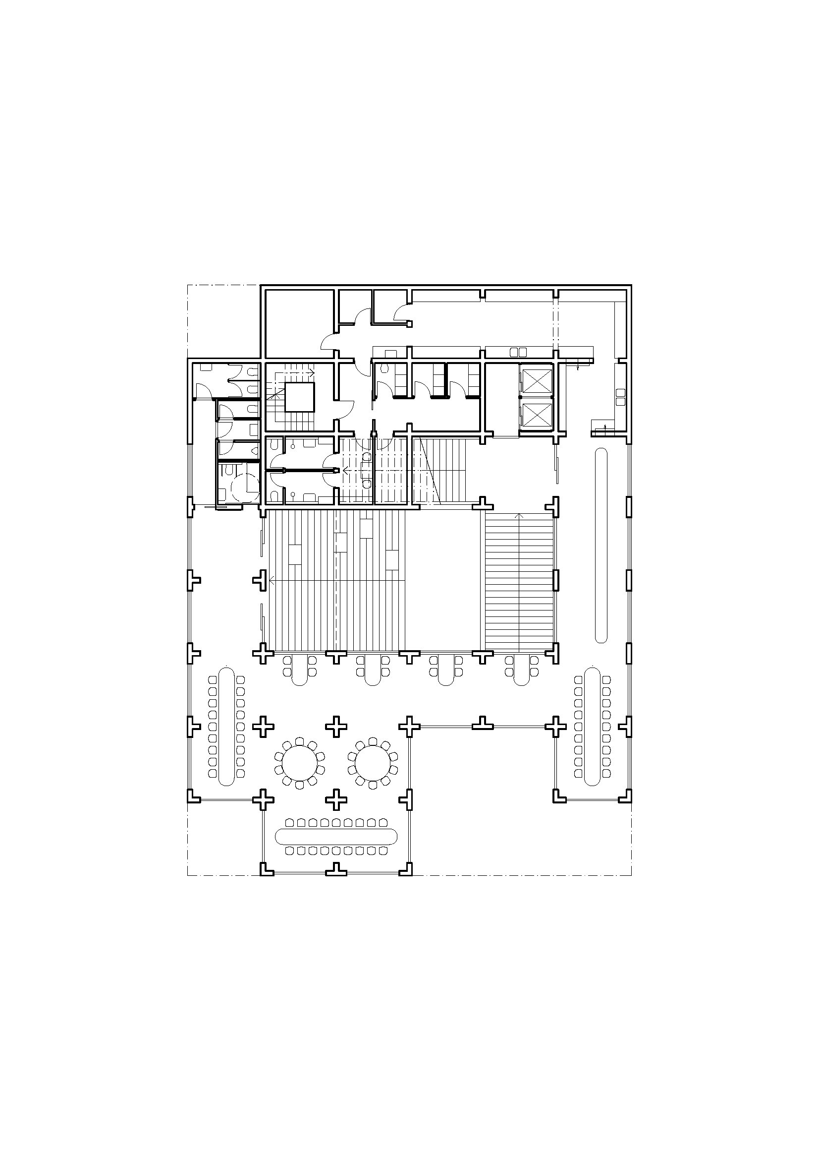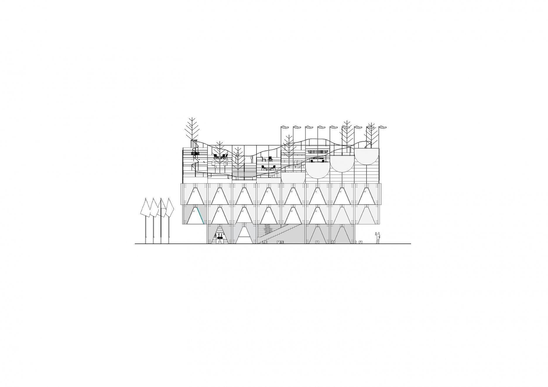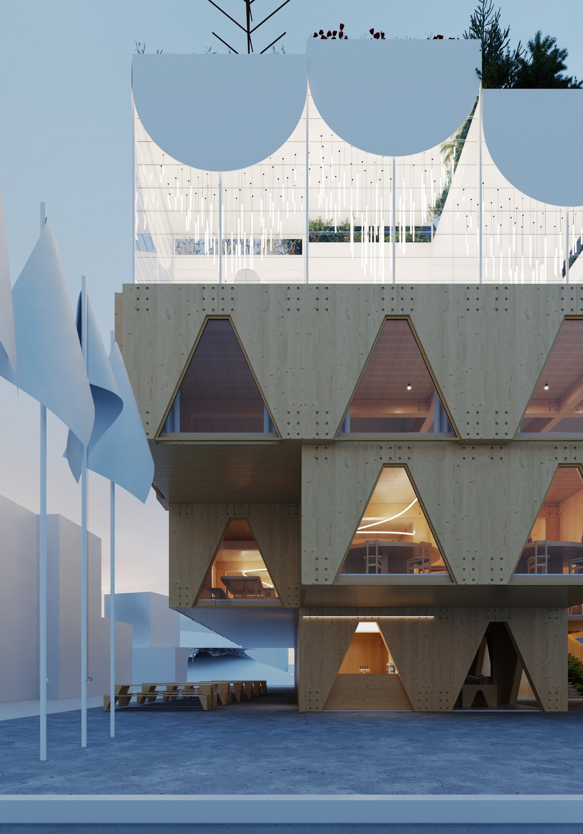 Budova je navržena z kombinace CLT panelů a BSH nosníků, což jasně definuje její materiálovost.