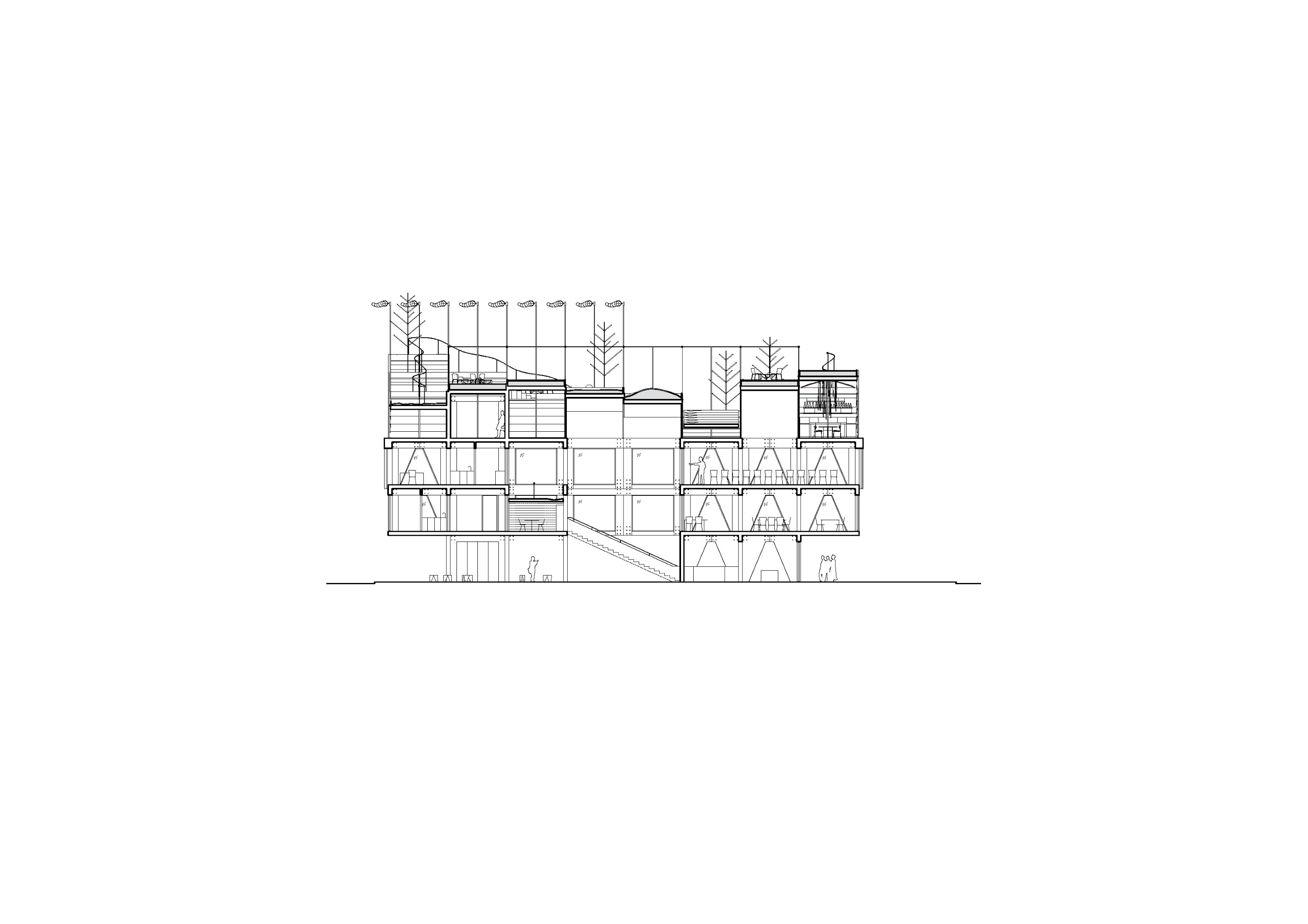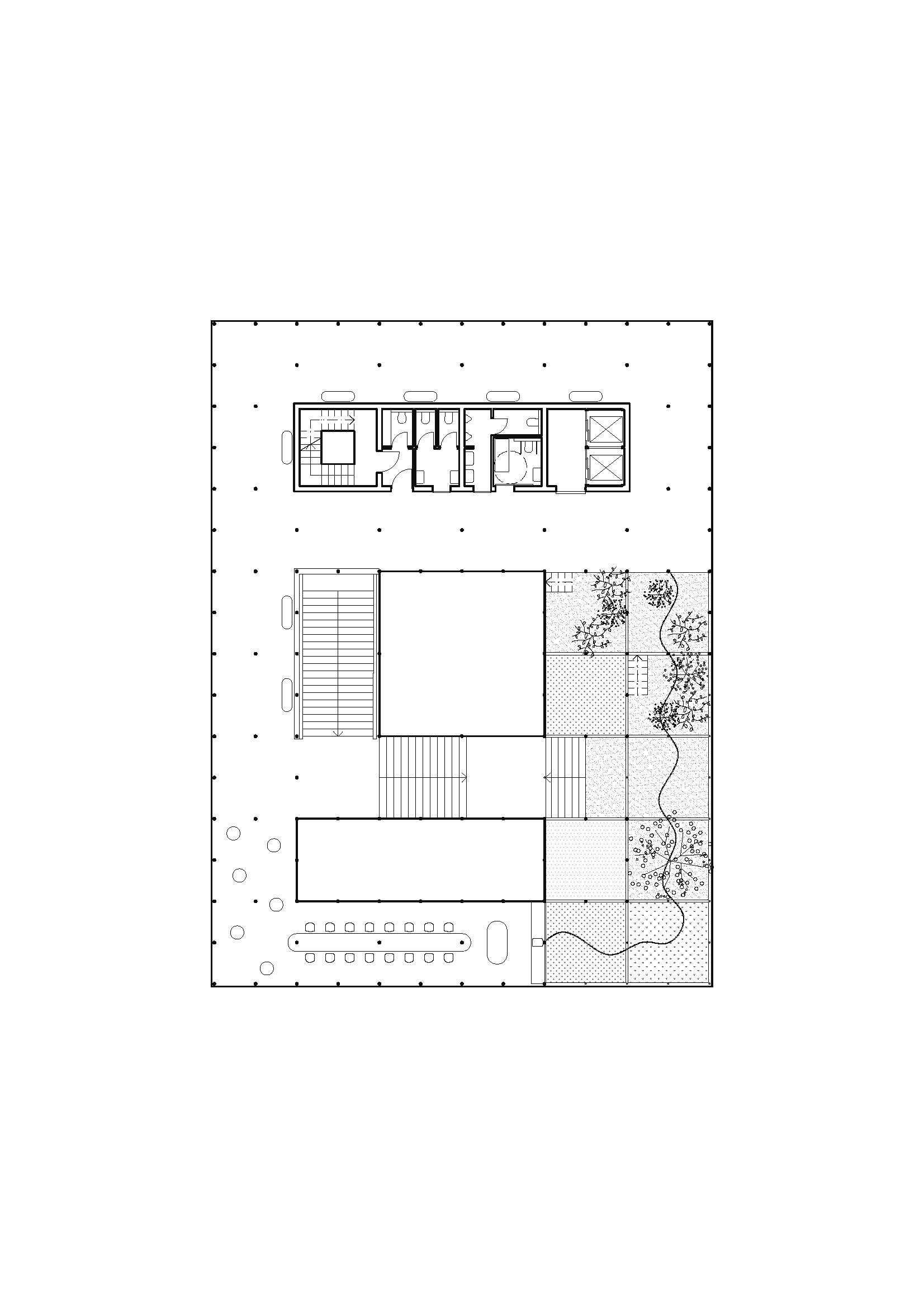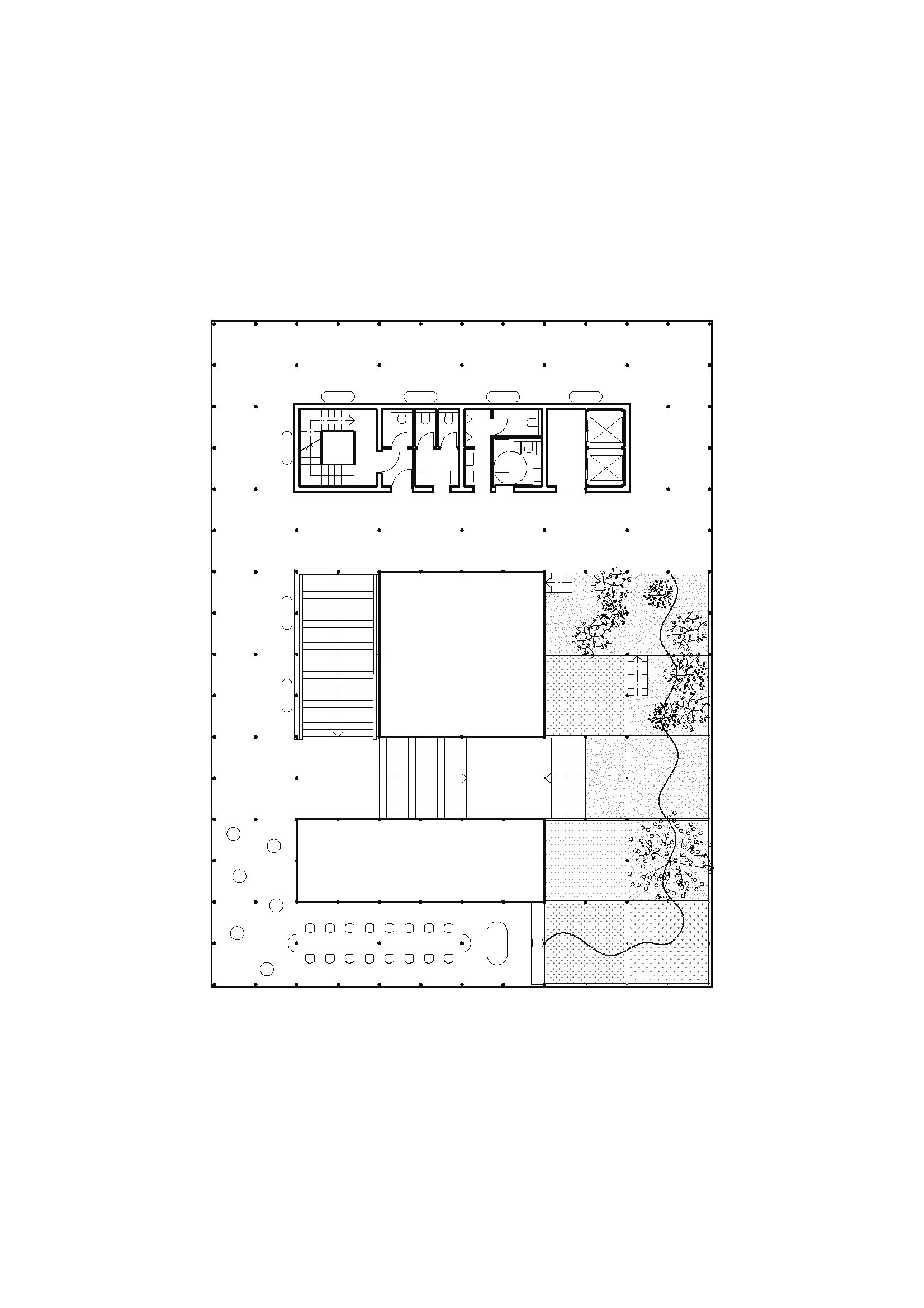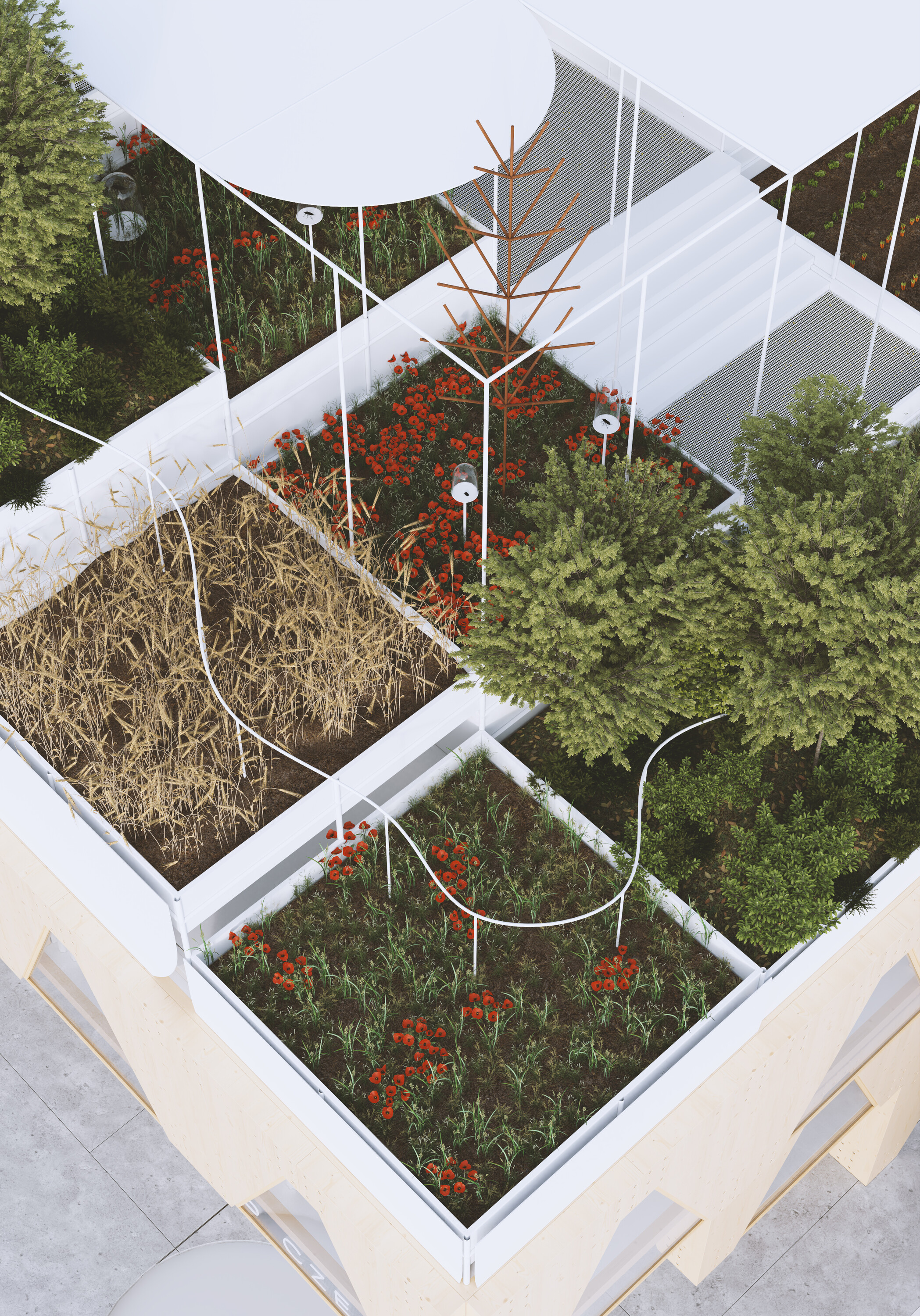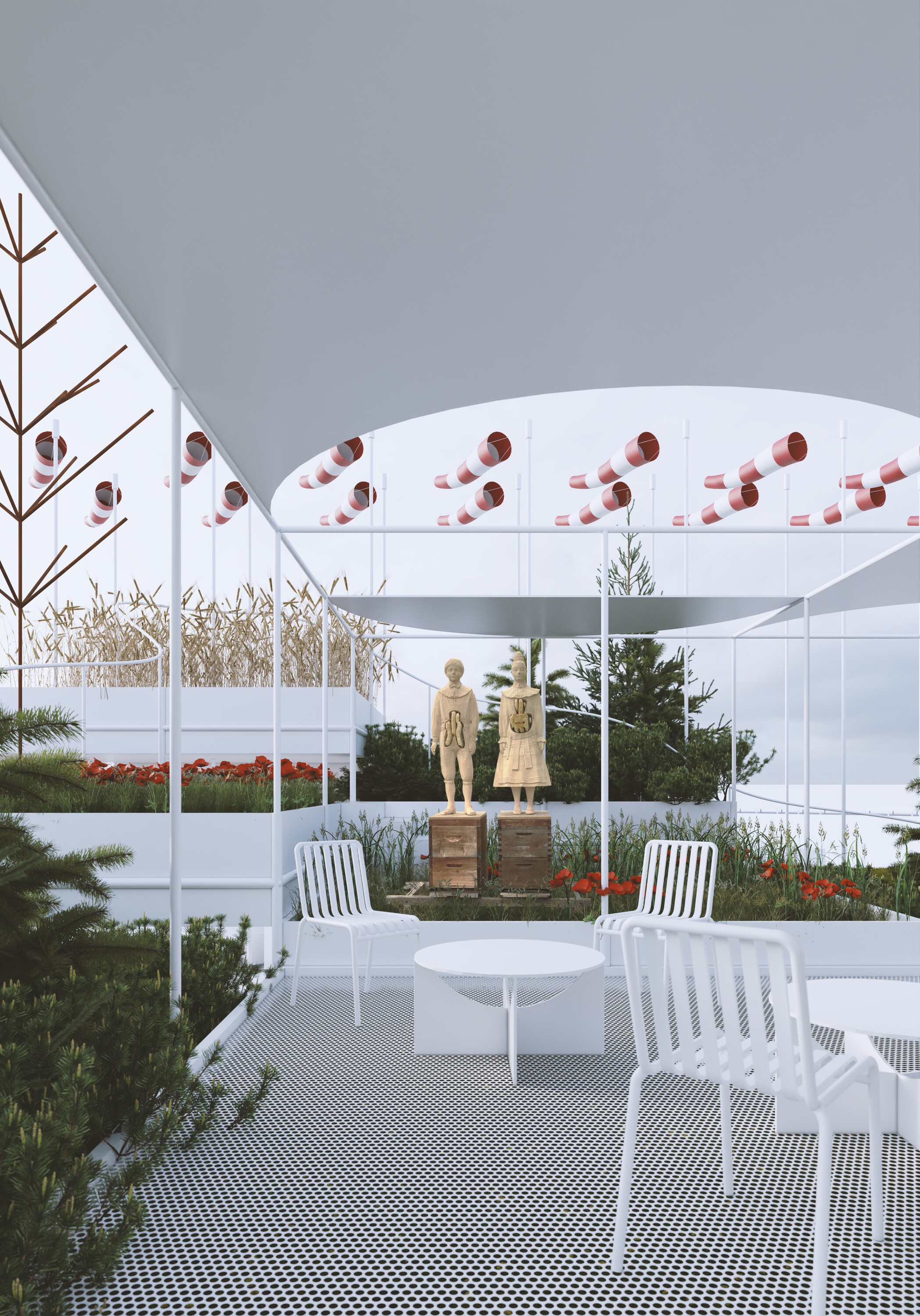 V poslední výškové úrovni domu do sebe pronikají dva světy – nebe a zahrada. Nebe pod střechou zahrady je výstavním prostorem i místem pro soukromé akce. V jemné pavučině nosné konstrukce se prolínají umělecké artefakty s funkčními objekty. Z vnitřní expozice je přímý vstup do zahradních teras. I zahrada je výstavní síní, územím pro dětské hry i místem, kde mohou návštěvníci odpočívat a také pod stromy přemýšlet o směřování našeho křehkého světa.