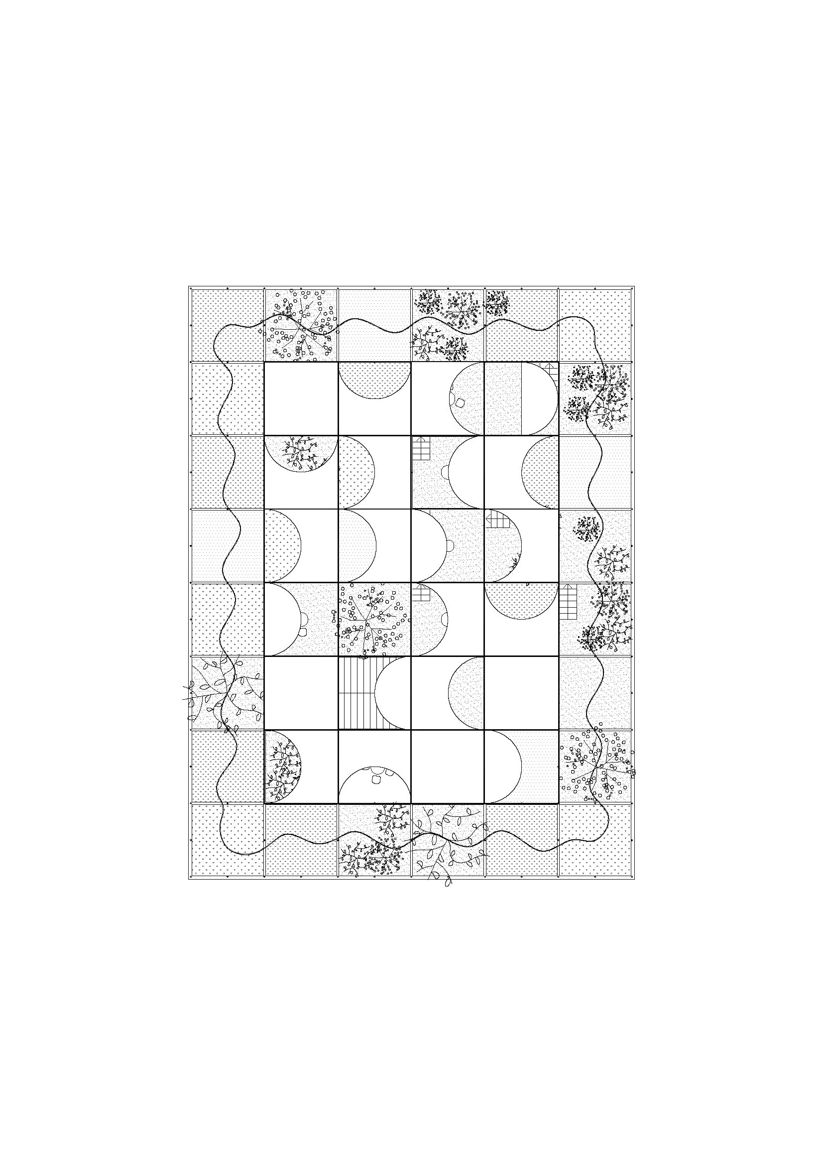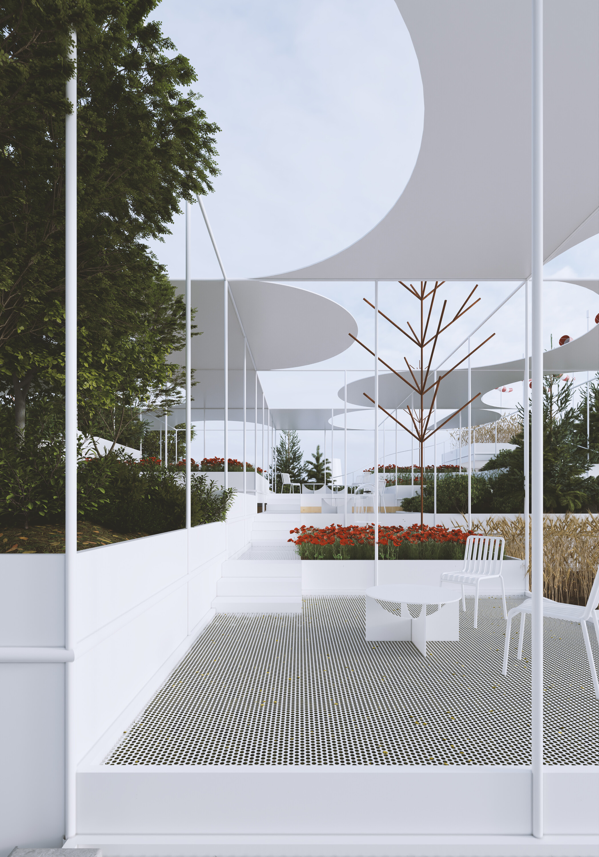 Krajinářské řešení pavilonu je reminiscencí na mozaikovitou strukturu krajiny České republiky. Střešní krajina pavilonu je pestrá, na různě vysokých ploškách se ukazuje rozmanitost povrchů, struktury stvolů, kmenů a větví, textury listí i proměňující se barvy v průběhu sezóny. Na střeše pramení potůček, který protkává cestu celým pavilonem a končí v tůni v parteru. Hladina zrcadlí mrak, návštěvníky a celou expozici a posiluje tak myšlenku svázání života lidí s počasím, koloběhem roku i života.