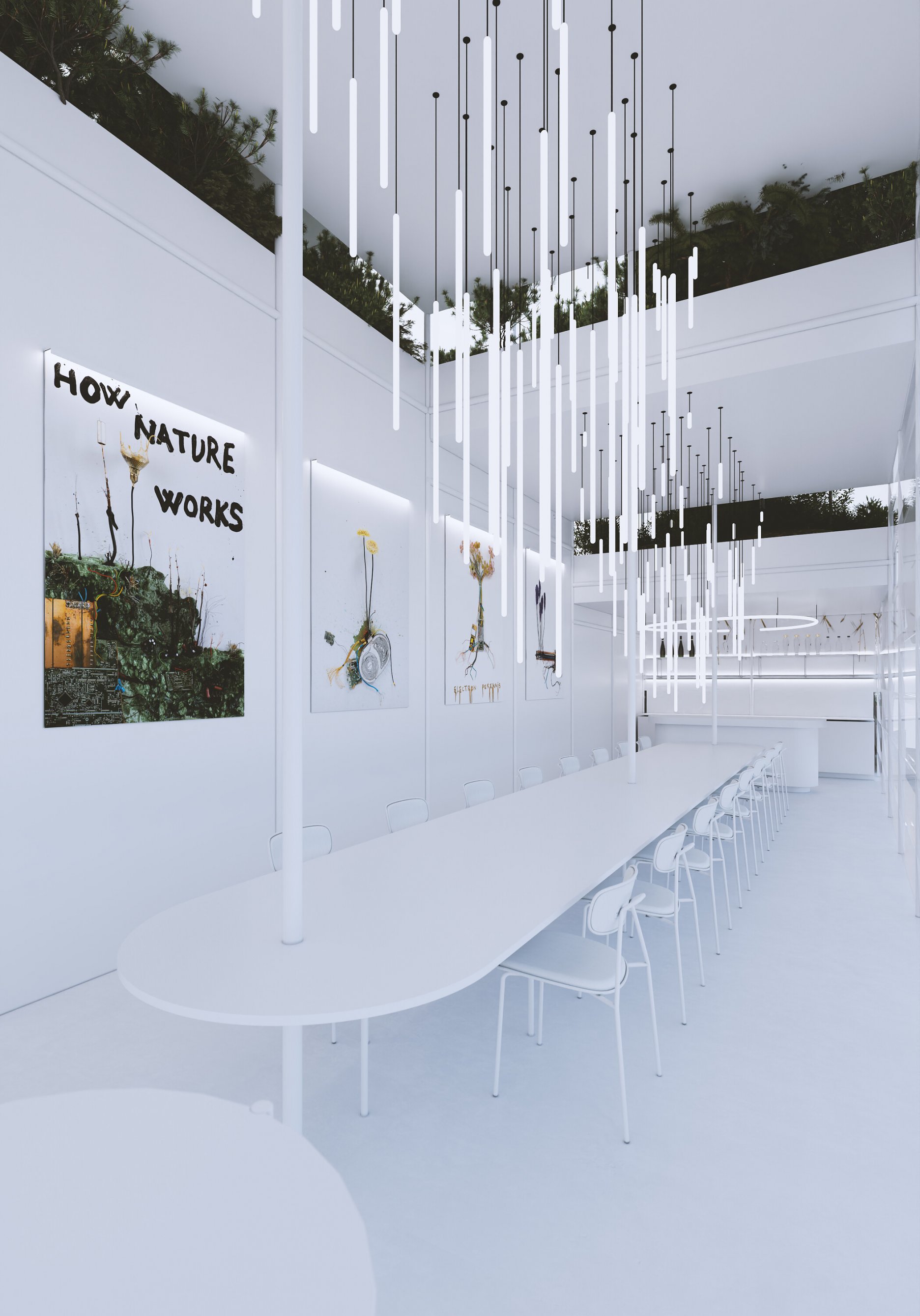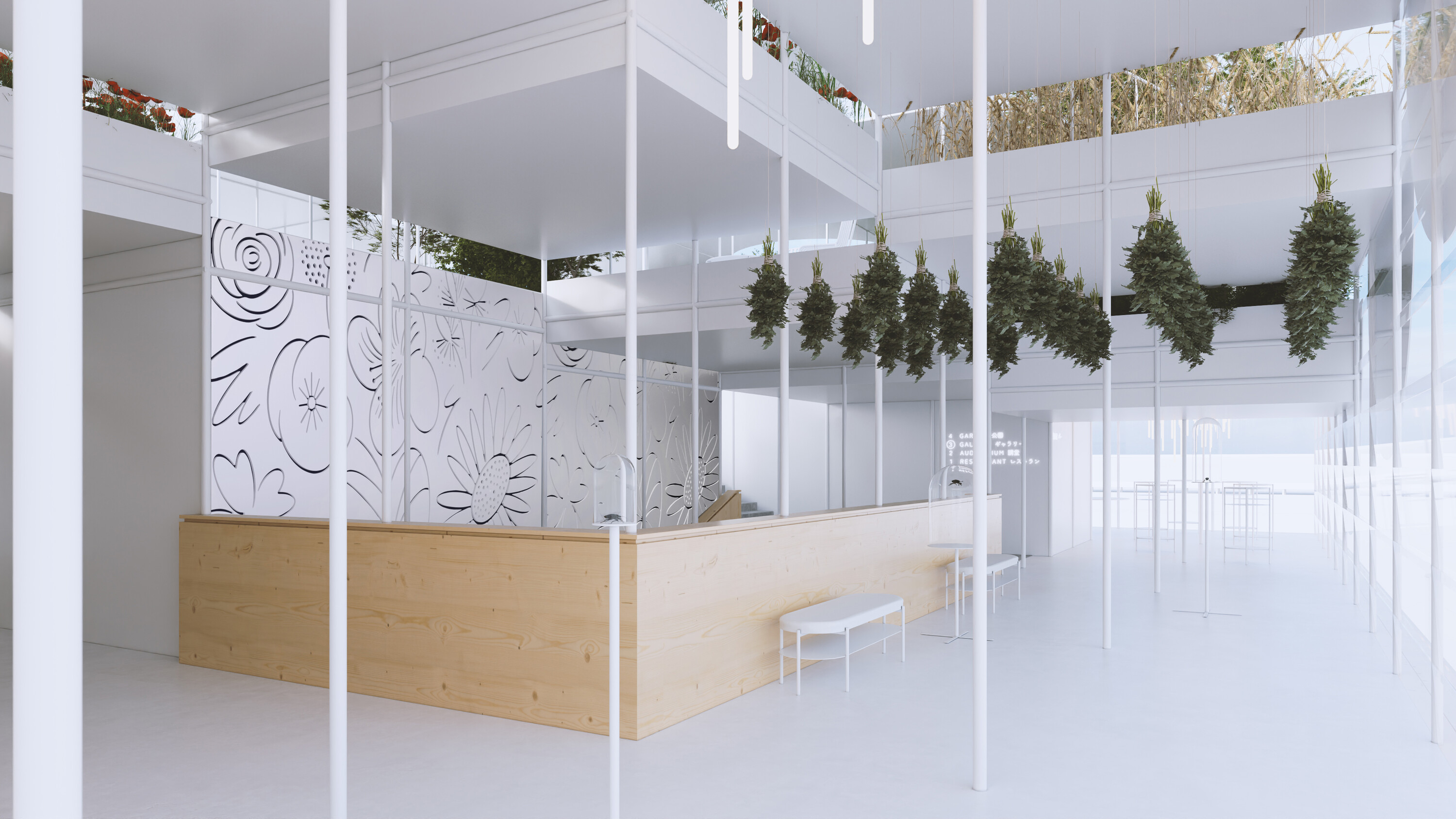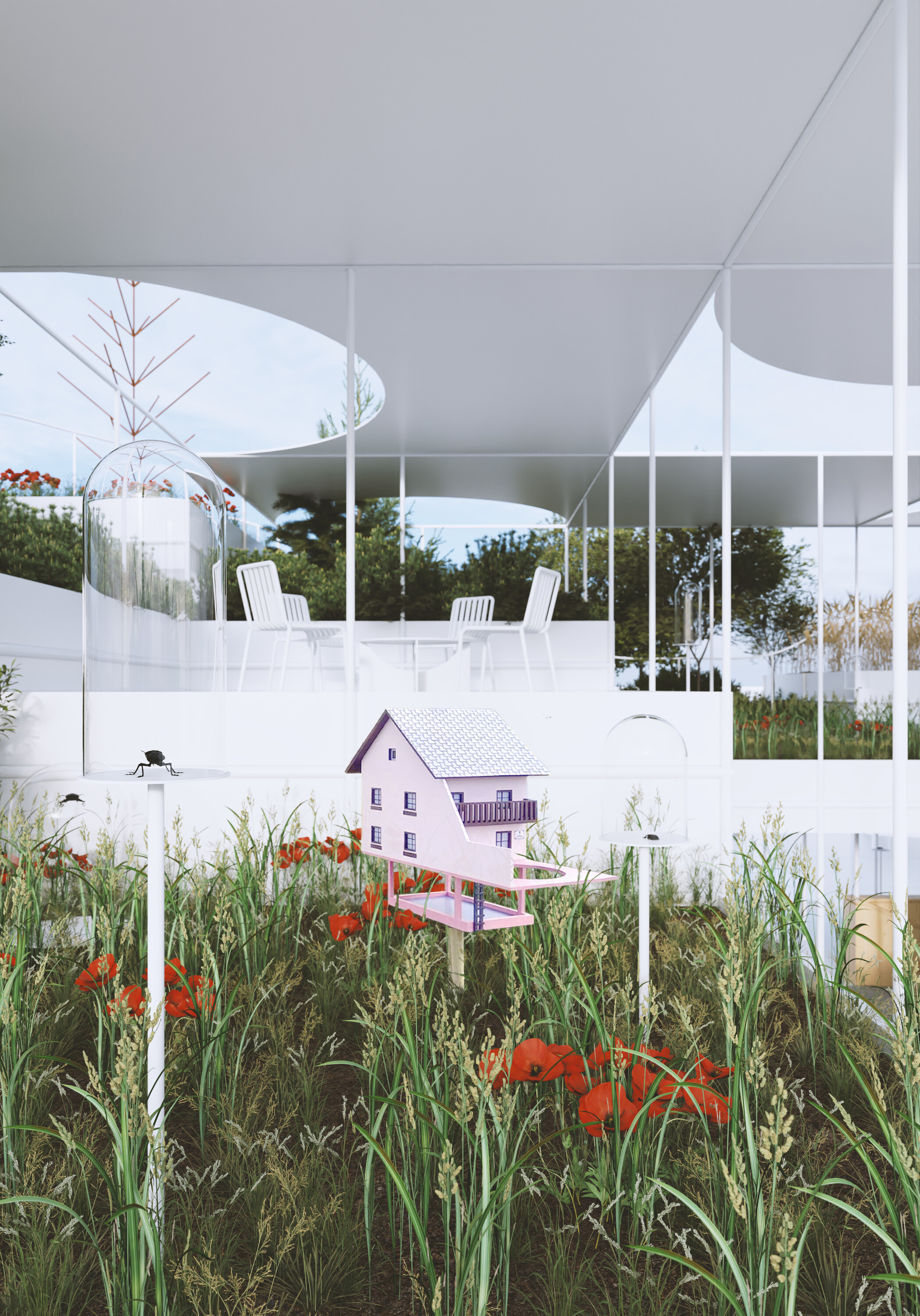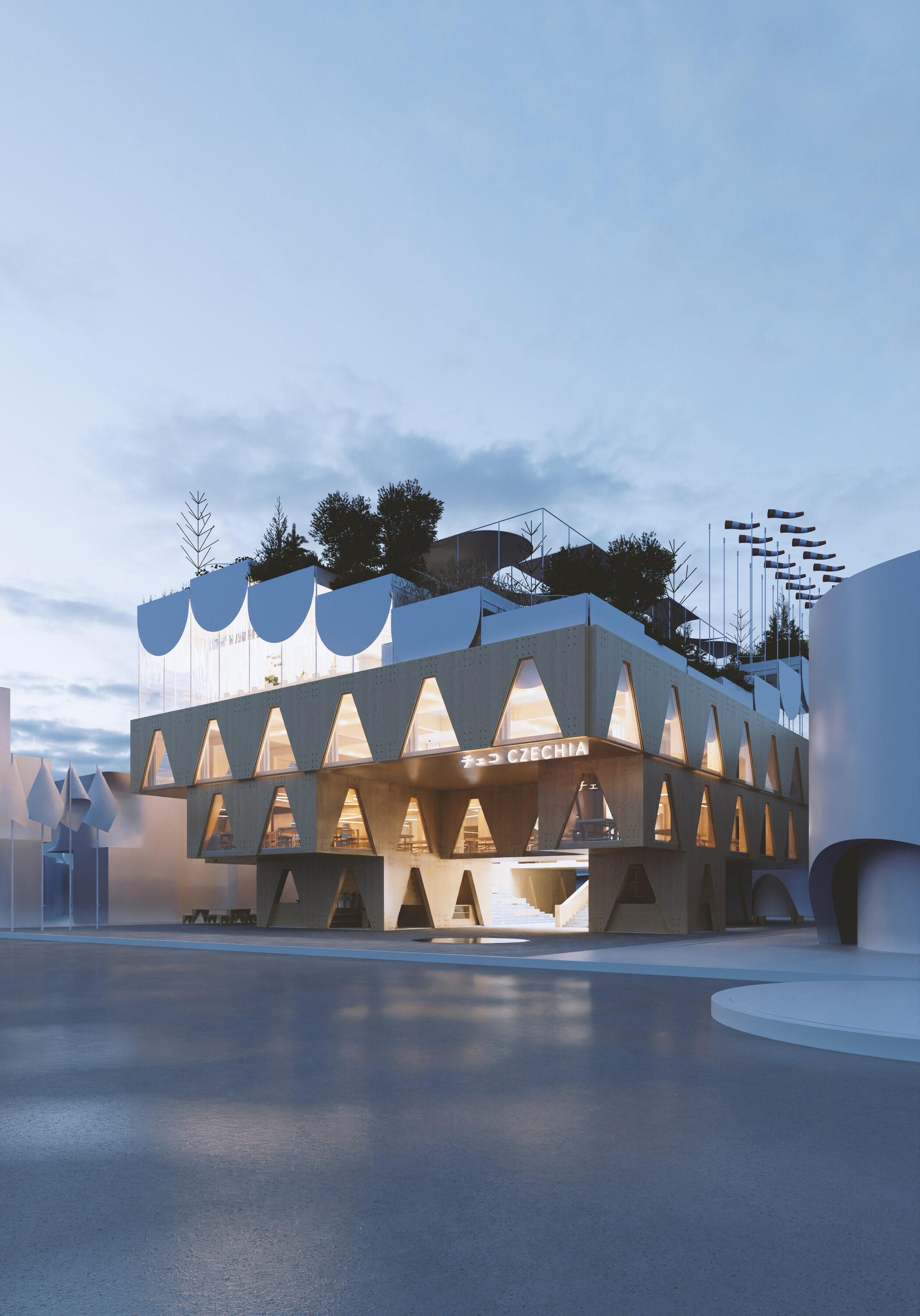 Pavilon představuje mrak, vznáší se nad hlavami návštěvníků a ti jsou jeho nitrem vtahováni do výšek zahrady. Cestou vzhůru je provází potůček, který je napájen srážkami, o něž v Ósace není nouze. Nitro pavilonu pohlcuje návštěvníky, umožňuje pohled na nebe tvořené projekcí. Přízemí je veřejným prostorem s krytým atriem. Dvě schodiště propojují vstupní část s druhým patrem. Jednotlivé unikátní 3D tištěné stupně utvářejí mikro krajinu přímo uprostřed domu, dotek přírody v ortogonálním systému dřevěných sloupů a desek. Druhé patro je zasvěcené české kuchyni, způsob uspořádání interiéru podporuje mezilidské kontakty. Nad gastro koutkem je multifunkční auditorium, které je aktivně začleněné do kurátorované dramaturgie pavilonu, je multimediální zastávkou na cestě vzhůru.
