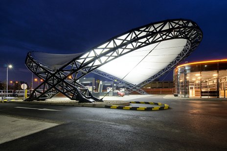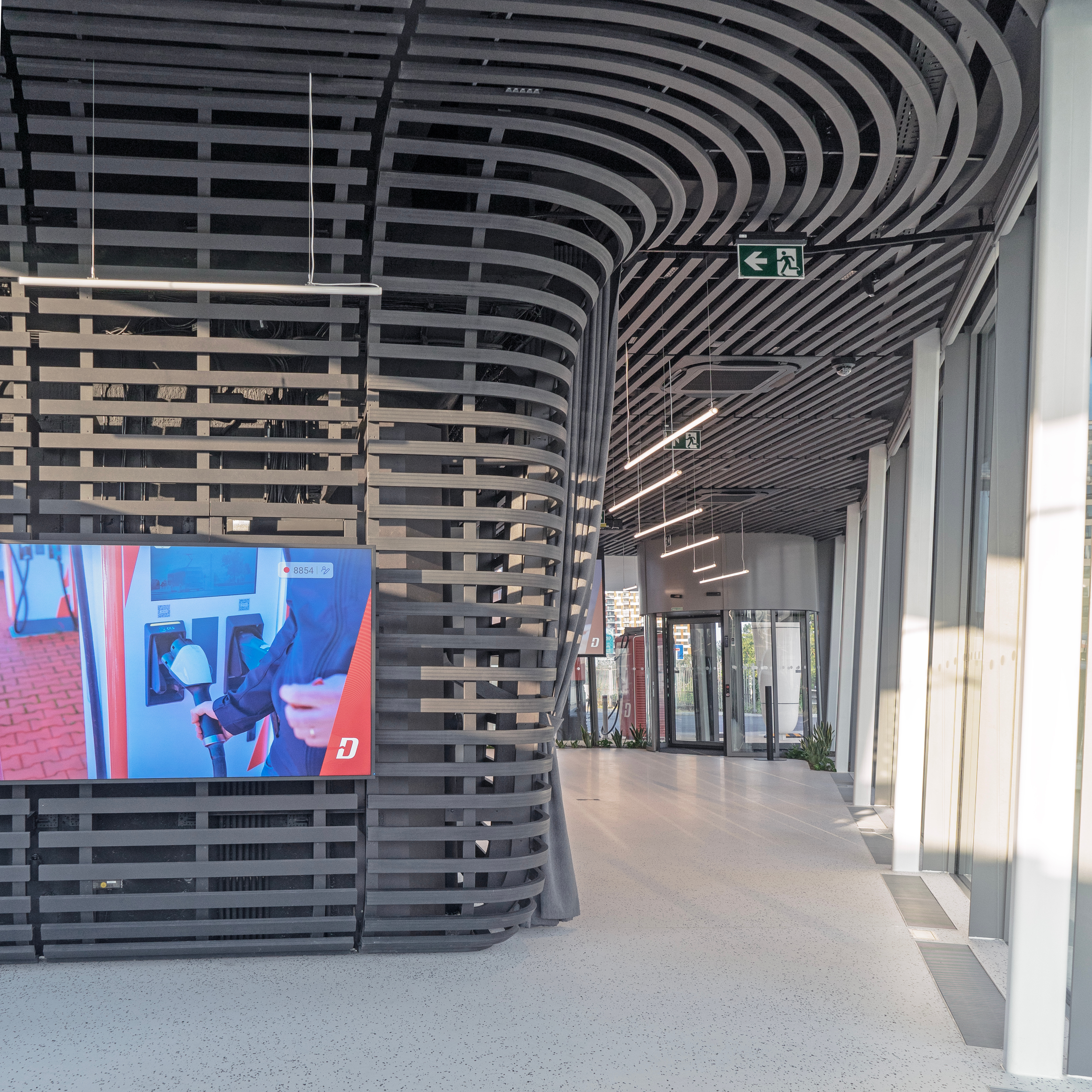 Organicky plynúce fasády nedávno dokončeného nabíjacieho hubu z dielne ateliéru INDEKS ukrývajú moderné technologické zázemie a transparentný pavilón s flexibilným využitím.