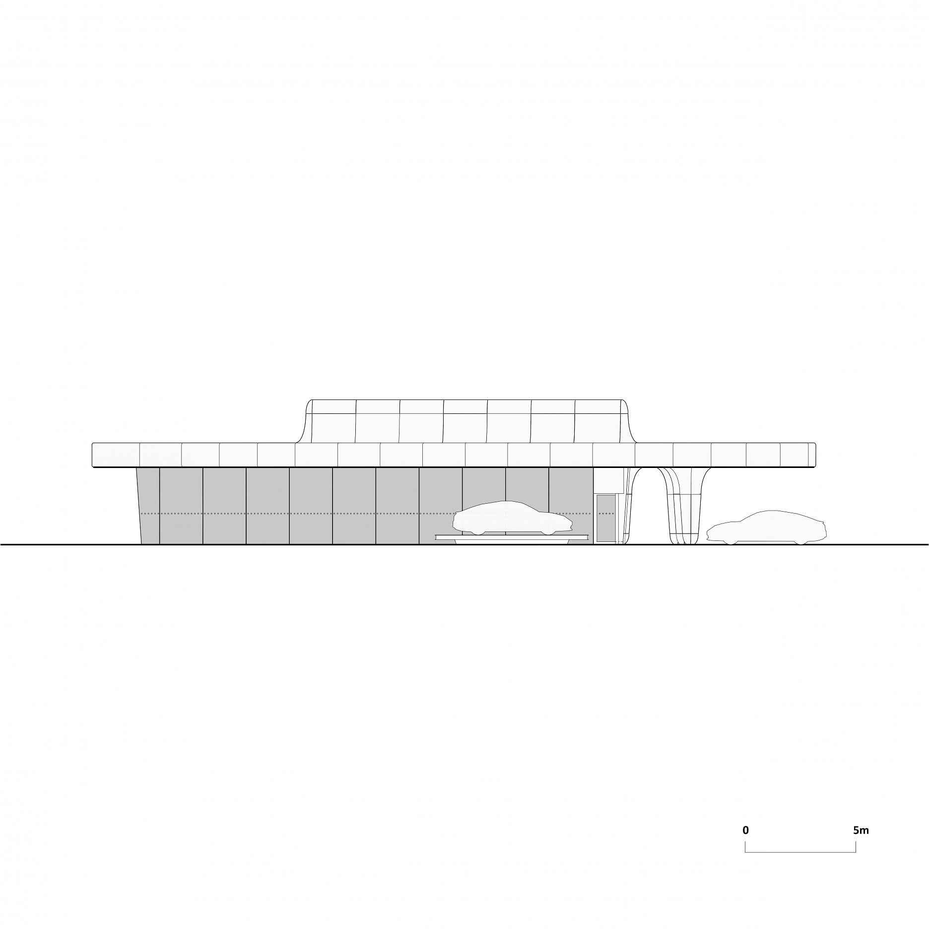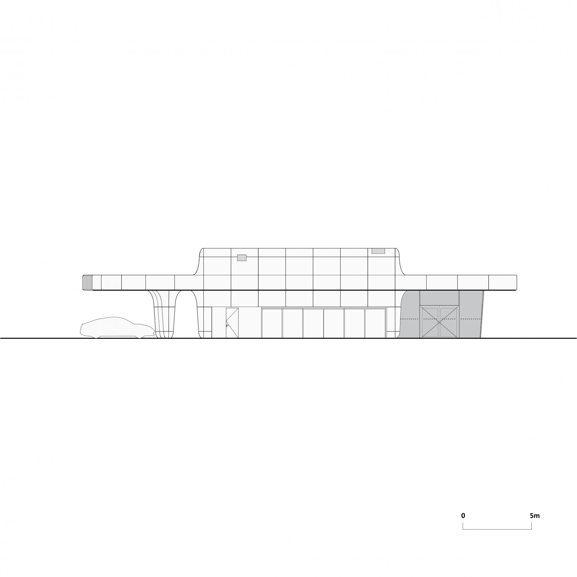 Materiálové riešenie v exteriéri je tvorené GRC panelmi a spevnenými plochami z bieleho betónu a mlatu. V kontraste so svetlým exteriérom je interiér ladený v tmavších farbách.