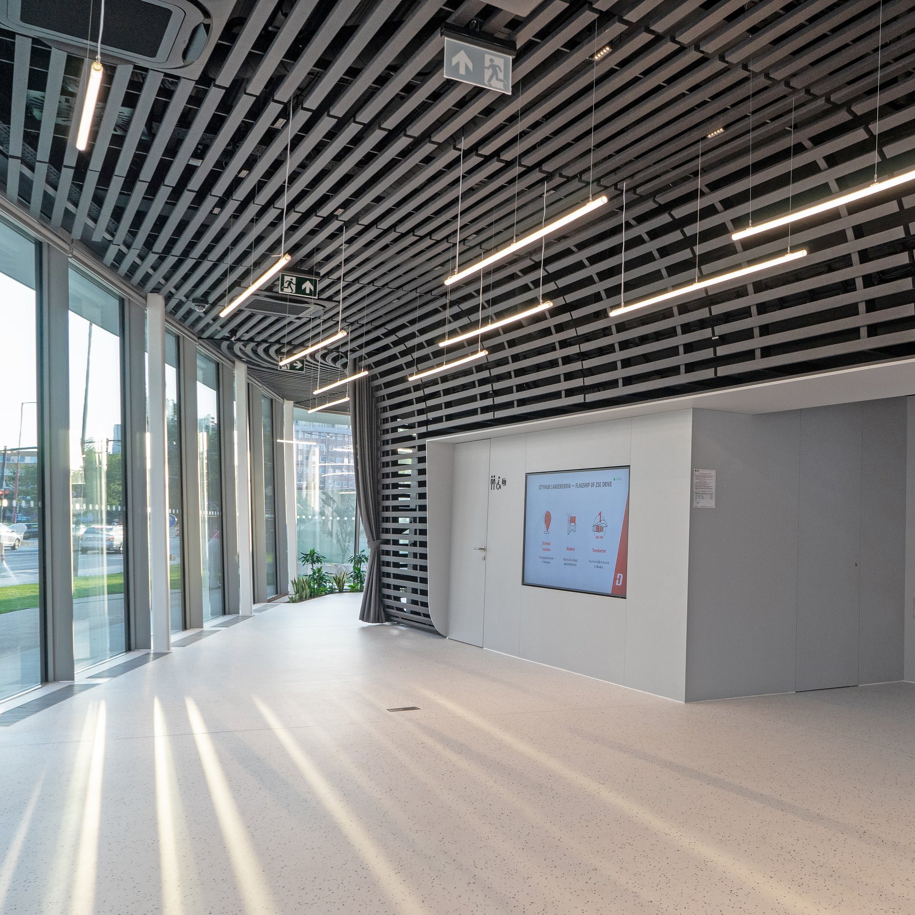 Vnútorným priestorom dominuje lamelový podhľad, ktorý organicky prechádza do stien a zakrýva technologické inštalácie. Tento princíp "prerastania" je analogický s exteriérom budovy.