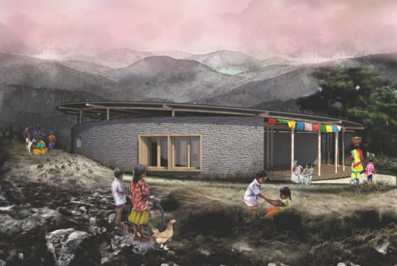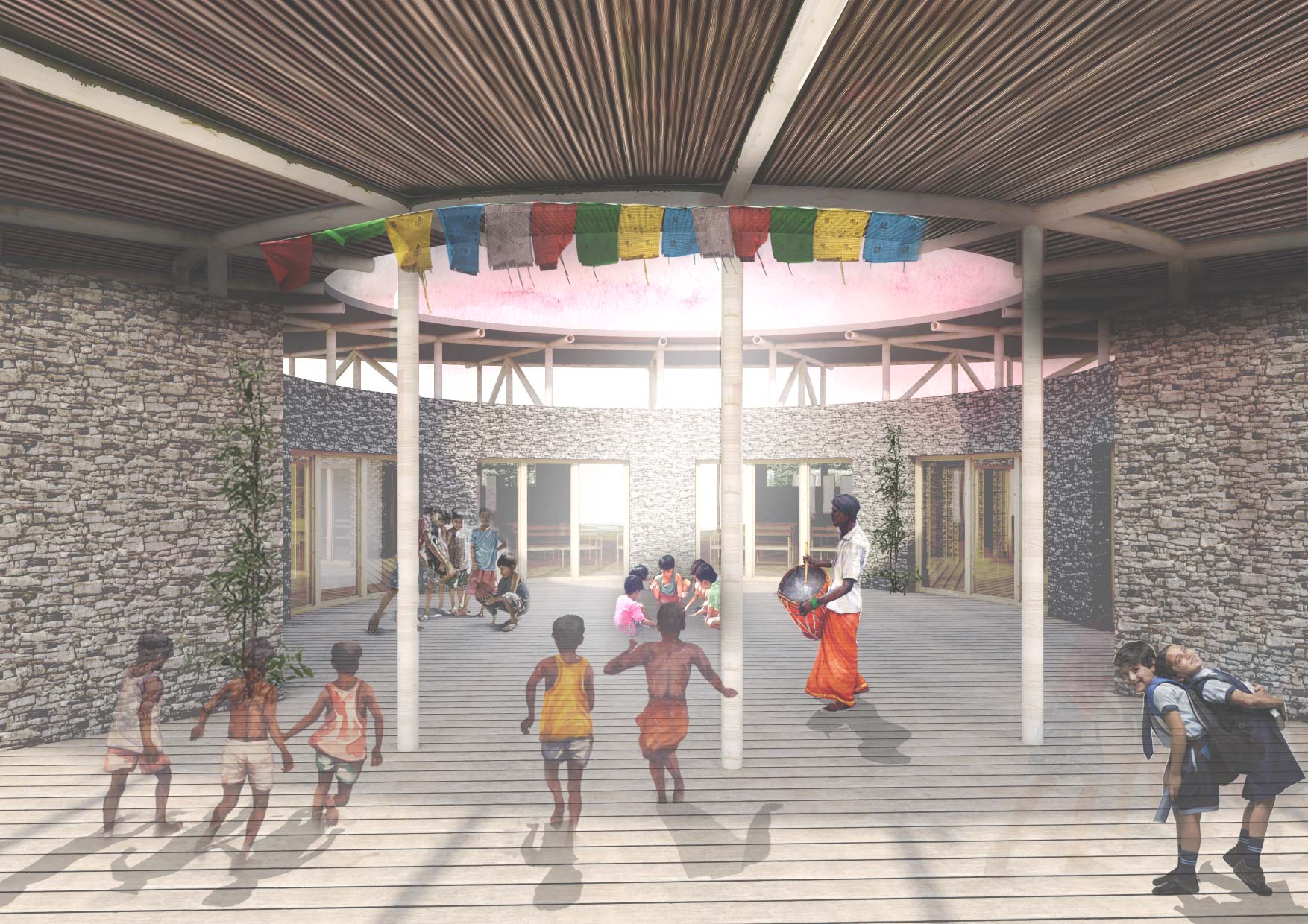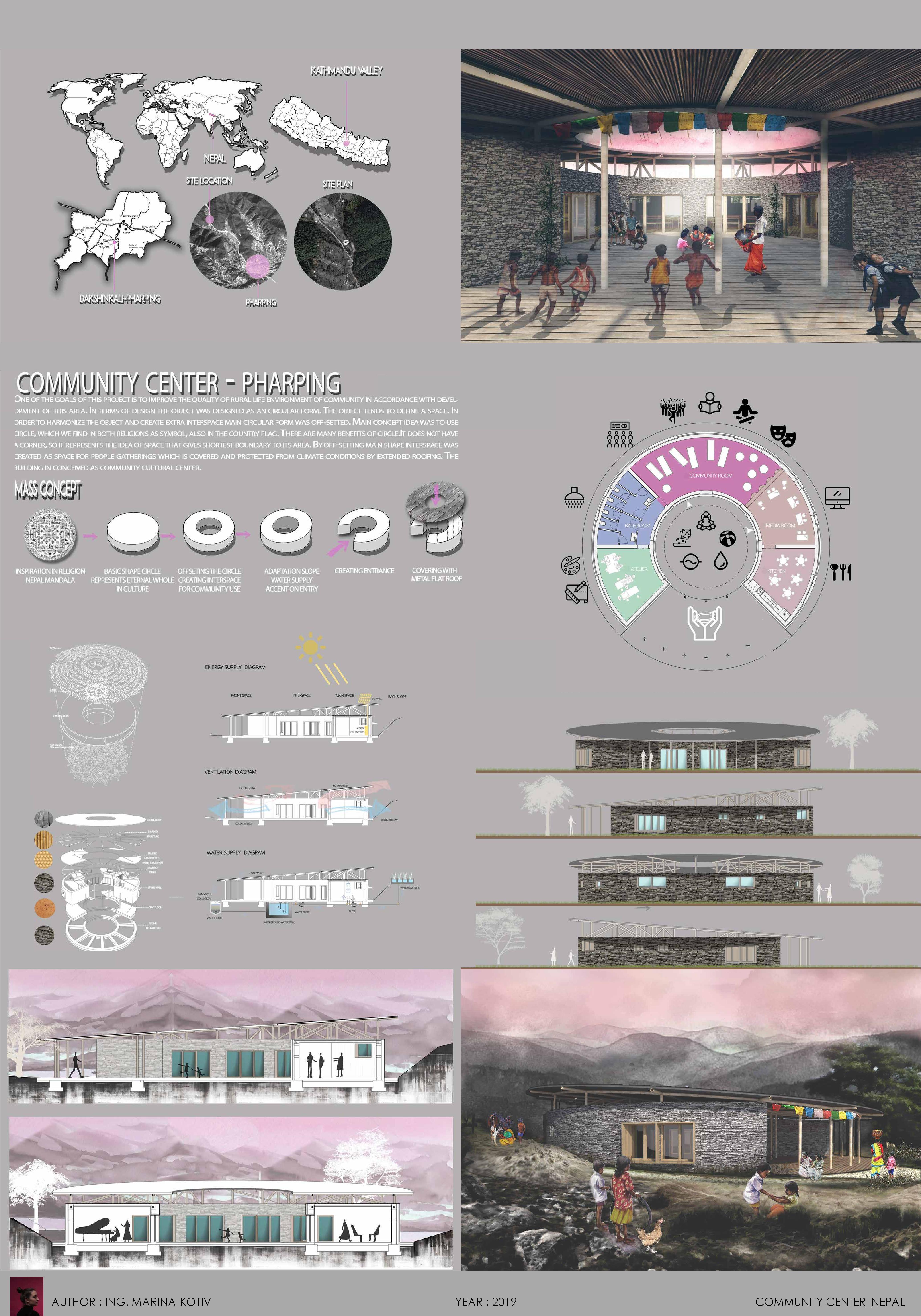 In terms of design the object was desighned as an circular form.The circular object tends to define a space. In order to harmonize the object and create extra interspace main circular form was off-setted.Main concept idea was to use circle, which we find in both religions as symbos, also in the country flag. There are many benefits of circle. It does not have a corner, so it represents the idea of space that gives shortest boundary to its area. By off-setting main shape interspace was created as space for people gatherings which is covered and protected from climate conditions by extended roofing. The building is conceived as community cultural center.