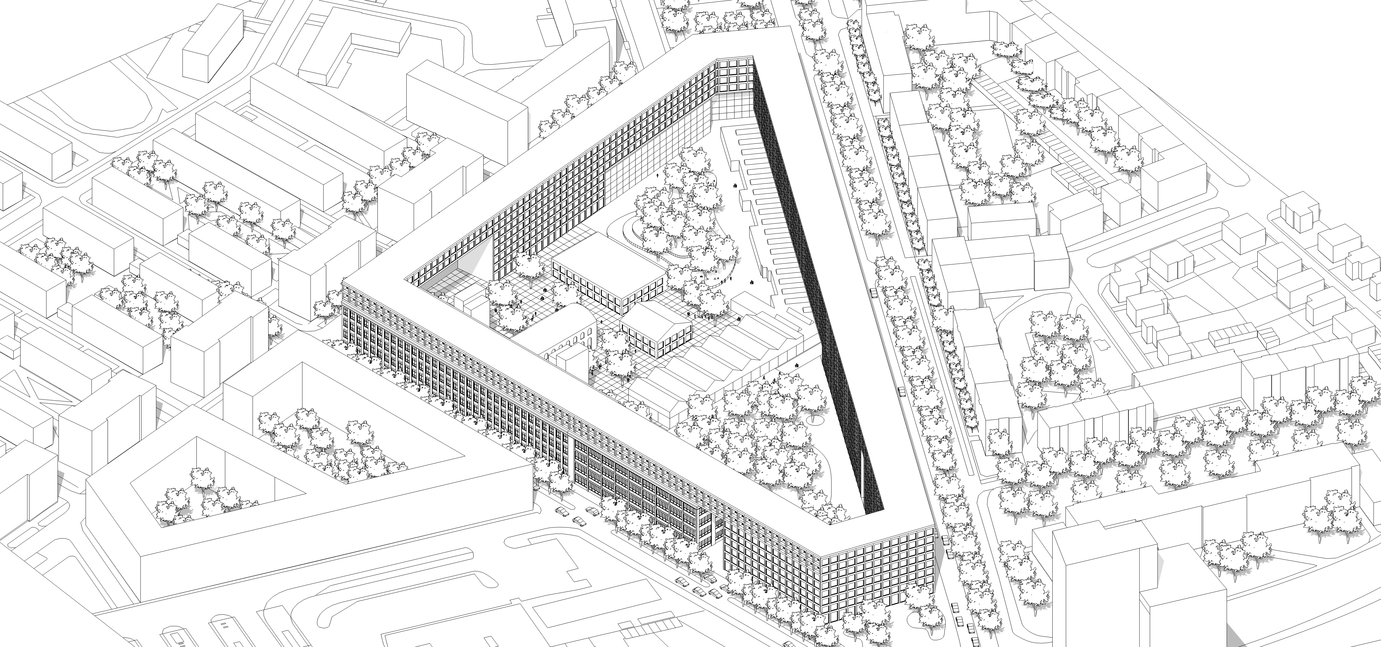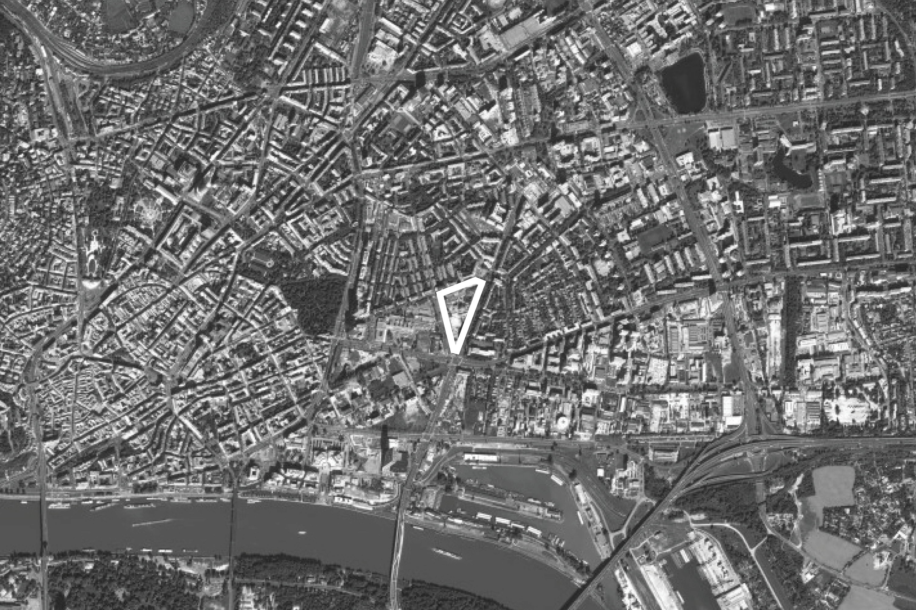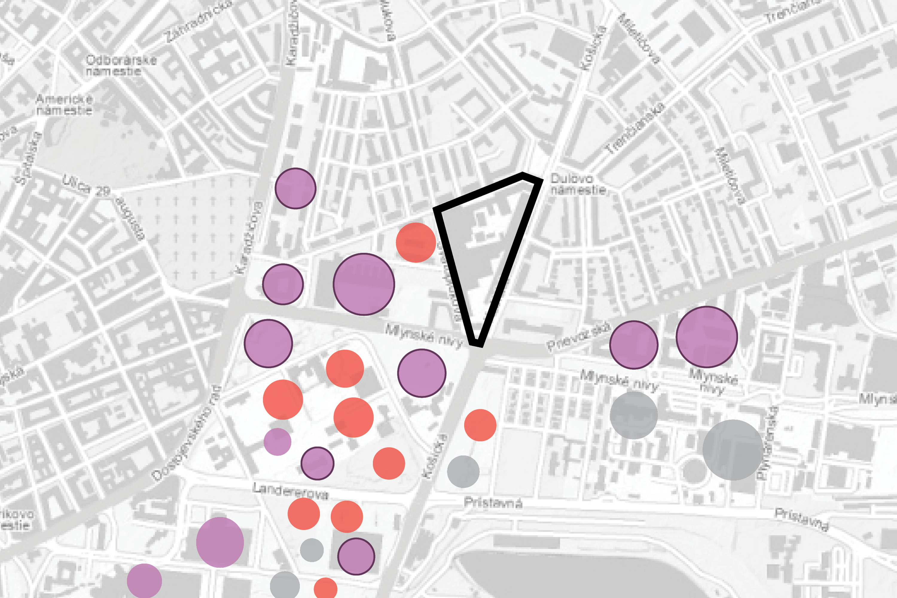 Pozemok je lemovaný dvoma frekventovanými ulicami, križovatka Košická - Prievozská je významným dopravným uzlom, v tesnej blízkosti sa nachádza Hlavná autobusová stanica. Ako reakcia na to sa blok uzatvára do seba, orientuje všetky funkcie do svojho vnútra a hmota bloku vystupuje ako bariéra medzi rušným okolím a introvertným vnútroblokom.
