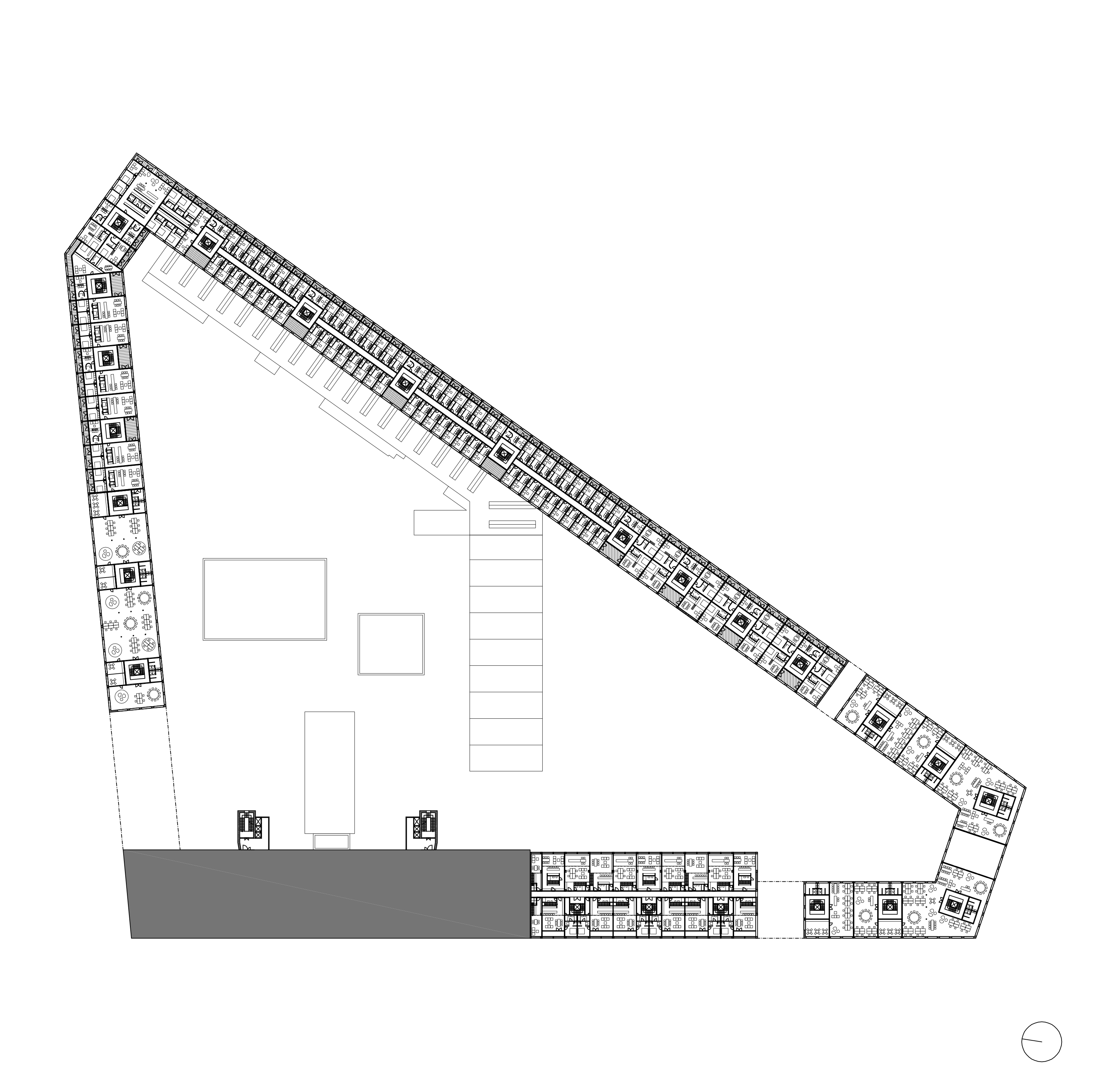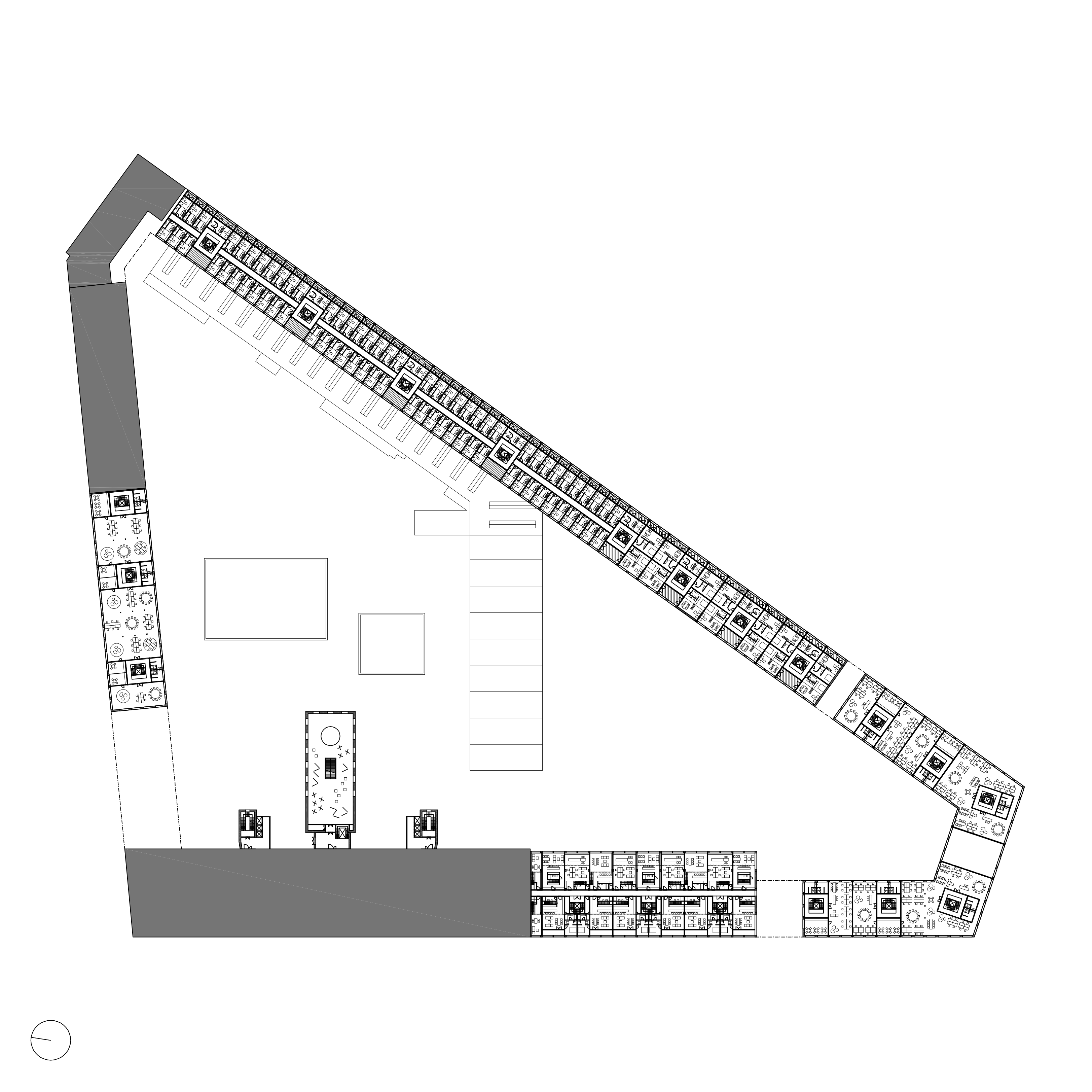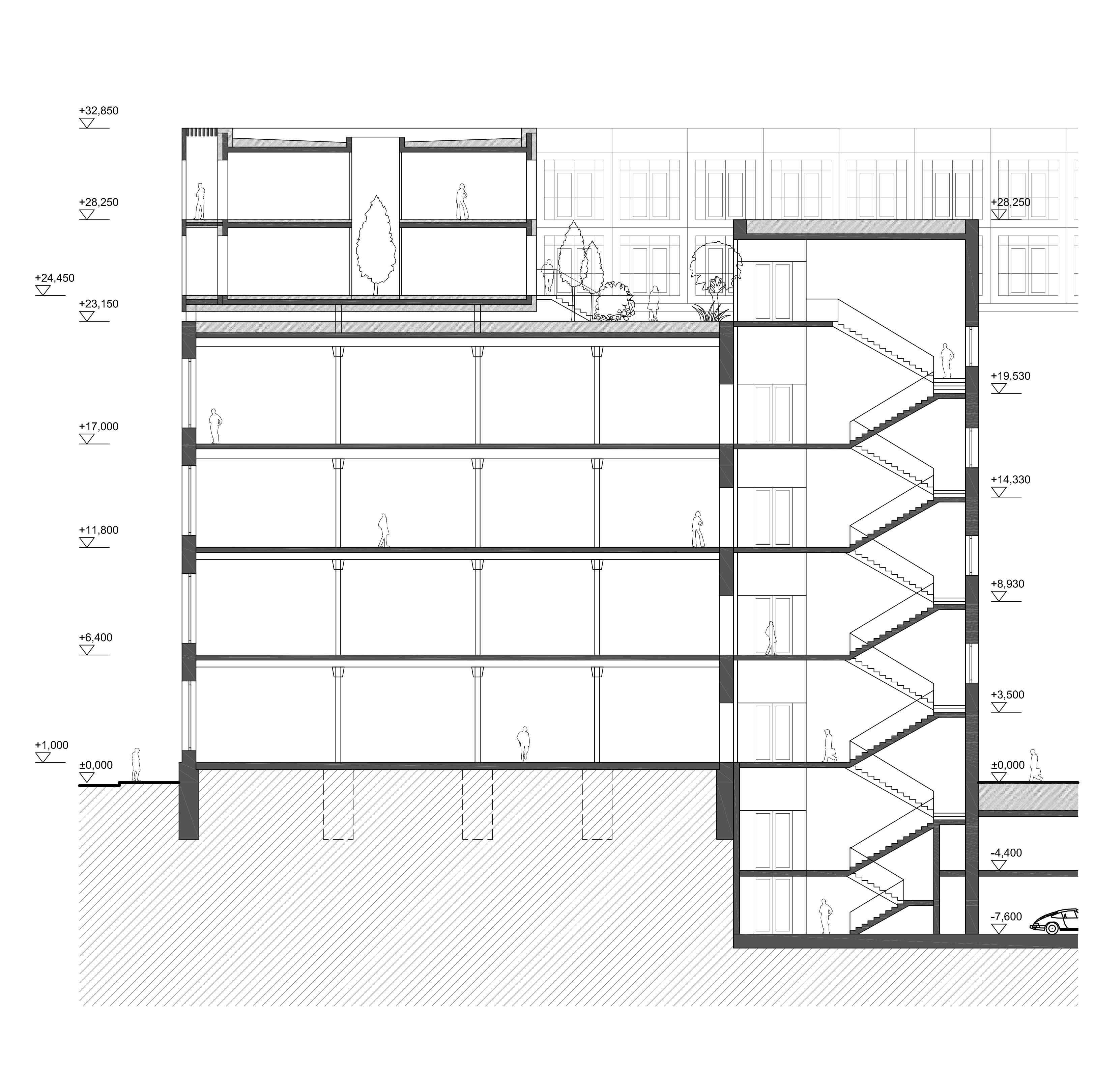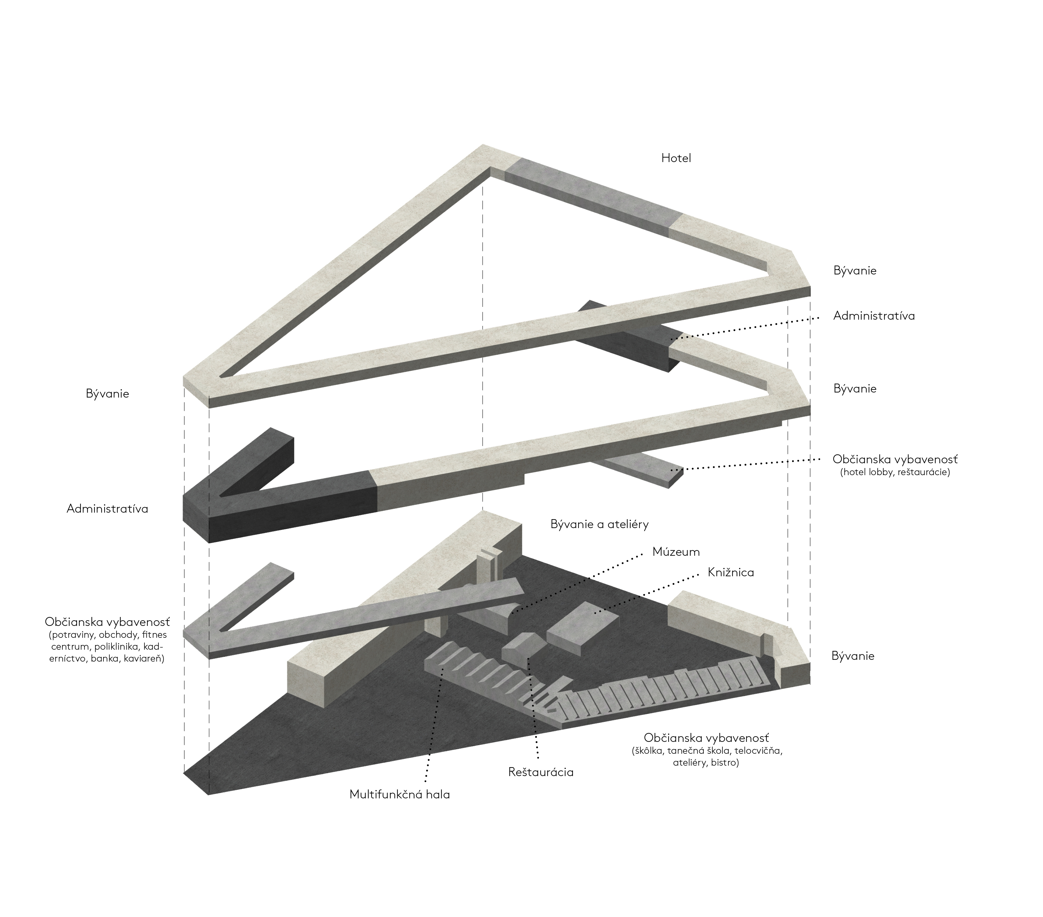 Blok povyšuje vrstvenie Cvernovky na princíp. Vrstvením vzniká hybrid kombinujúci funkcie bývania (62%), občianskej vybavenosti (20%) a administratívy (18%) do jedného polyfunkčného monobloku. Je to aj návrat k myšlienke “mesto v meste” prítomnej v 70-tych rokov v pôvodnom areály Cvernovky. S parterom občianskej vybavenosti zahŕňajúcim obchody, ateliéry, galérie, reštaurácie, bary, kaviarne, škôlku, múzeum, knižnicu alebo multifunkčnú sálu je záujem vytvoriť a dotovať verejný priestor, ktorý vzniká vo vnútrobloku novej Cvernovky.