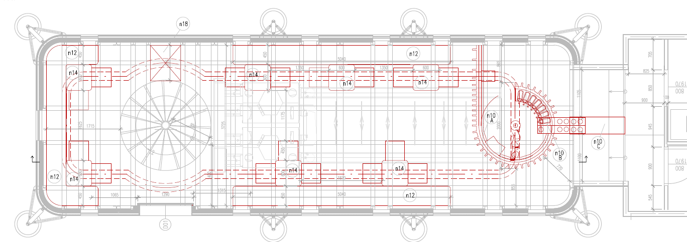 Pôdorys s vyznačenou prevádzkou. Robotické rameno a dopravný koľajnicový systém sú znázornené červenou farbou.