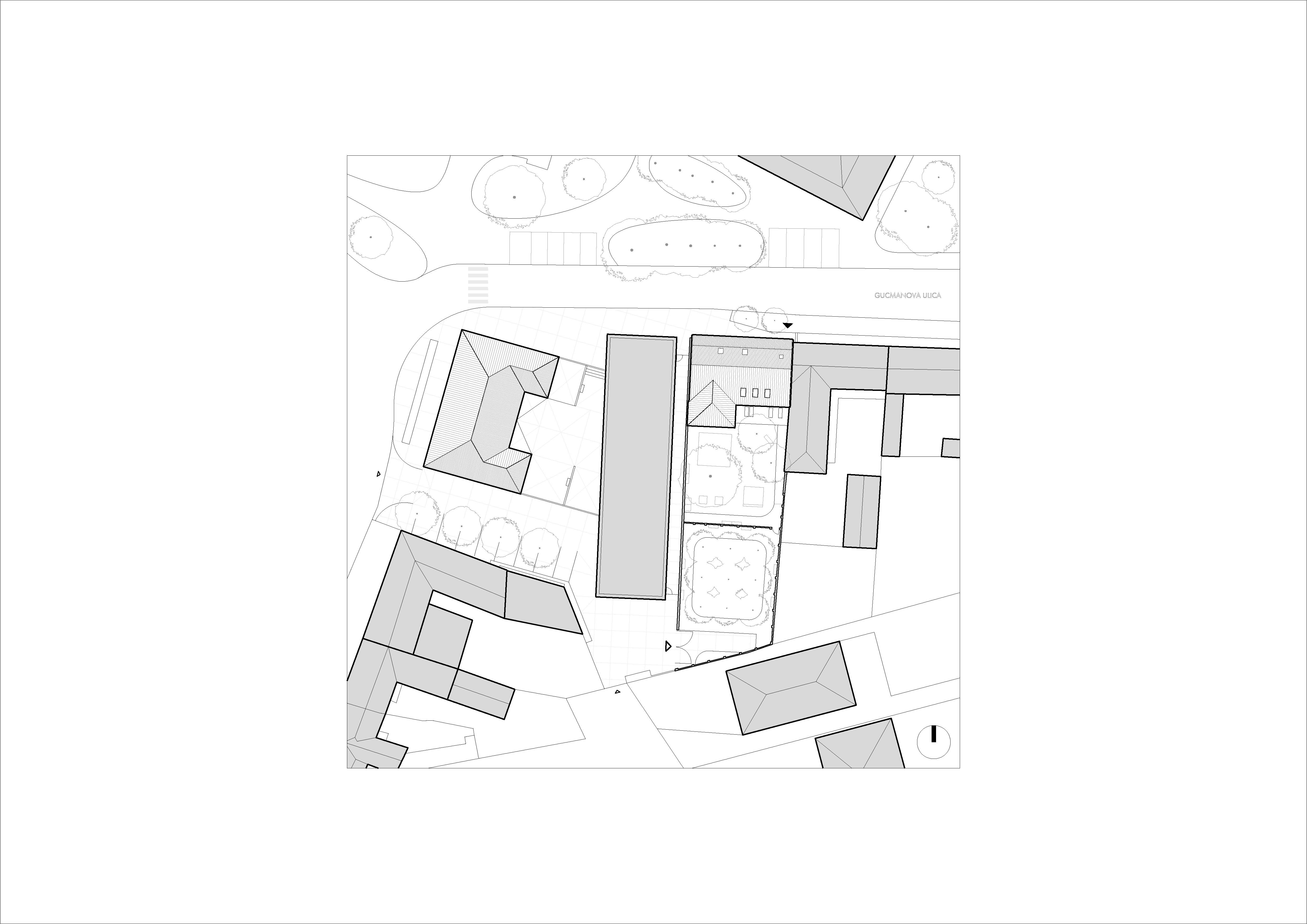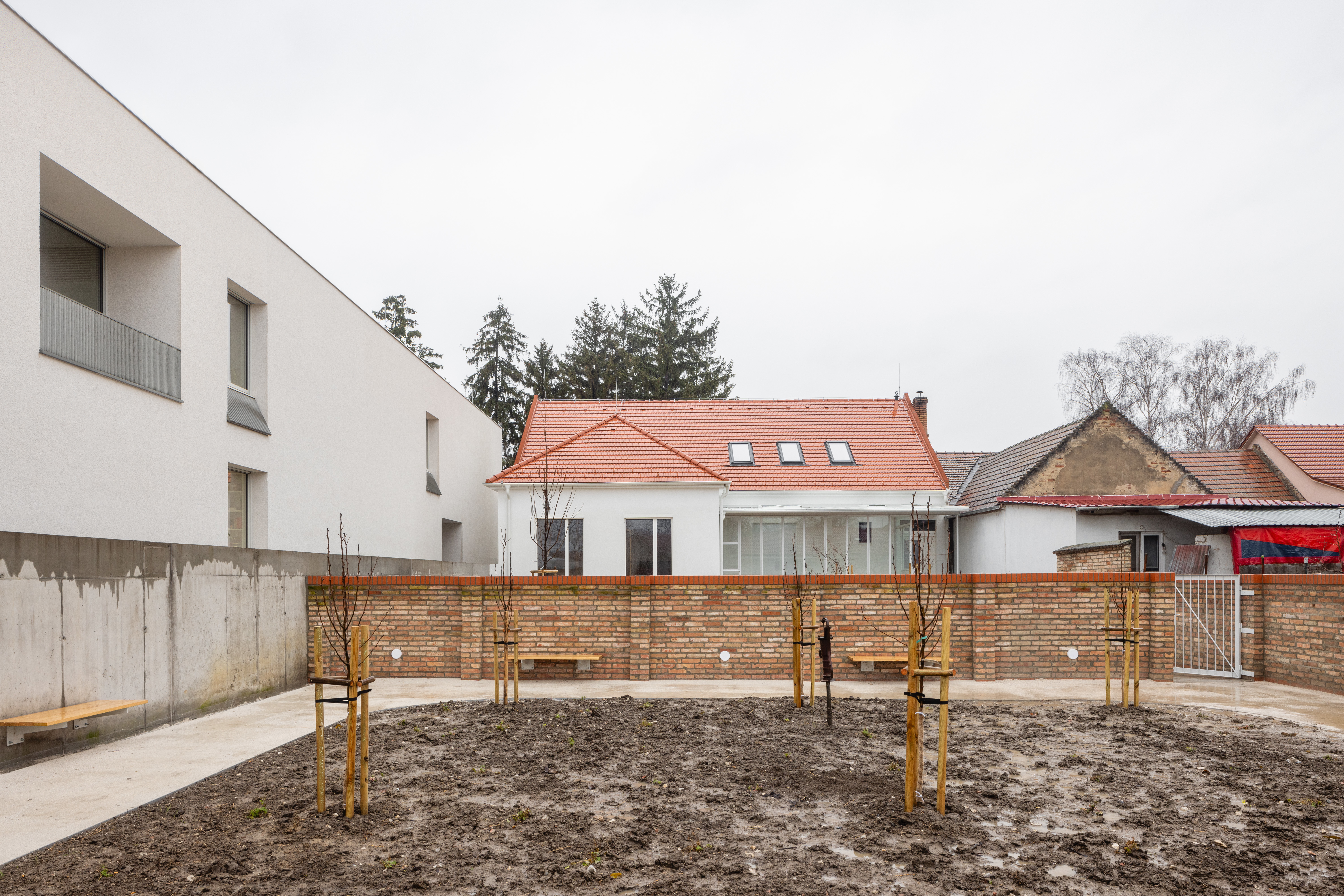 Je známe, že Leopoldov má momentálne mimoriadne rozhľadené a činorodé vedenie. Bodom nula je z hľadiska architektonickej kultivácie tohto cca 4-tisícového mestečka nepochybne rekonštrukcia a dostavba budovy mestského úradu od architektov zerozero. Práve od neho sa odvíjajú nielen ďalšie múdre rozhodnutia mesta, ale aj úvaha skupiny autorov Róbert Bakyta, Martin Kusý ml., Július Vass a Ľubomíra Blašková, ktorí projekt jaslí neuchopili len ako rekonštrukciu rodinného domu, resp. jeho konverziu, ale aj ako úlohu so širším priestorovým dosahom. Bezprostredná blízkosť oceňovaného mestského úradu architektov nabádala k rešpektu voči jeho vizuálnej dominancii, no mestský úrad je dotvorený aj verejným priestorom a práve ten sa rozhodli ďalej rozvíjať. Nadviazali pritom na prvotnú štúdiu od ateliéru 2021 a ich ideu v zmysle pôvodnej parcelácie do zadnej časti jaslí, akoby do zadného dvora, umiestniť menší parčík. Má podobu štvorcového nádvoria s okružným chodníkom z mlatu a centrálnou zeleňou s ovocnými stromami. Malý sad s lavičkami. Rajská záhrada, ktorú, skúsme dúfať, ocenia aj generácie Z a Alfa odchované na instantnom obsahu sociálnych sietí. Mesto týmto krokom získalo väčší rozsah verejných priestorov, vznikol tu akýsi klaster prepojených námestíčok s rozdielnou atmosférou. Na námestie pred úradom materiálovo nadväzuje aj vstupné predpolie jaslí, teda chodník. Architekti Bakyta, Kusý ml. a spol. ho pokryli metličkovým betónom s precízne identickým škárorezom à la zerozero.