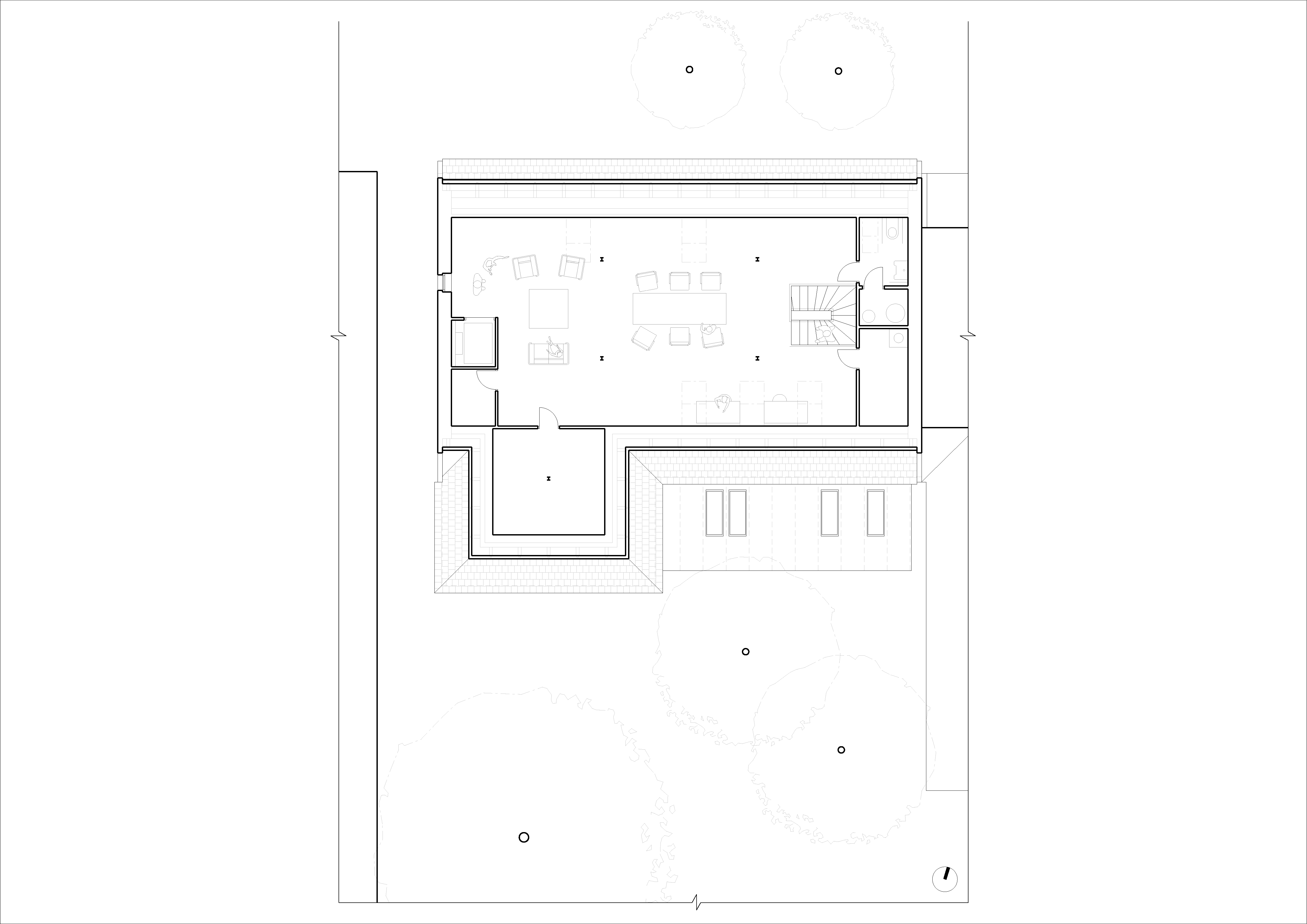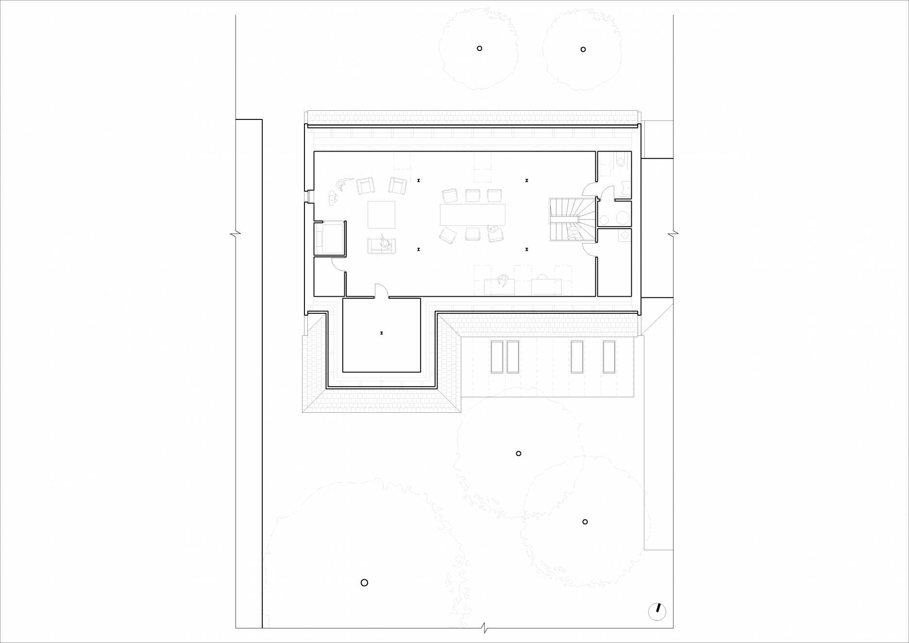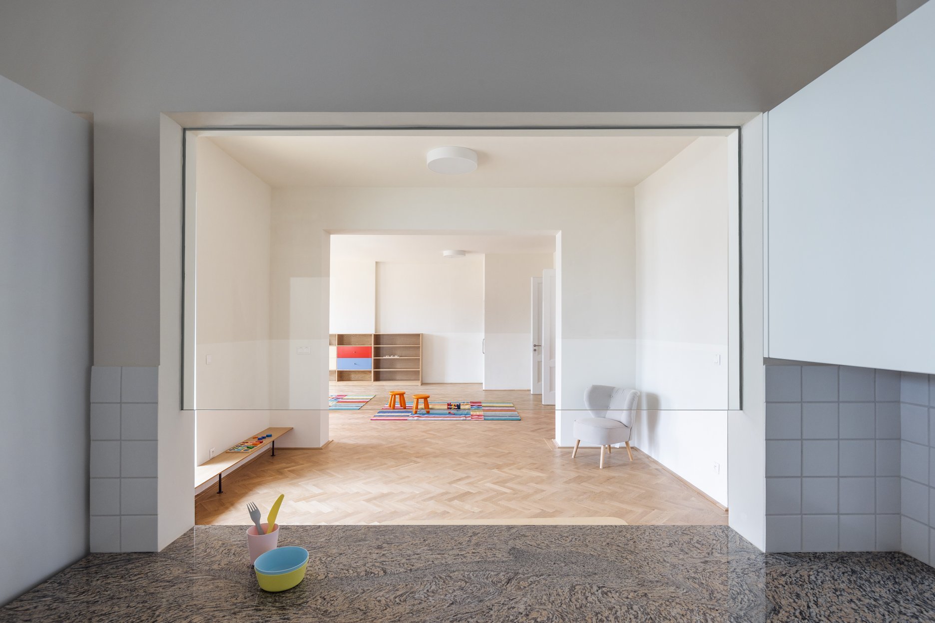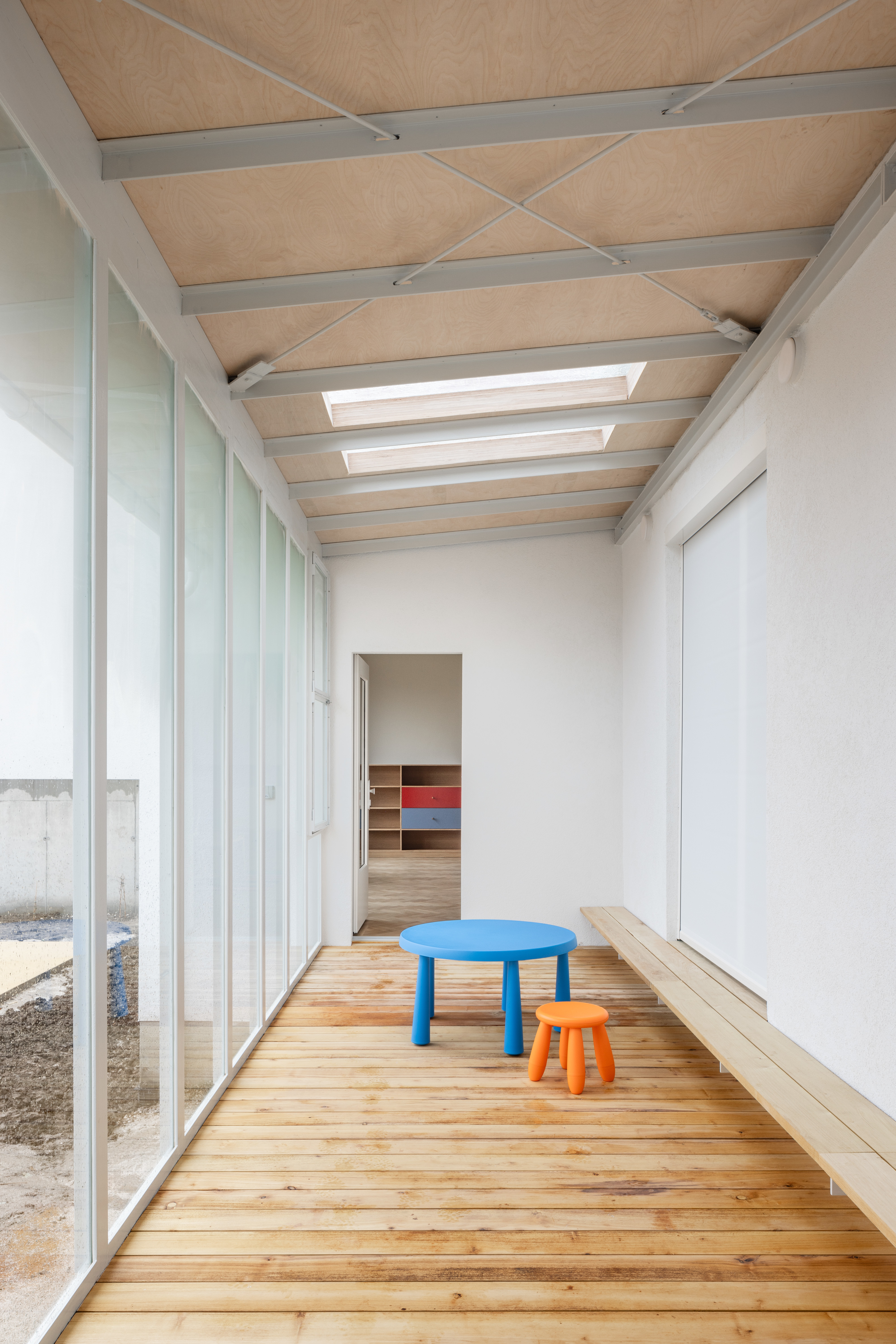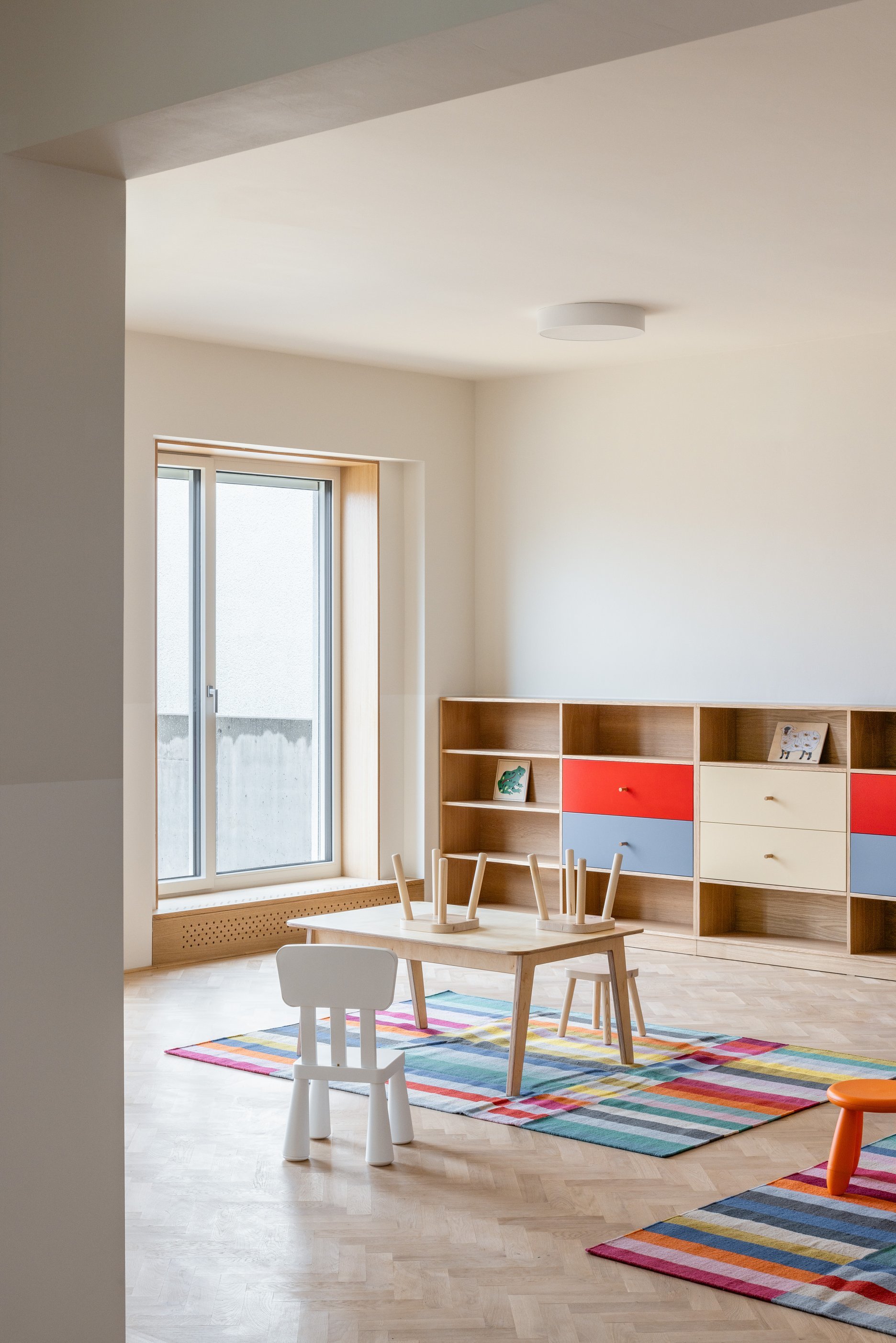 Prevádzku tvorí jednoduchý a prehľadný sled priestorov v postupnosti vstupná chodba, šatňa, hygiena, jedáleň s kuchyňou, herňa a spálnička. Chodba prebieha naprieč domom dozadu do záhrady, kde je pieskovisko, lavičky a ešte všeličo, čo sem navrhla krajinná architektka, no ešte to len čaká na zazelenenie a rozpuk. Vložený novotvar schodiska s pomerne výraznou zaoblenou drevenou stenou vedie hore do podkrovia, kde je otvorený priestor pre personál, hygienické zázemie, práčovňa a sklad. To je všetko. Ale vlastne ešte nie. Dôležité sú aj výhľady. Sú súčasťou života vo vnútri. A je na čo pozerať. Na ulici je ostrovček zo skupinkou vysokých ihličnanov, ktoré sa dajú vnímať aj z okien v podkroví a na opačnej strane domu je záhrada, ktorá keď dorastie, sľubuje farbistú scenériu.