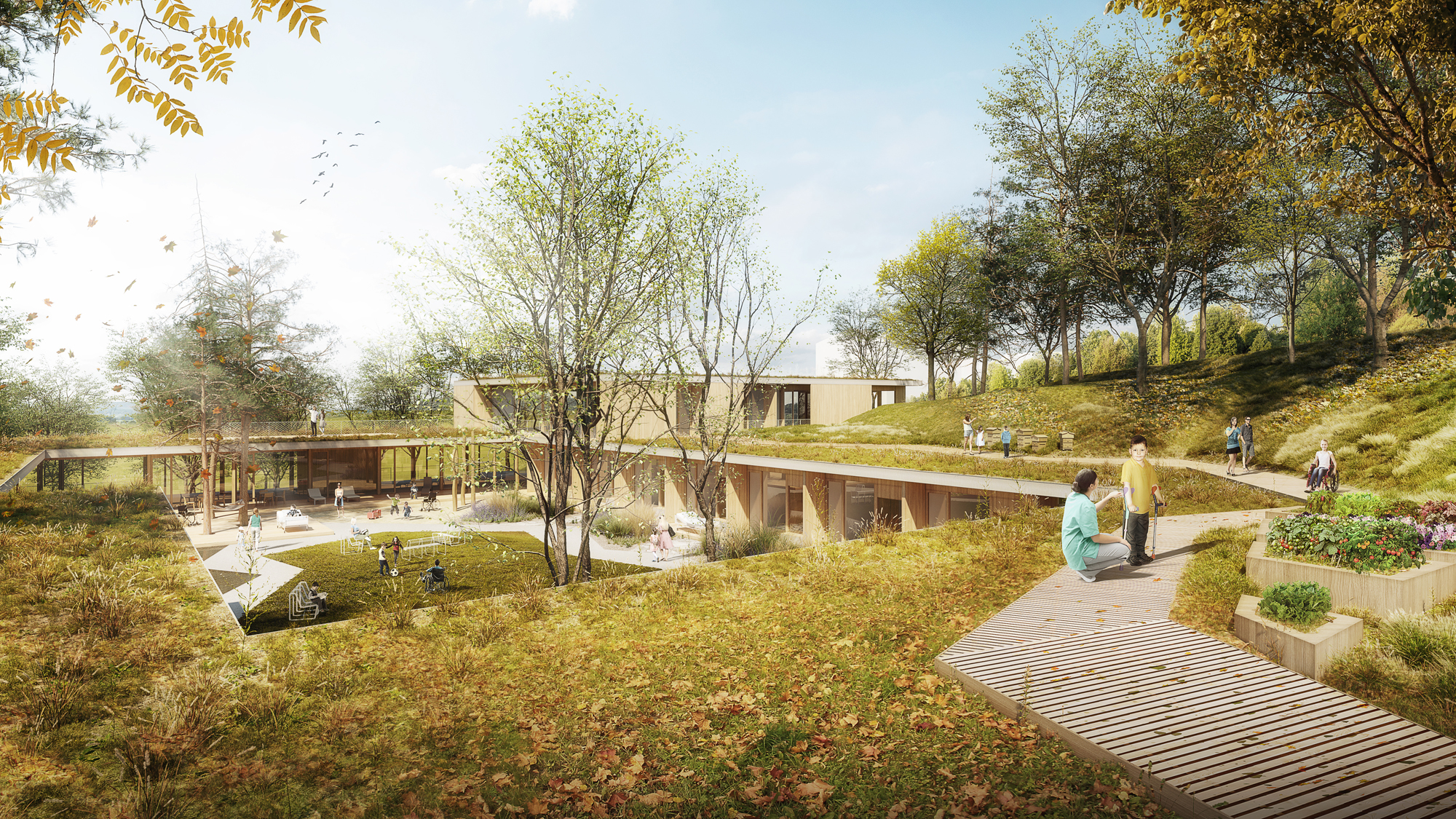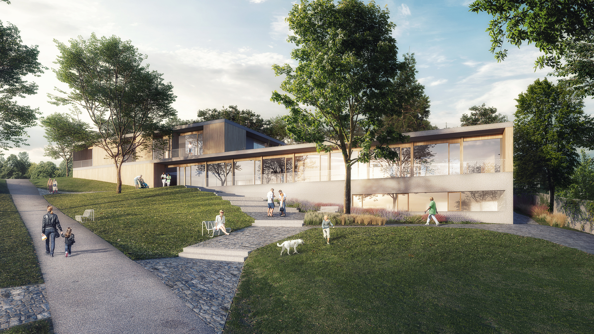 ostatními rodiči. Každý pokoj má svou vlastní terasu s výhledem do okolního parku. Velká střešní terasa s panoramatickým výhledem na město může sloužit pro společenské akce, cvičení, společné pozorování hvězd a nebo k relaxaci. Vyhlídkový chodník po střechách domu vede ke kapli na vrcholku svahu. Podél něj jsou navrženy zvýšené záhony pro pěstování bylinek a zeleniny, komunitní včelí úly, hmyzí hotel a pod.