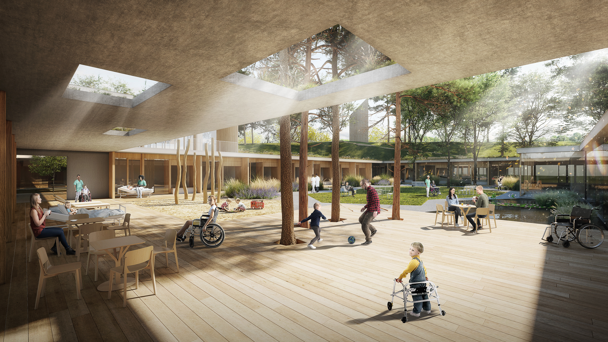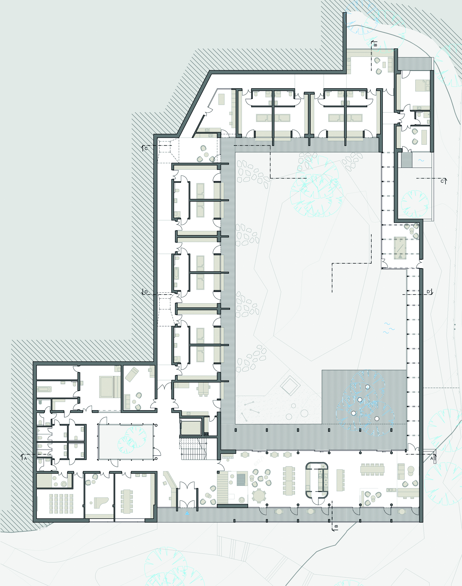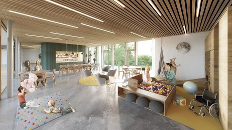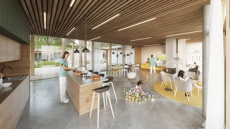 - Společenská část, místnosti denních aktivit, dílny, denní stacionář a vnitřní atrium.