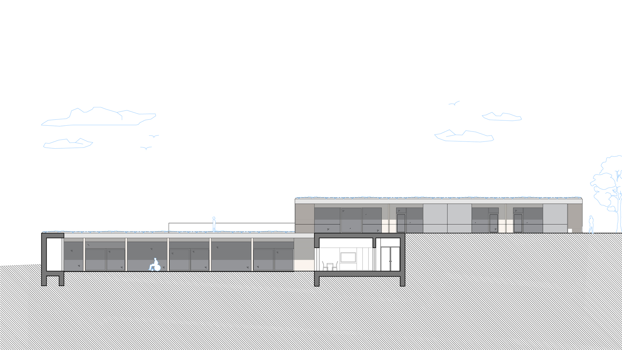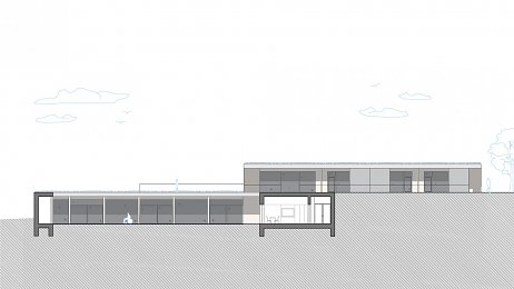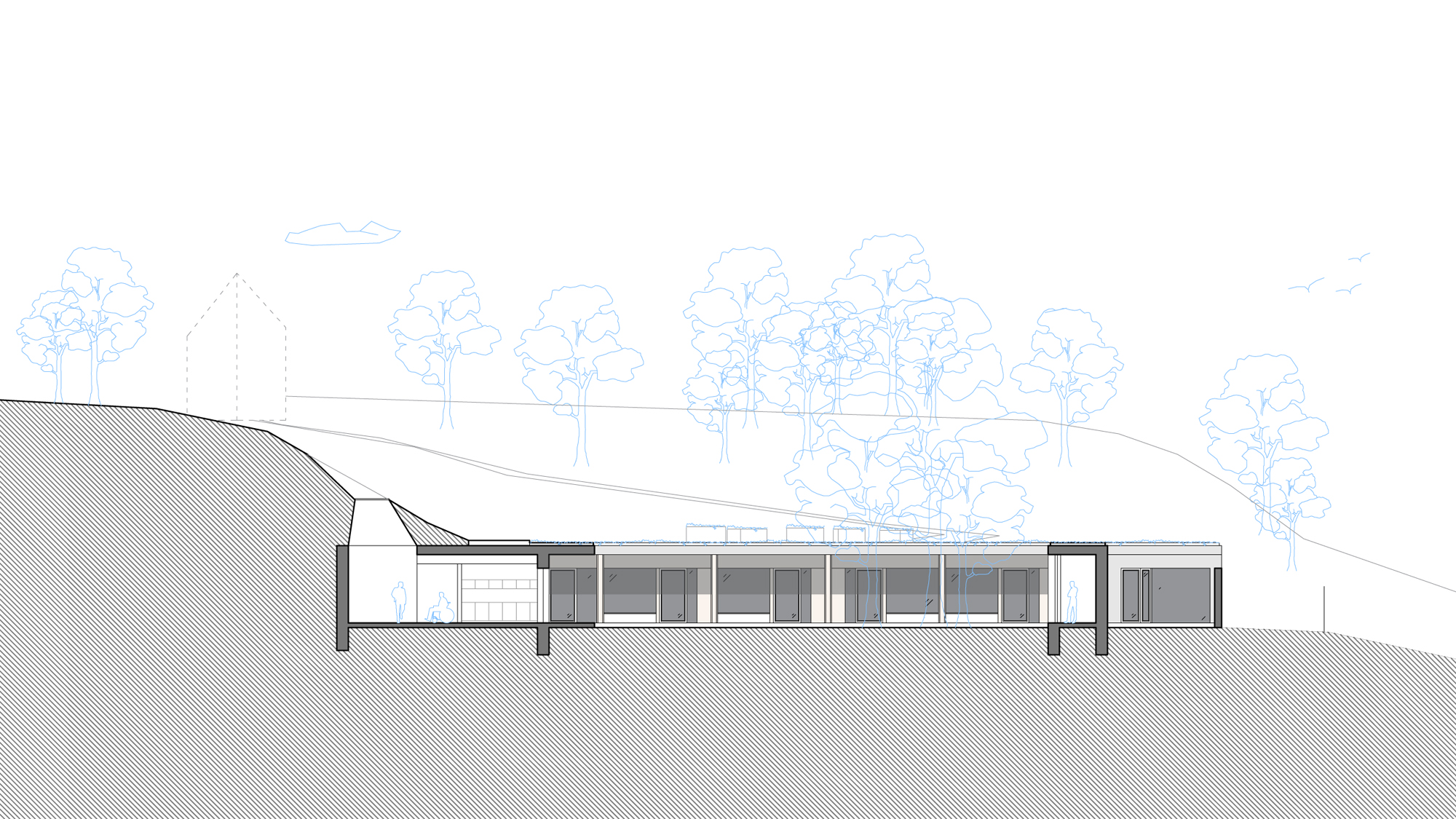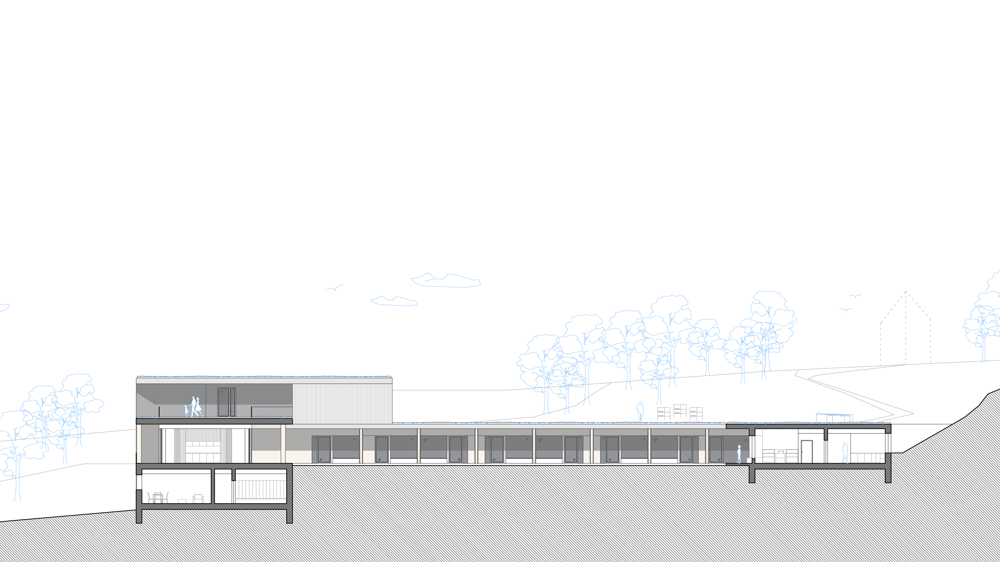 zázemí, sklady bez nutnosti denního osvětlení jsou navrženy v zadní části pod terénem.