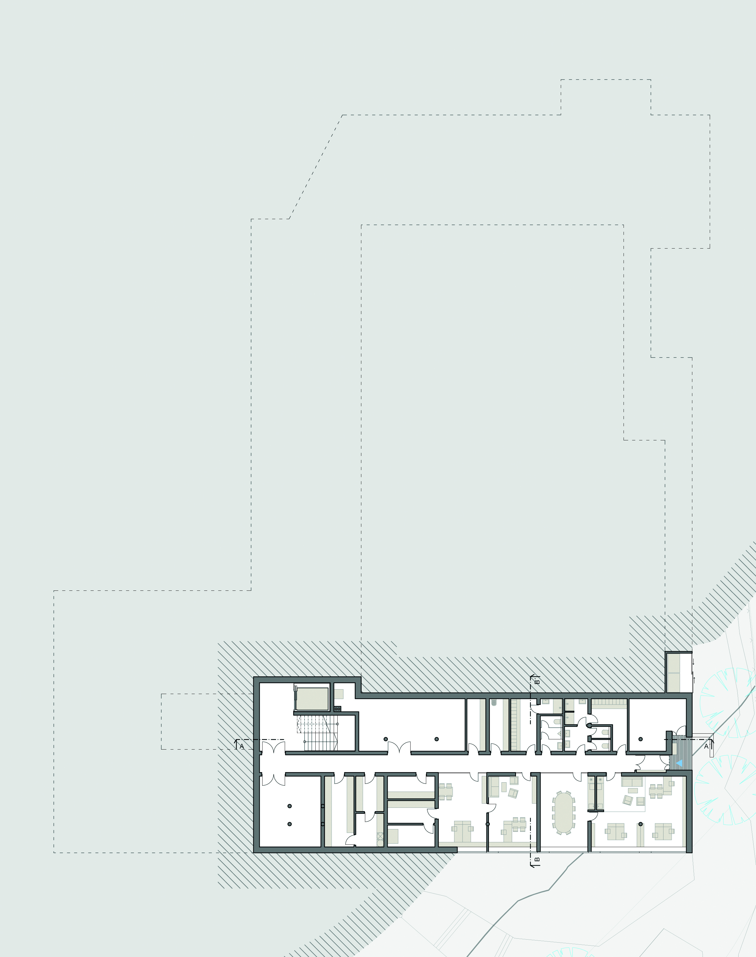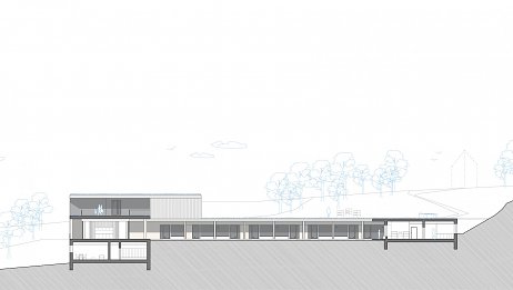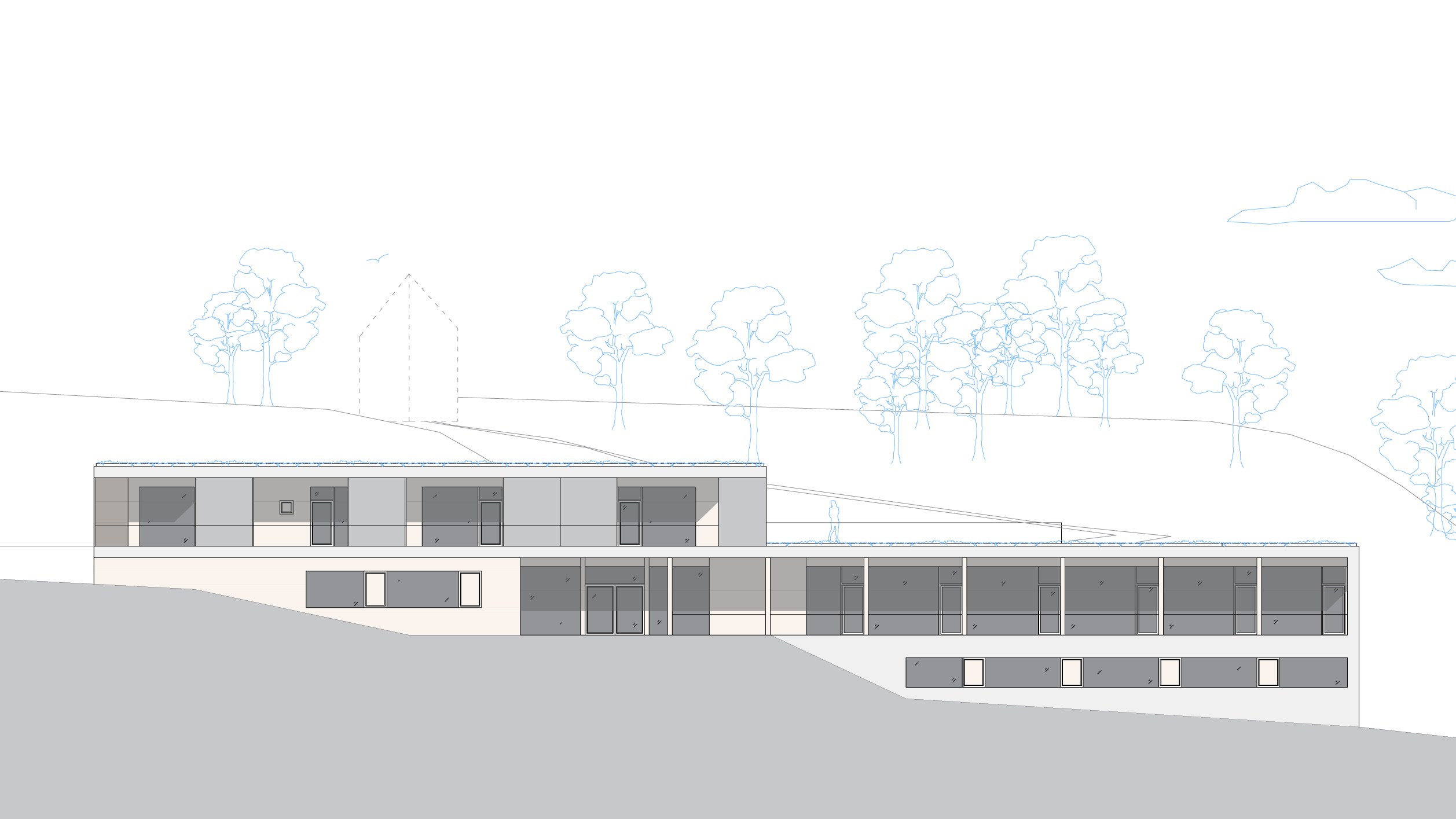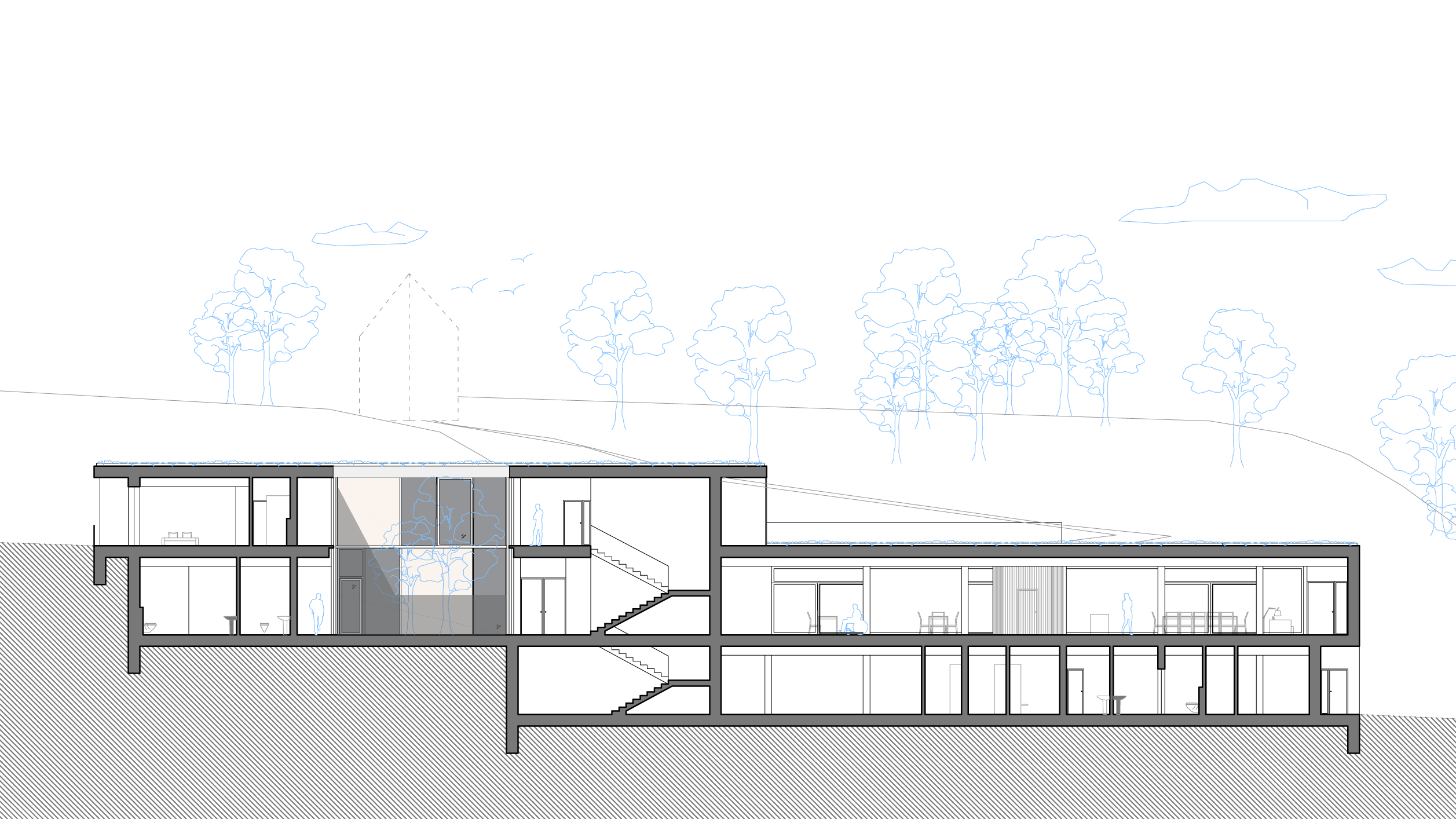 zázemí, sklady bez nutnosti denního osvětlení jsou navrženy v zadní části pod terénem.