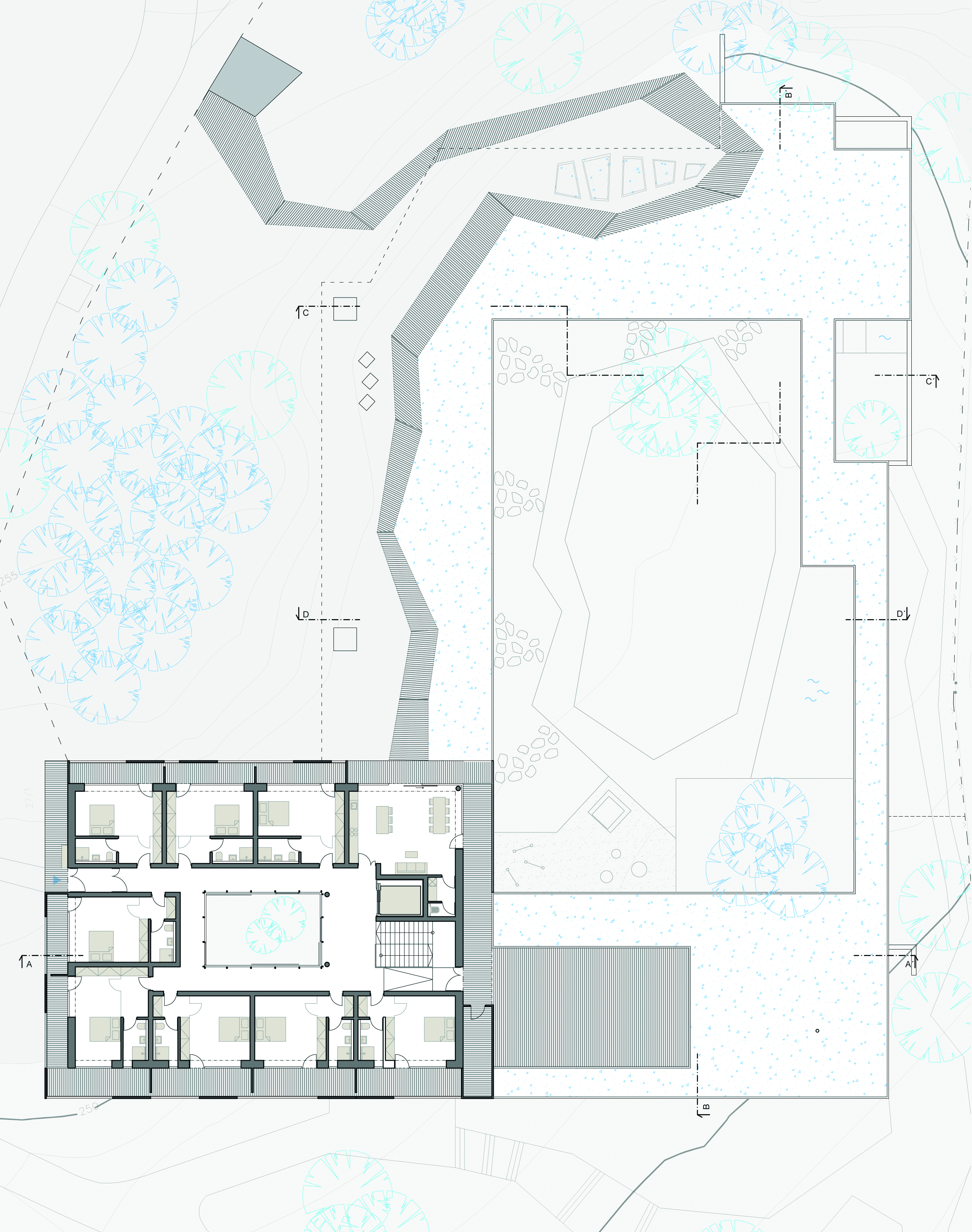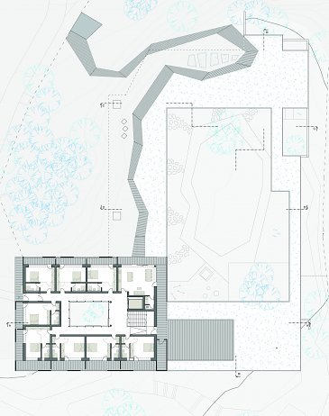 Půdorys 1. nadzemního podlaží se dělí na 3 provozní celky - veřejnou část, pokoje pro děti a byt posledního rozloučení. Celky jsou vzájemně propojeny a obchozí kolem centrálního pobytového atria. To poskytuje obyvatelům prostor pro společné setkávání v rámci komunity a zároveň je odděleno od vnějšího areálu parku. Místnosti kolem menšího vnitřního atria slouží pro denní aktivity