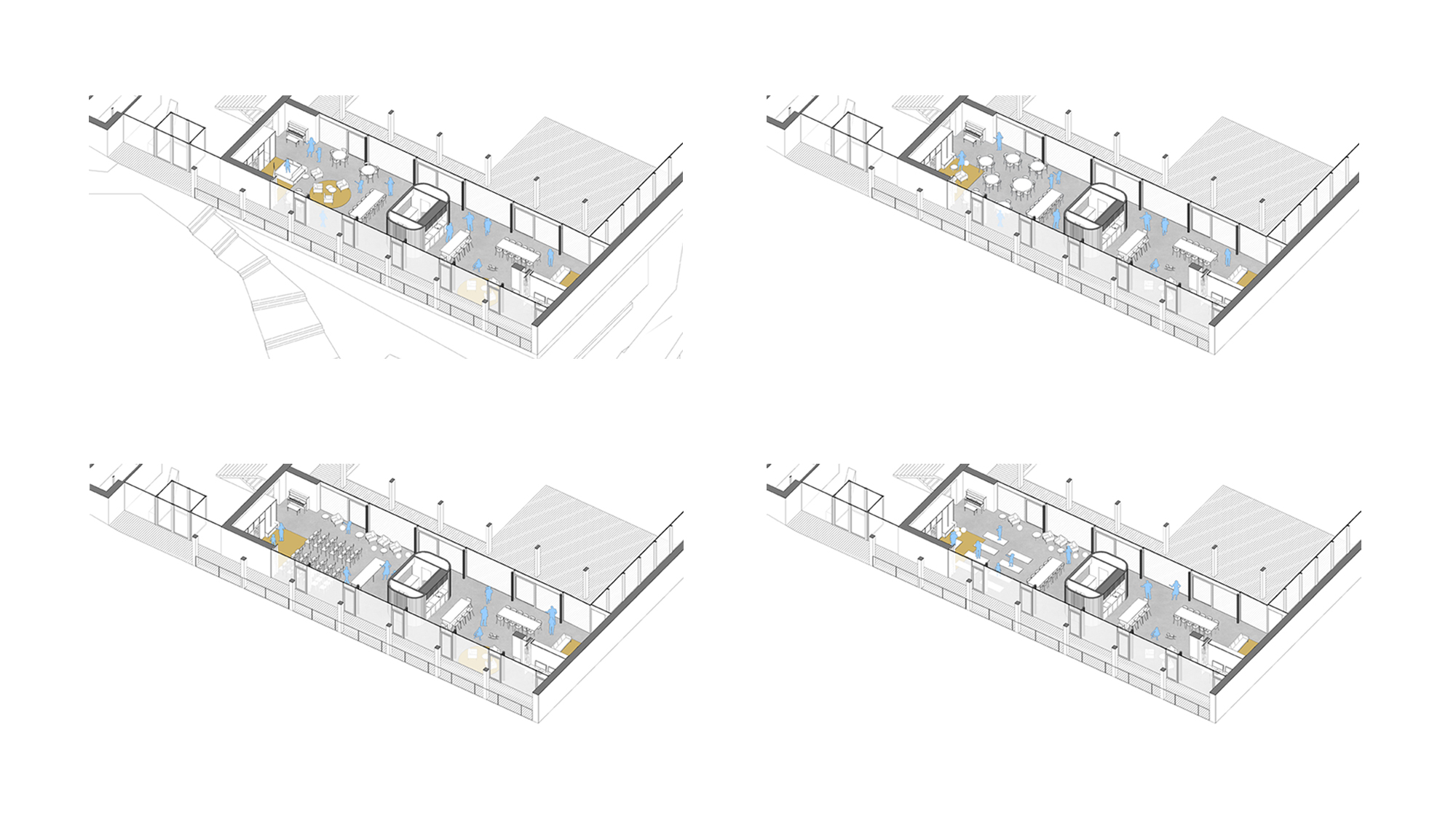 - kino, dílny, muzikoterapie, snoezelen, wellness apod. Hlavní společenská místnost je pomyslně rozdělena na veřejnou a poloveřejnou část určenou pro obyvatele hospice. Je navržena jako multifunkční prostor sloužící všem potřebám obyvatel i návštěv.