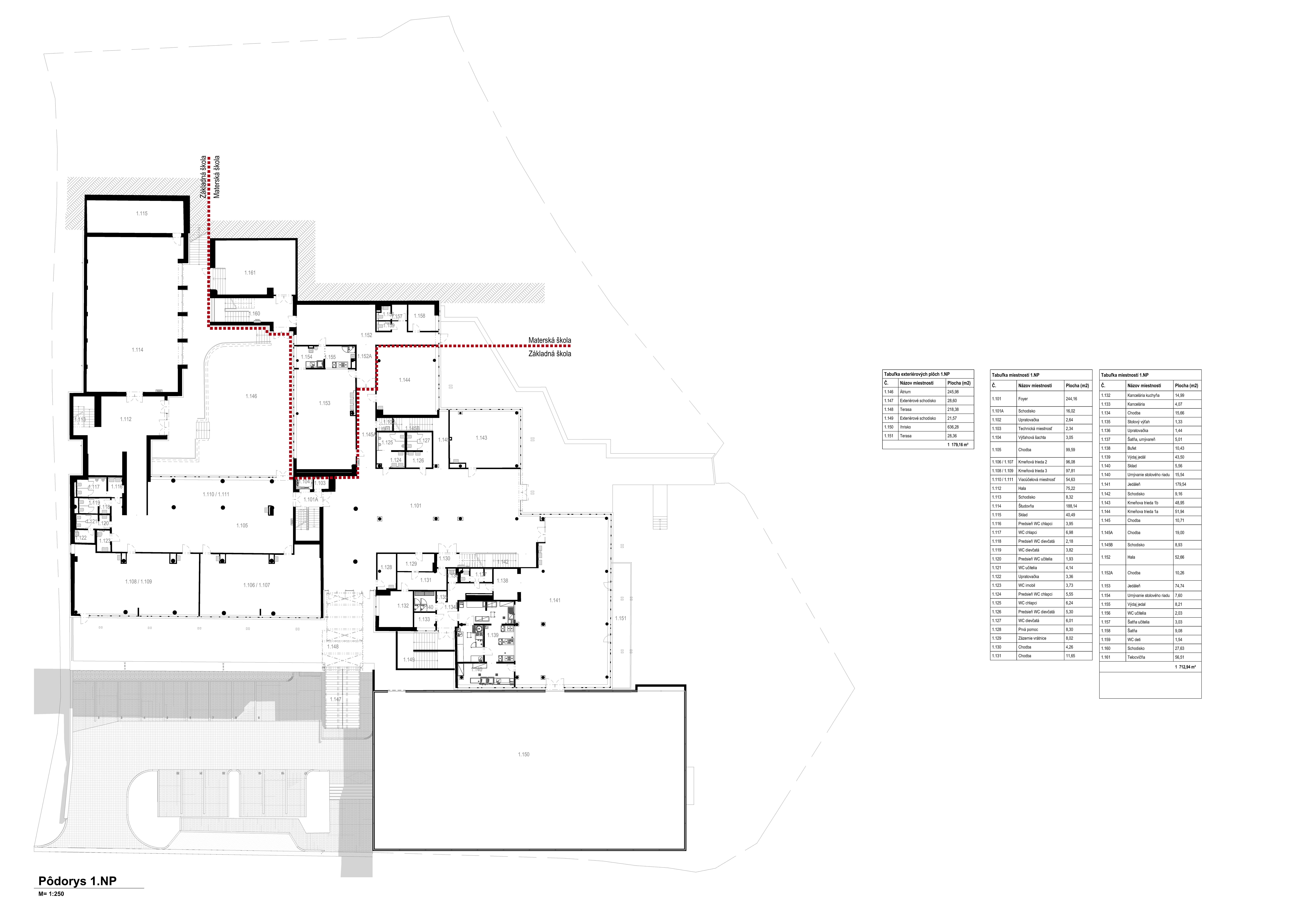1. NP zastrešuje vstupnú halu, jedáleň, kmeňové učebne 1. stupňa základnej školy, multifunkčnú študovňu a vstup do materskej školy v bloku C. S pôvodným átriom medzi blokmi C, D, E sa počíta na exterérové aktivity.