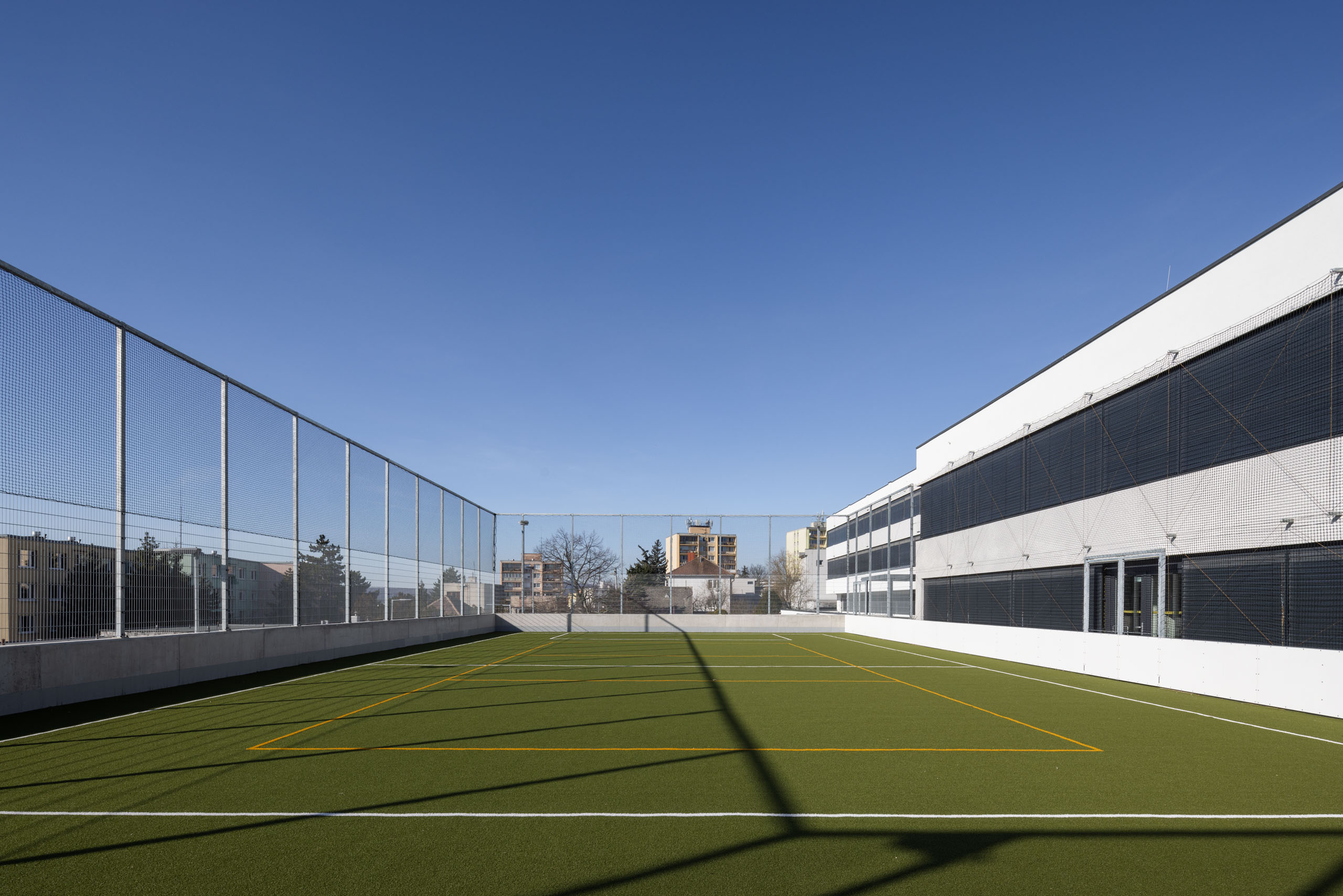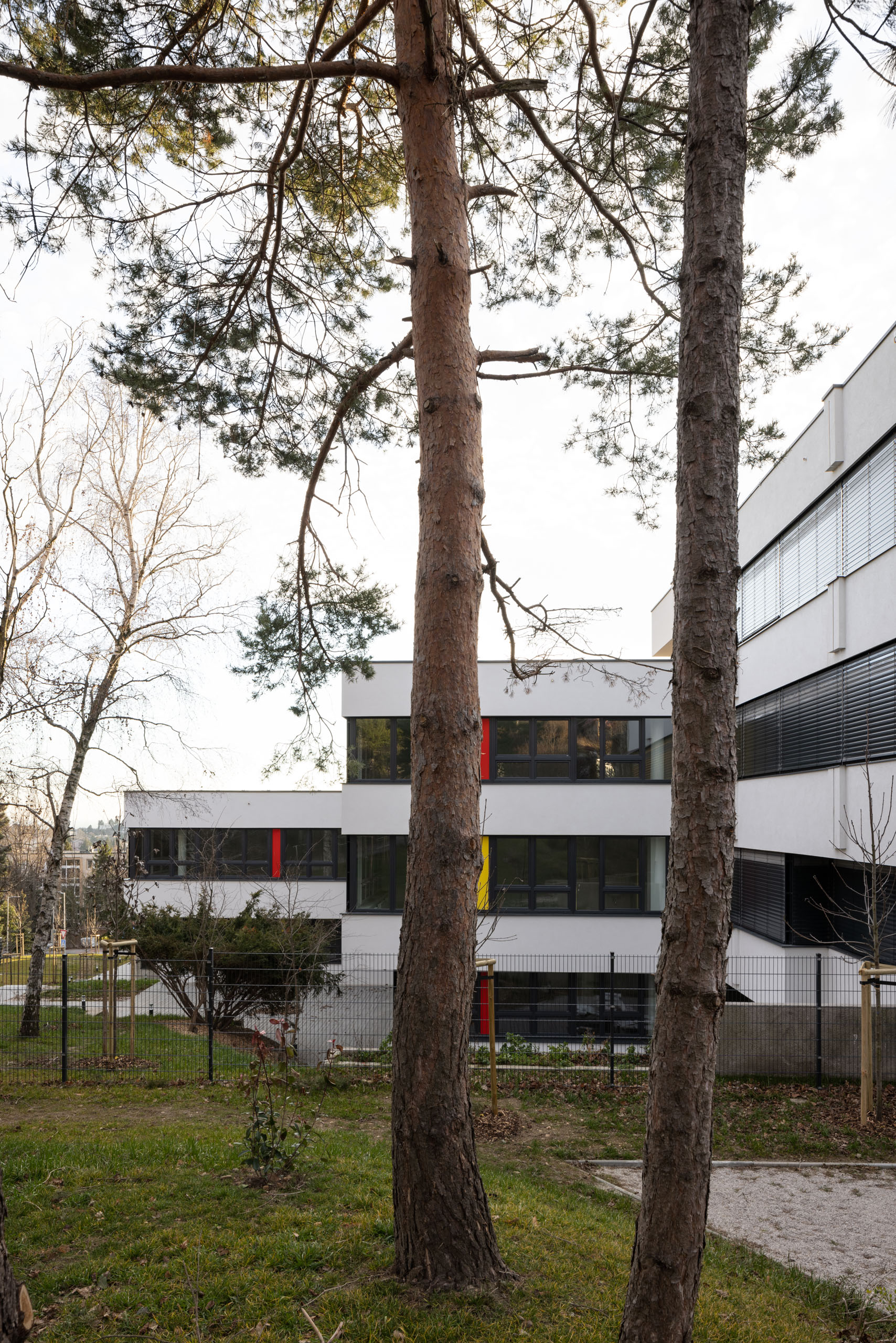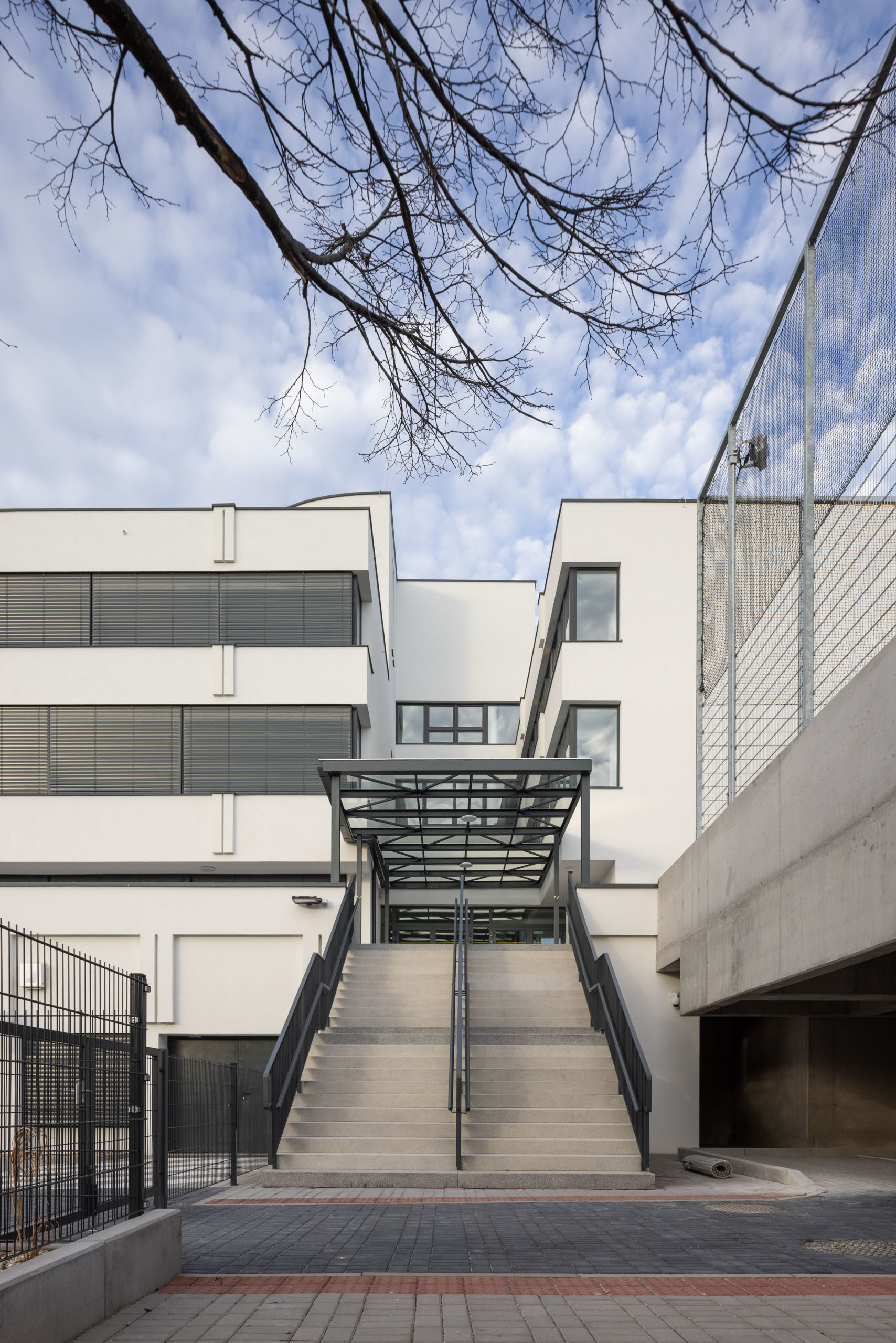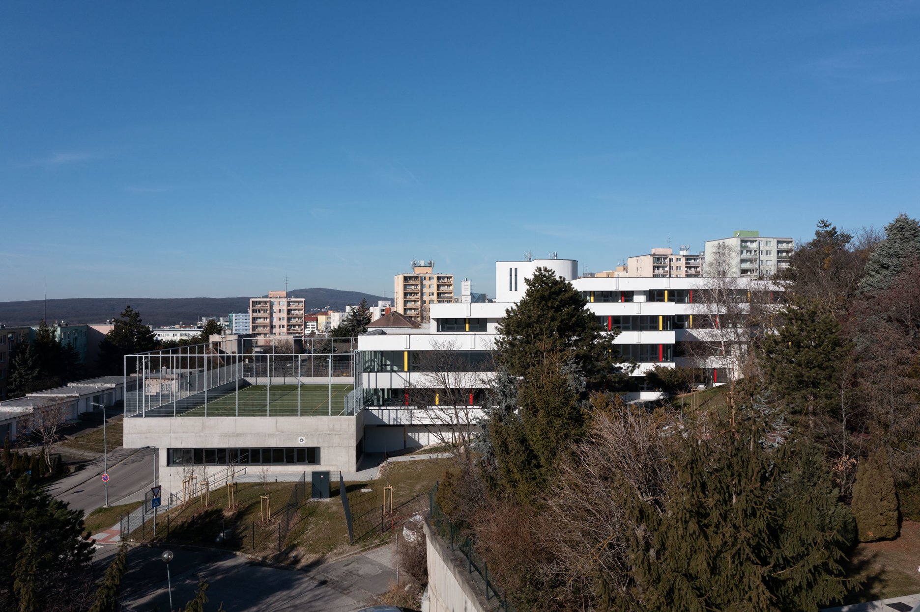 Architekti zachovali pôvodnú skladbu blokov, stupňovito osadených v stúpajúcom teréne. Jasne čitateľný novotvar tvorí telocvična zapustená do terénu, vysunutá až na hranu ulice.