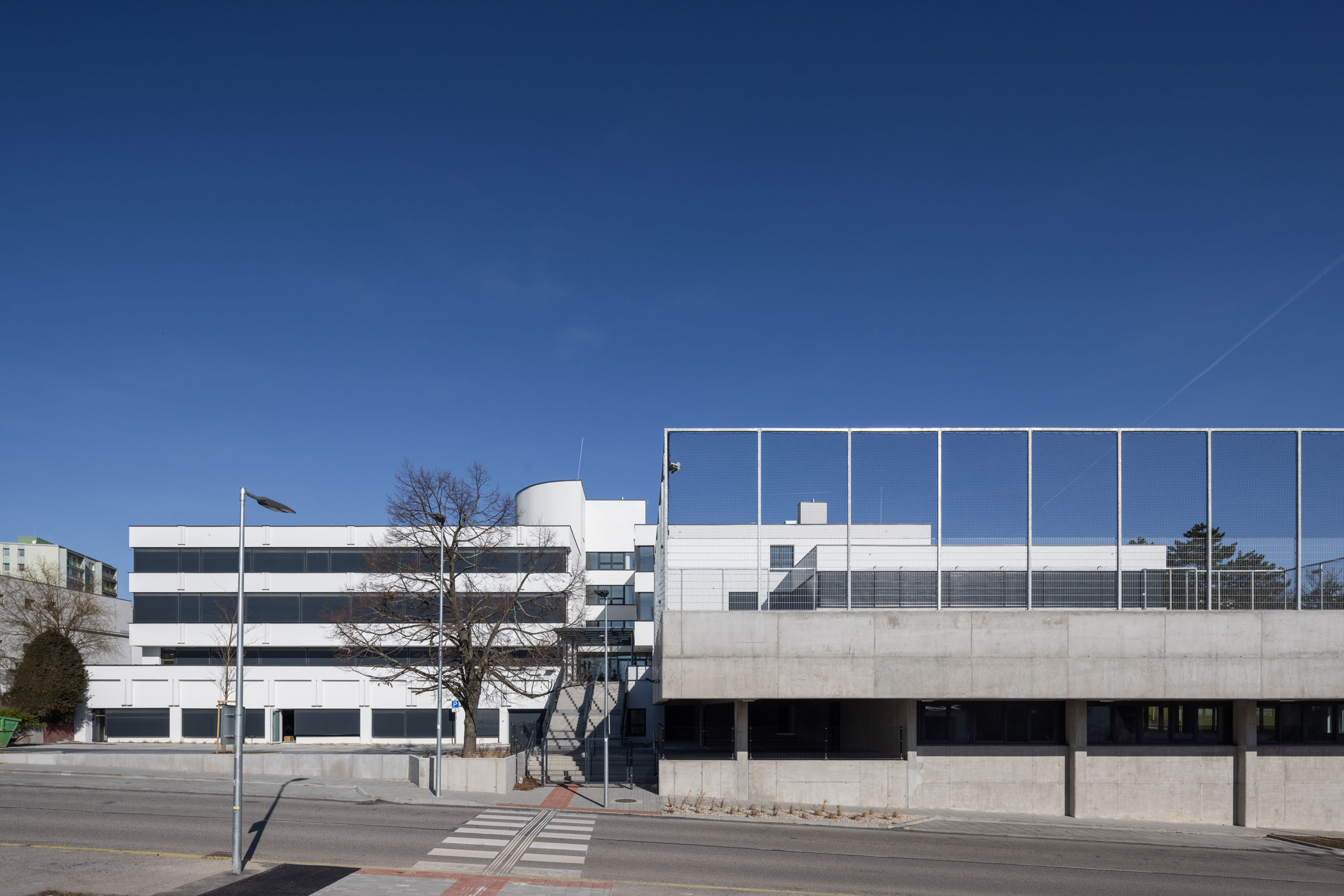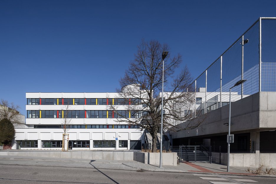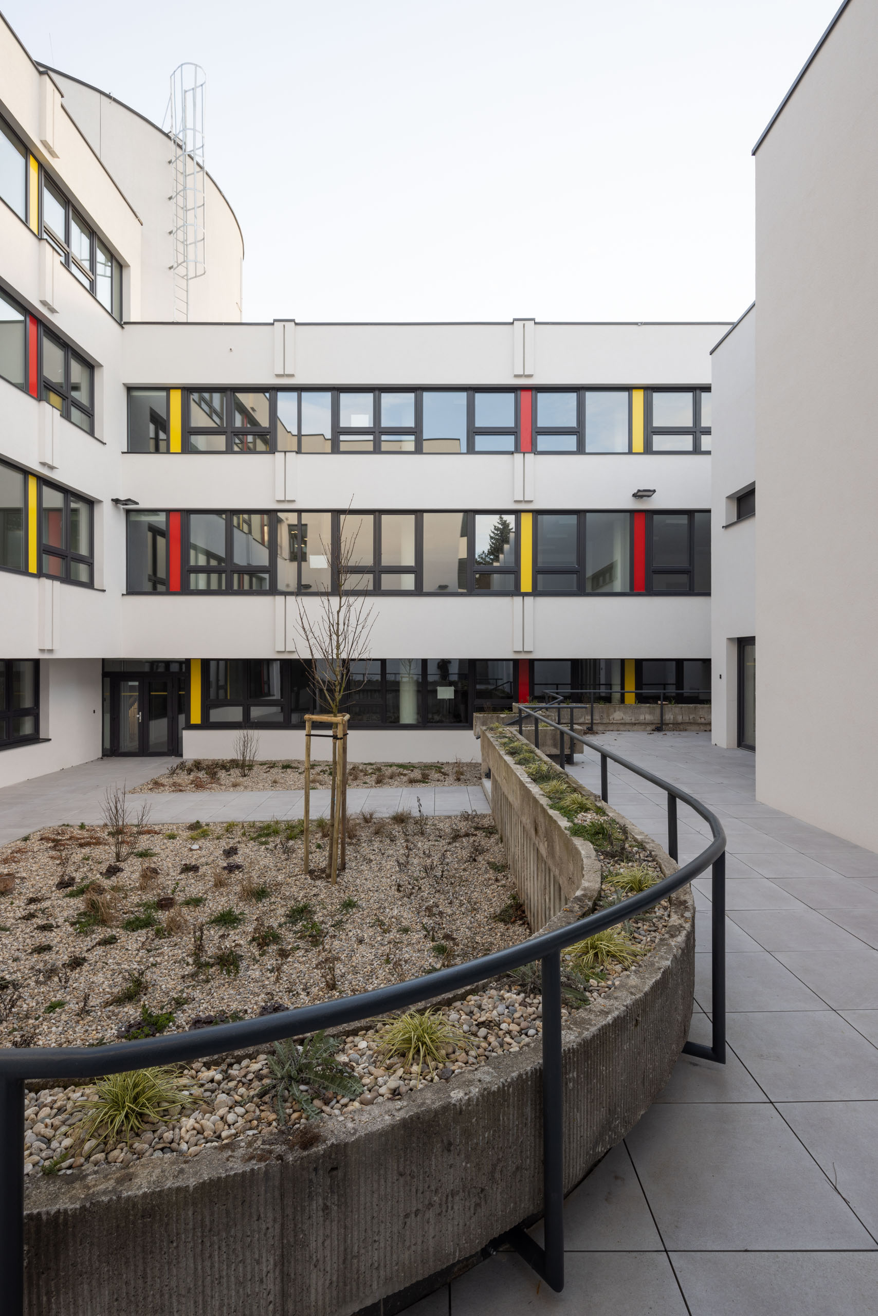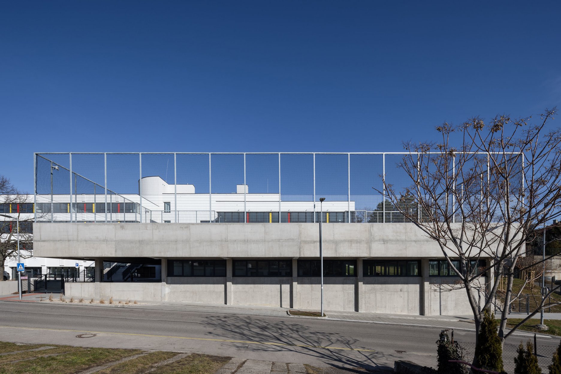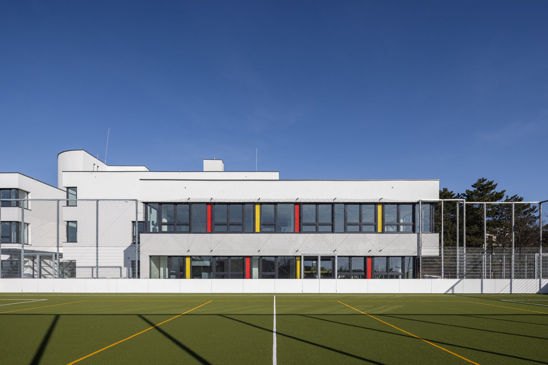 Architekti zachovali pôvodnú skladbu blokov, stupňovito osadených v stúpajúcom teréne. Jasne čitateľný novotvar tvorí telocvična zapustená do terénu, vysunutá až na hranu ulice.