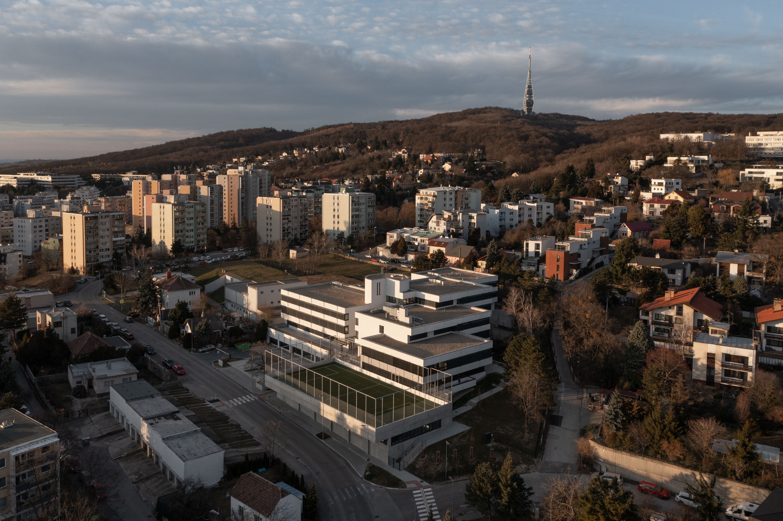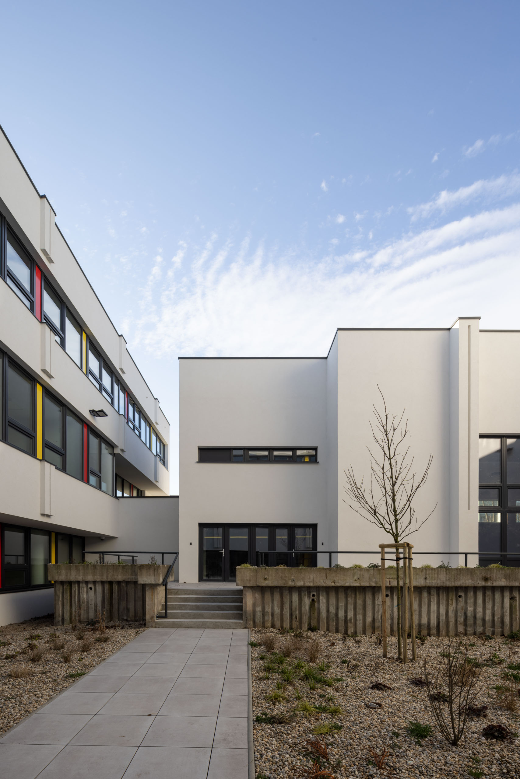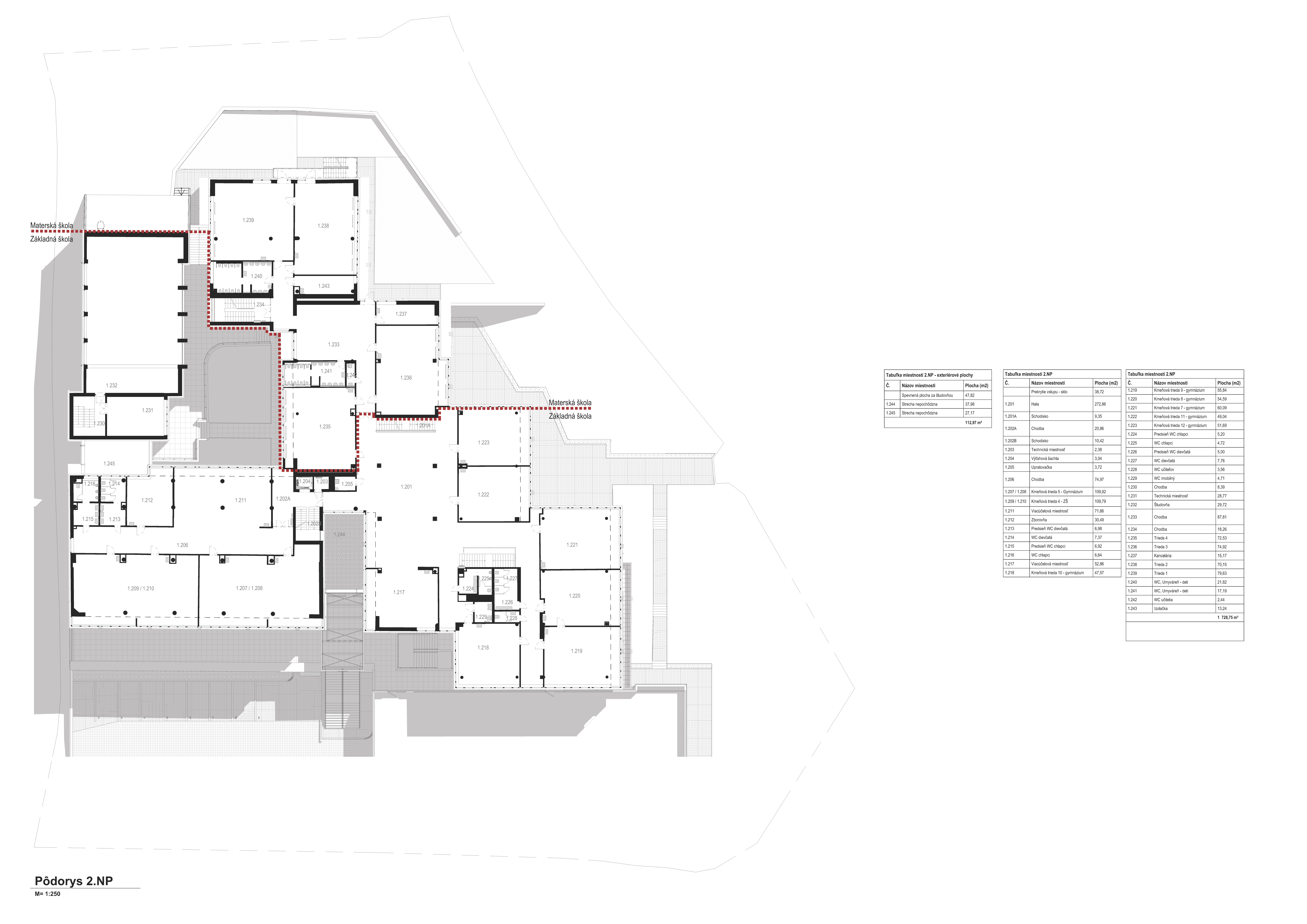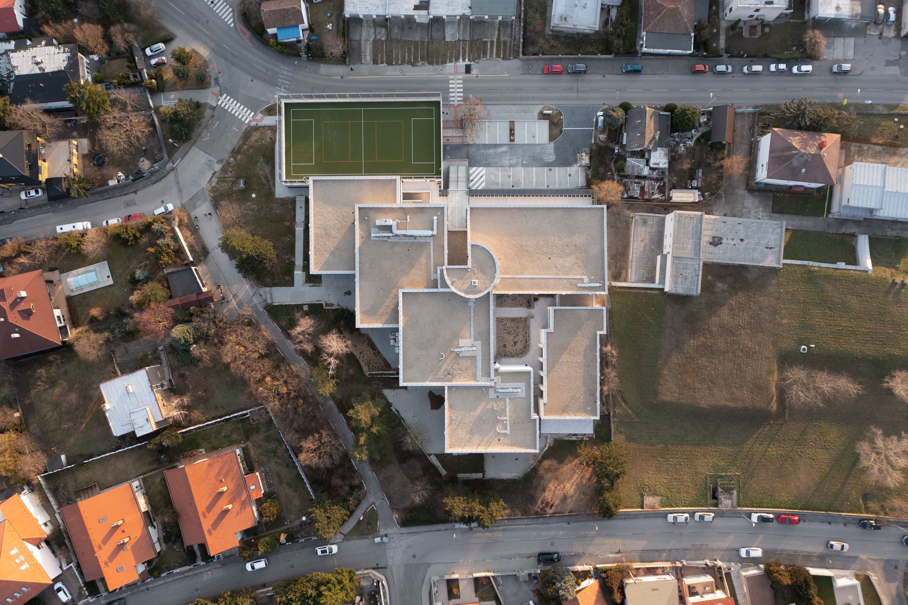 Architekti zachovali pôvodnú skladbu blokov, stupňovito osadených v stúpajúcom teréne. Jasne čitateľný novotvar tvorí telocvična zapustená do terénu, vysunutá až na hranu ulice.