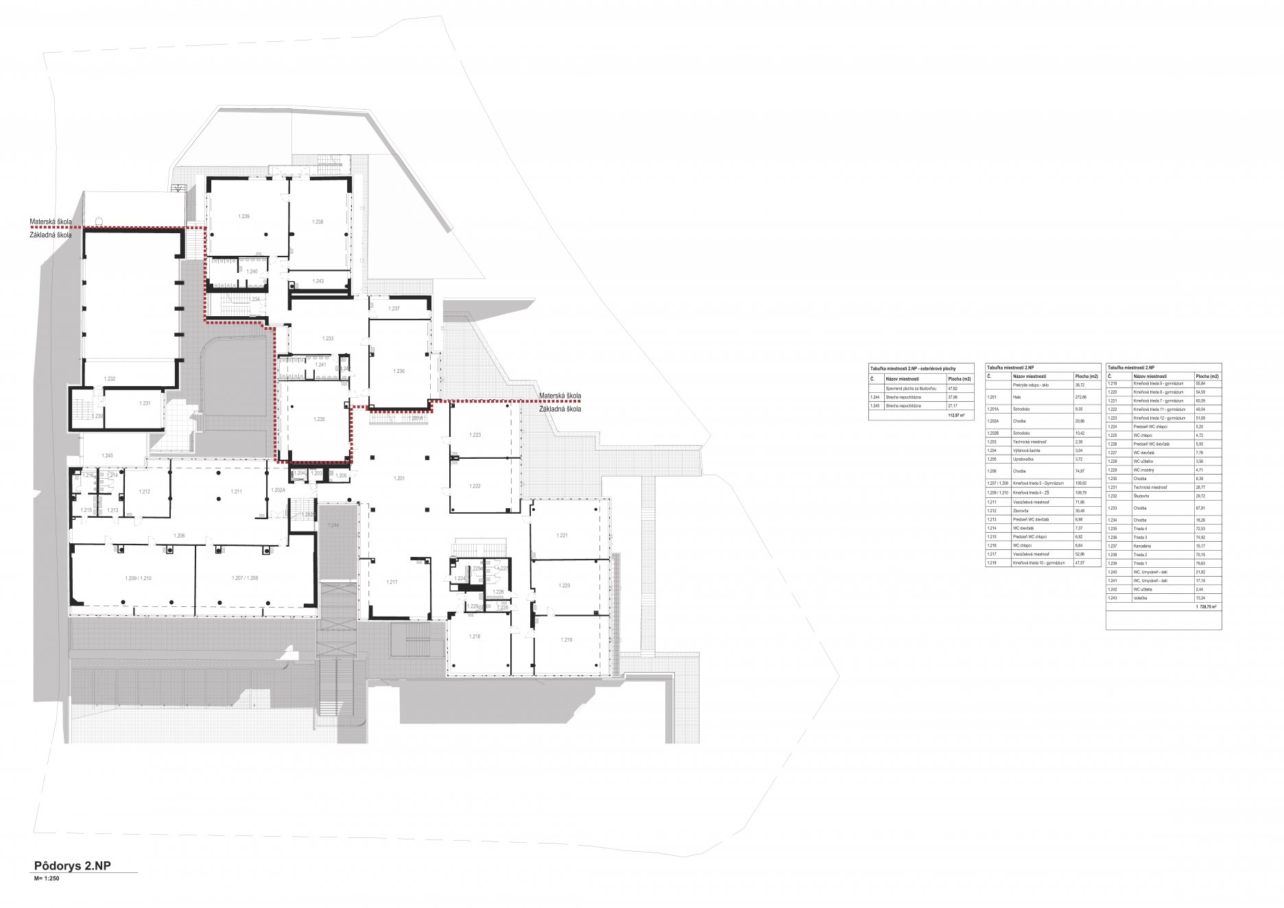 Na 2. NP sa v blokoch A, B a C nachádzajú kmeňové triedy 1. a 2. stupňa základnej školy a gymnázia a priestory pre učiteľov. Bloky C a D slúžia škôlke s priamym prístupom do záhrady.