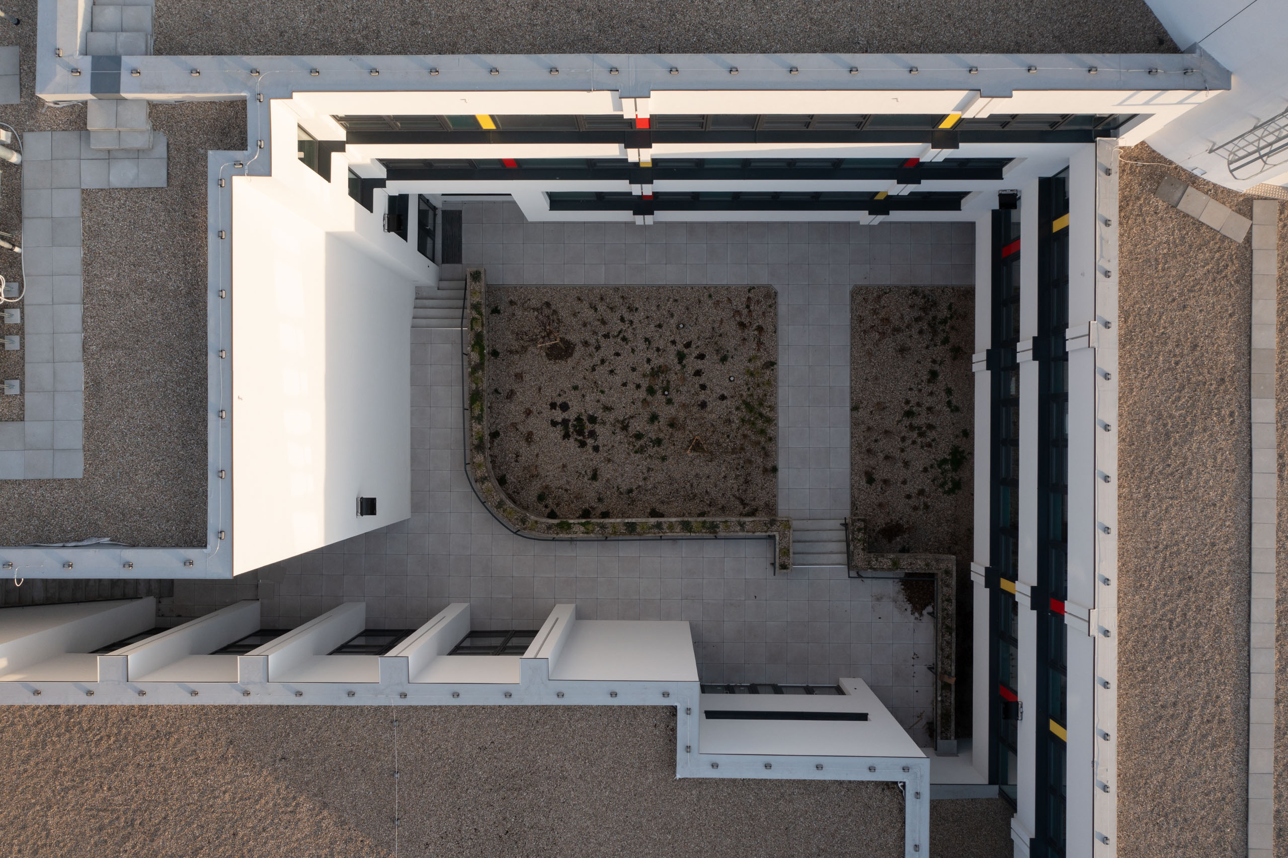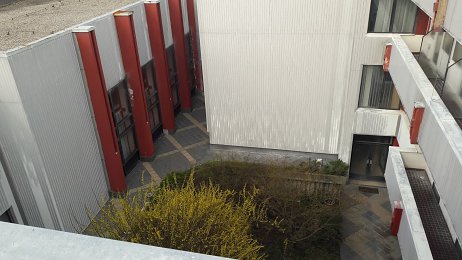 Dôležitým exteriérovým priestorom je aj átrium ohraničené blokom školy a škôlky.