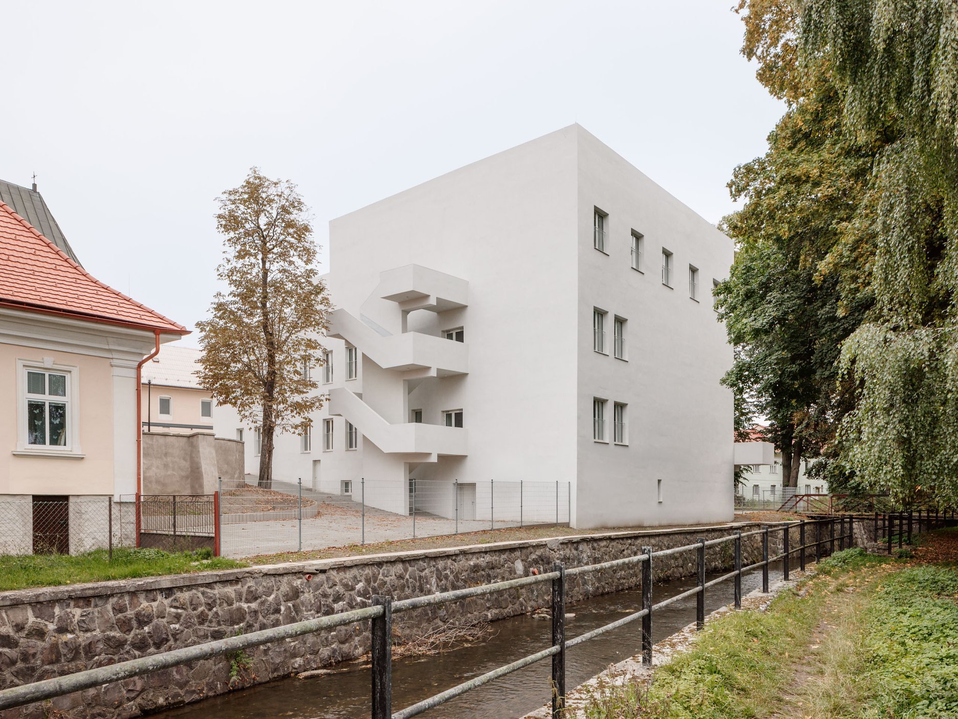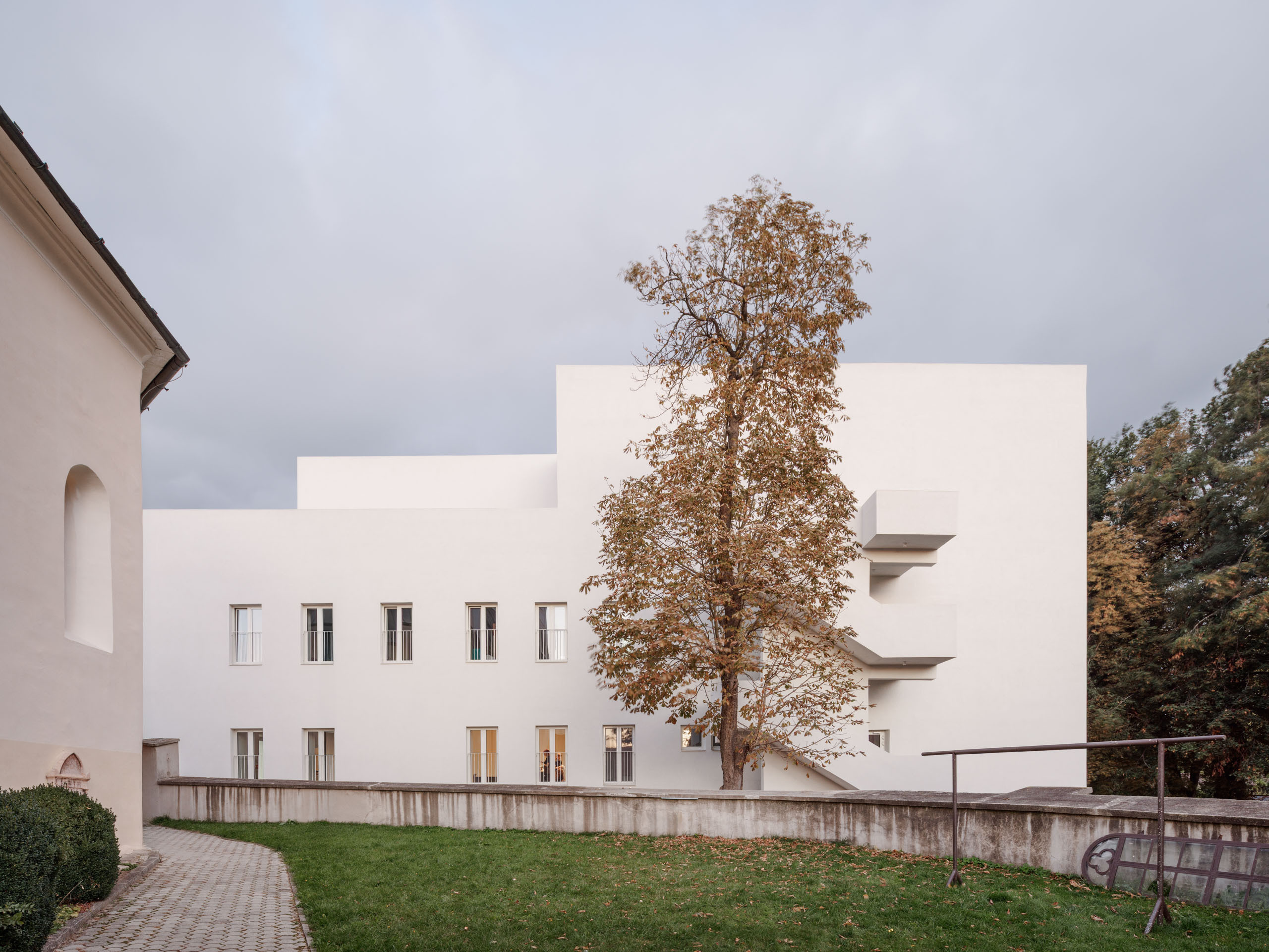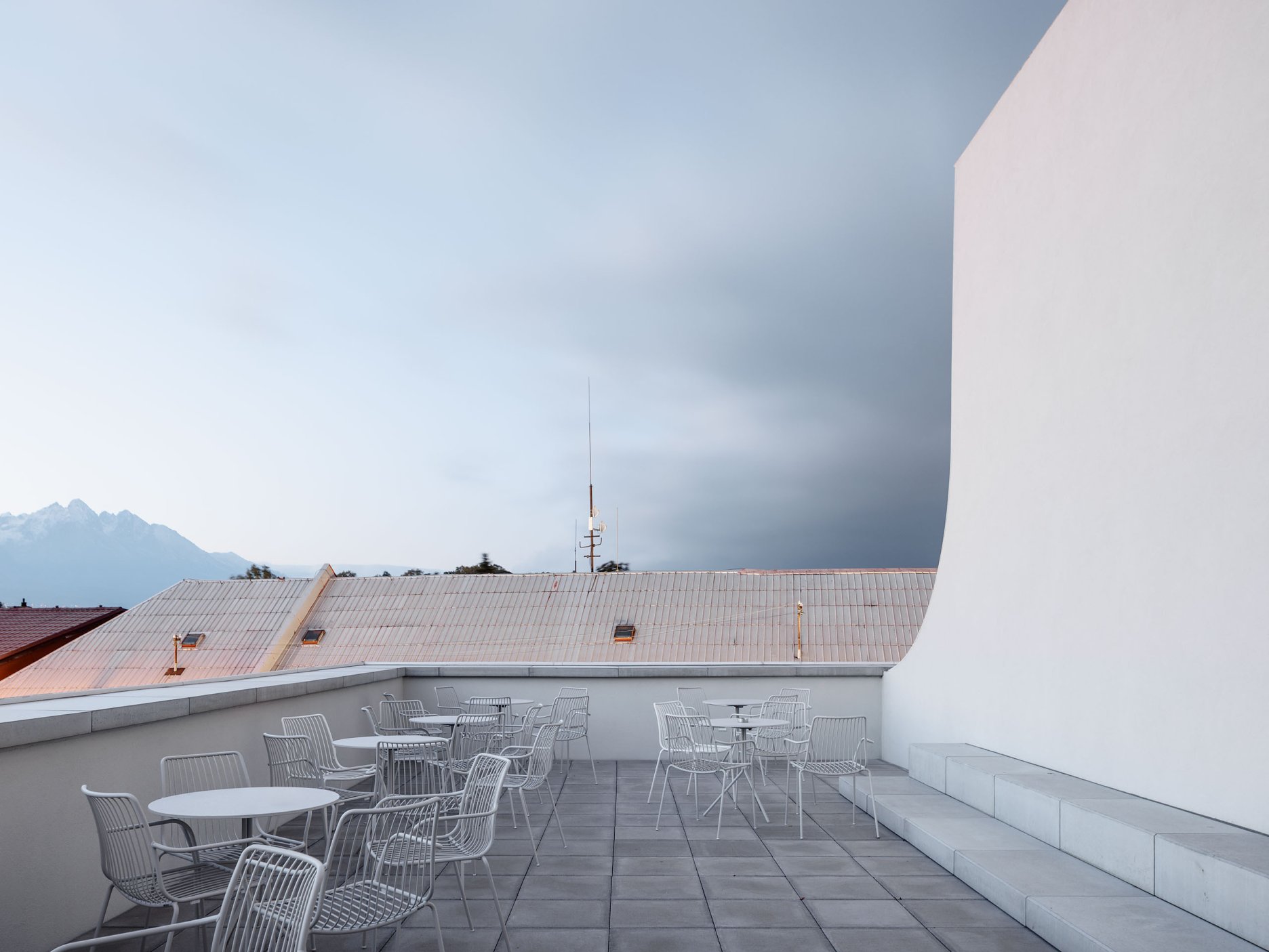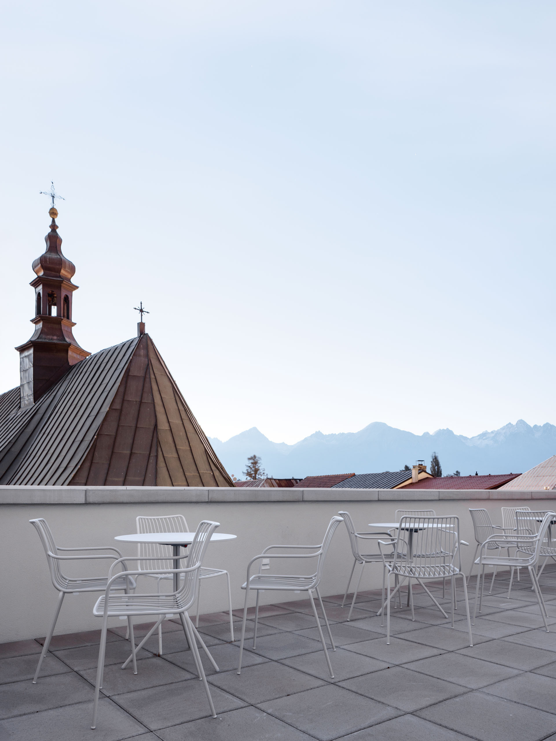 Premodelovaním strešnej krajiny, zmenšením objemu strešného podlažia a kontextuálnou úpravou strešnej roviny smerom do ulice získal objekt jasný a zapamätateľný výraz, ktorý rešpektuje svoj najdôležitejší susedný prvok. Na mieste pôvodného exteriérového schodiska na východnej strane sme navrhli nové vertikálne komunikačné jadro s objemom tvarovaným zaobleniami. Zaoblenia, artikulujú aj hlavný vstup do objektu a modelovanie strešnej krajiny. Modelácia architektonickej formy pracuje s geometriou nadväzujúcou na zachované gotické klenby. Na východnej strane bola navrhnutá aj nová rampa s pokračovaním do balkóna orientovaného k Velickému potoku.