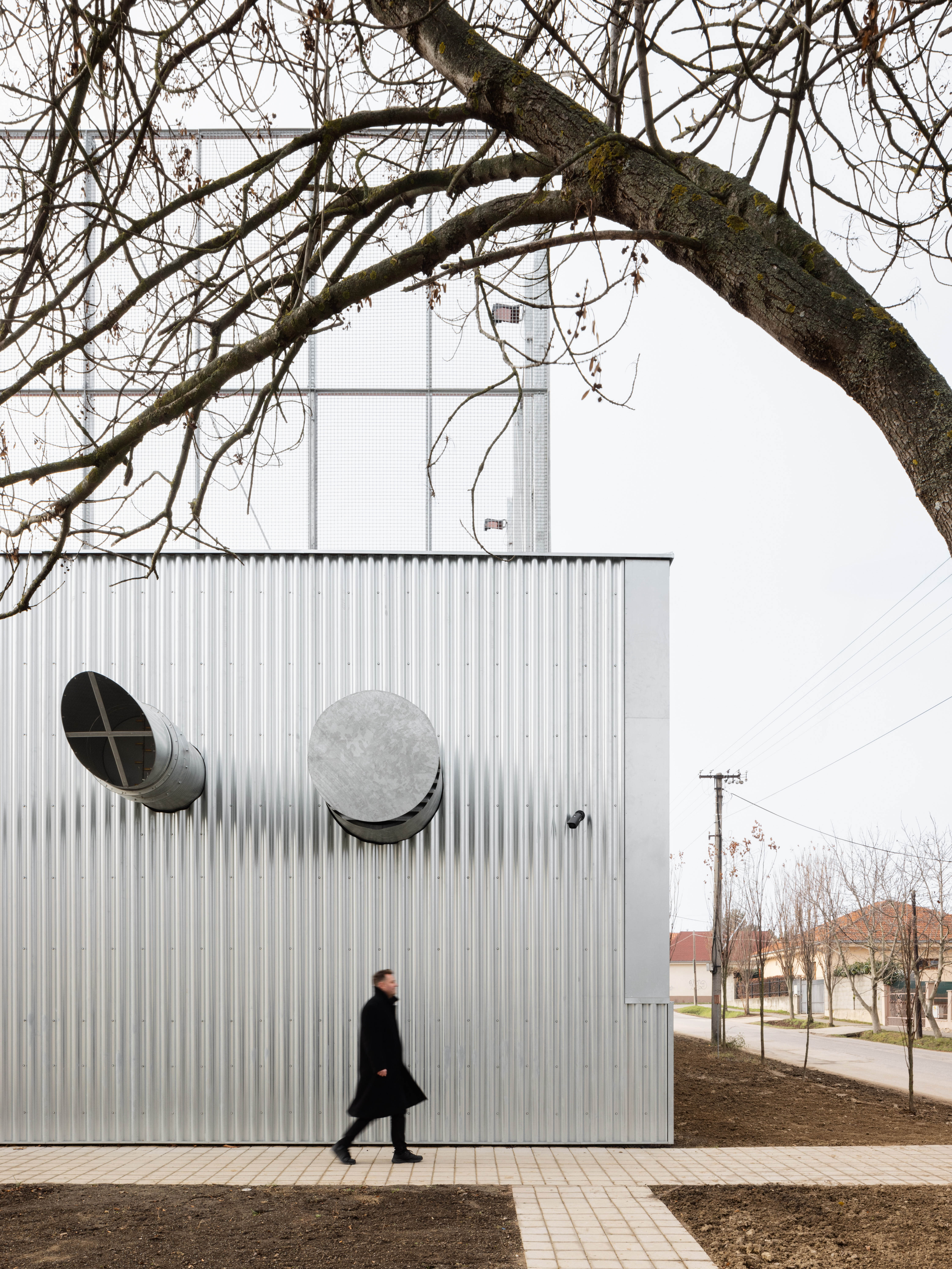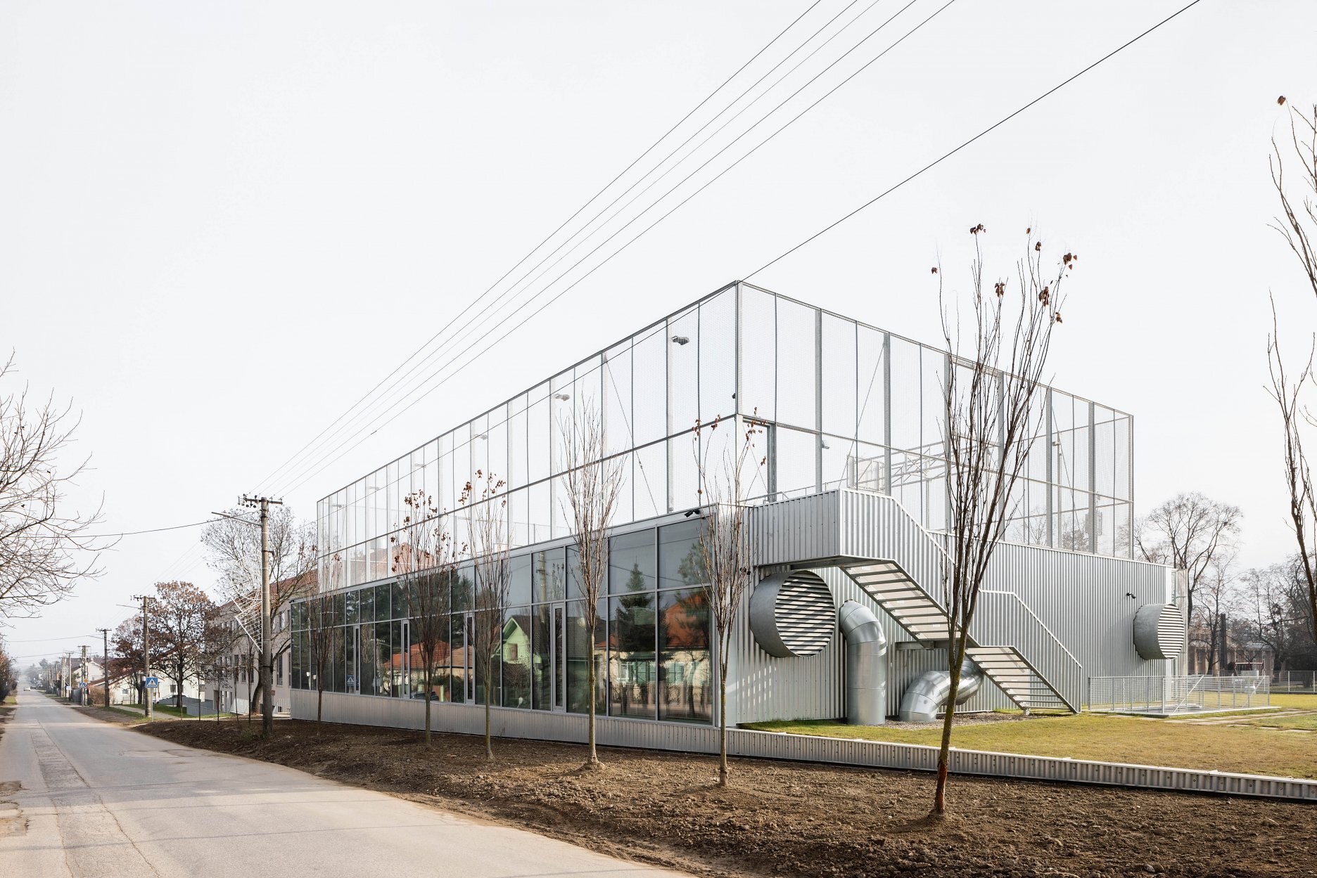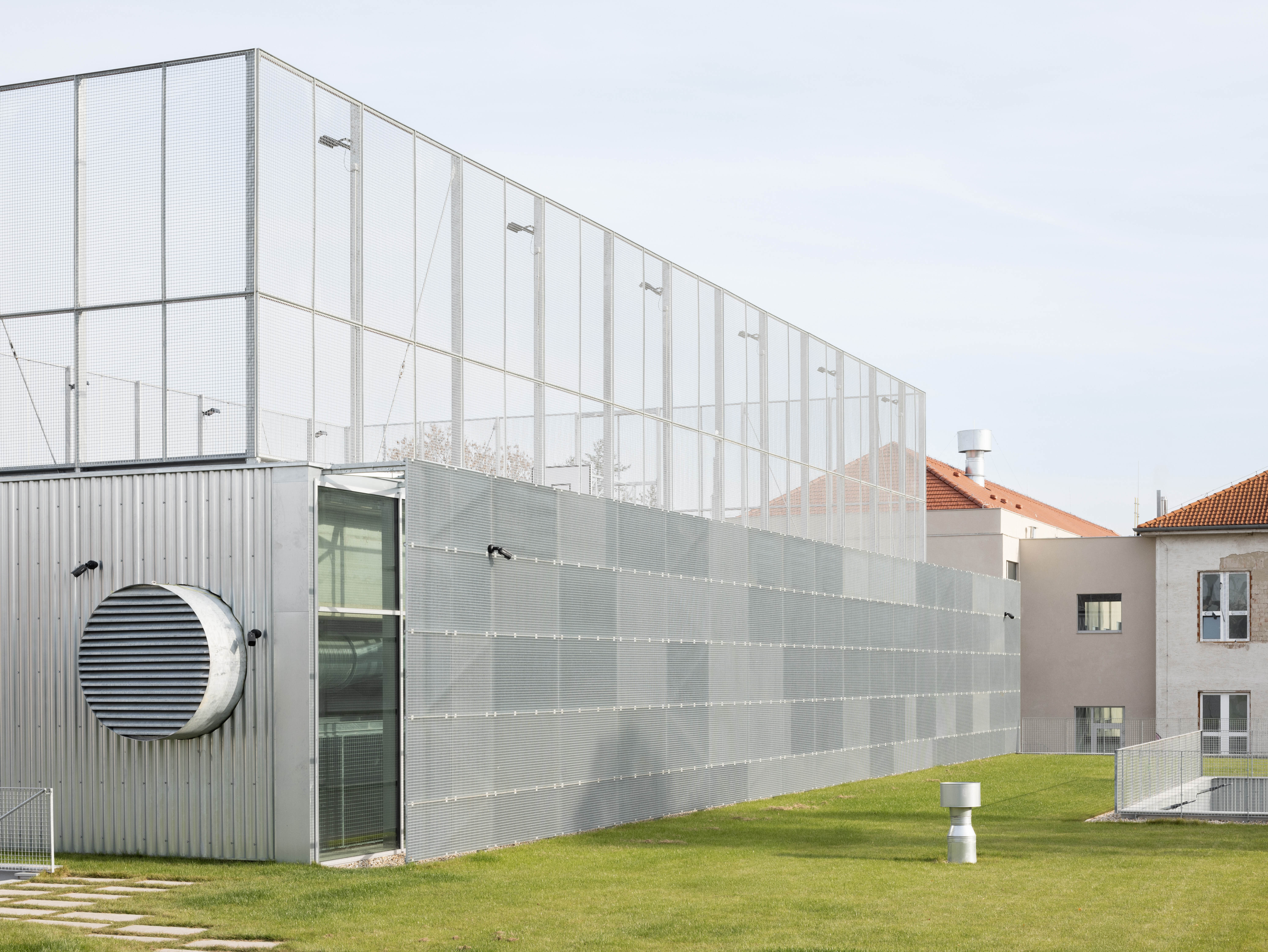 Práca architektov s dôrazom na efektívne a funkčné riešenie zadania sa odzkadľuje aj v technicistickom zovňajšku v podobe predsadenej fasády z vlnitého plechu.