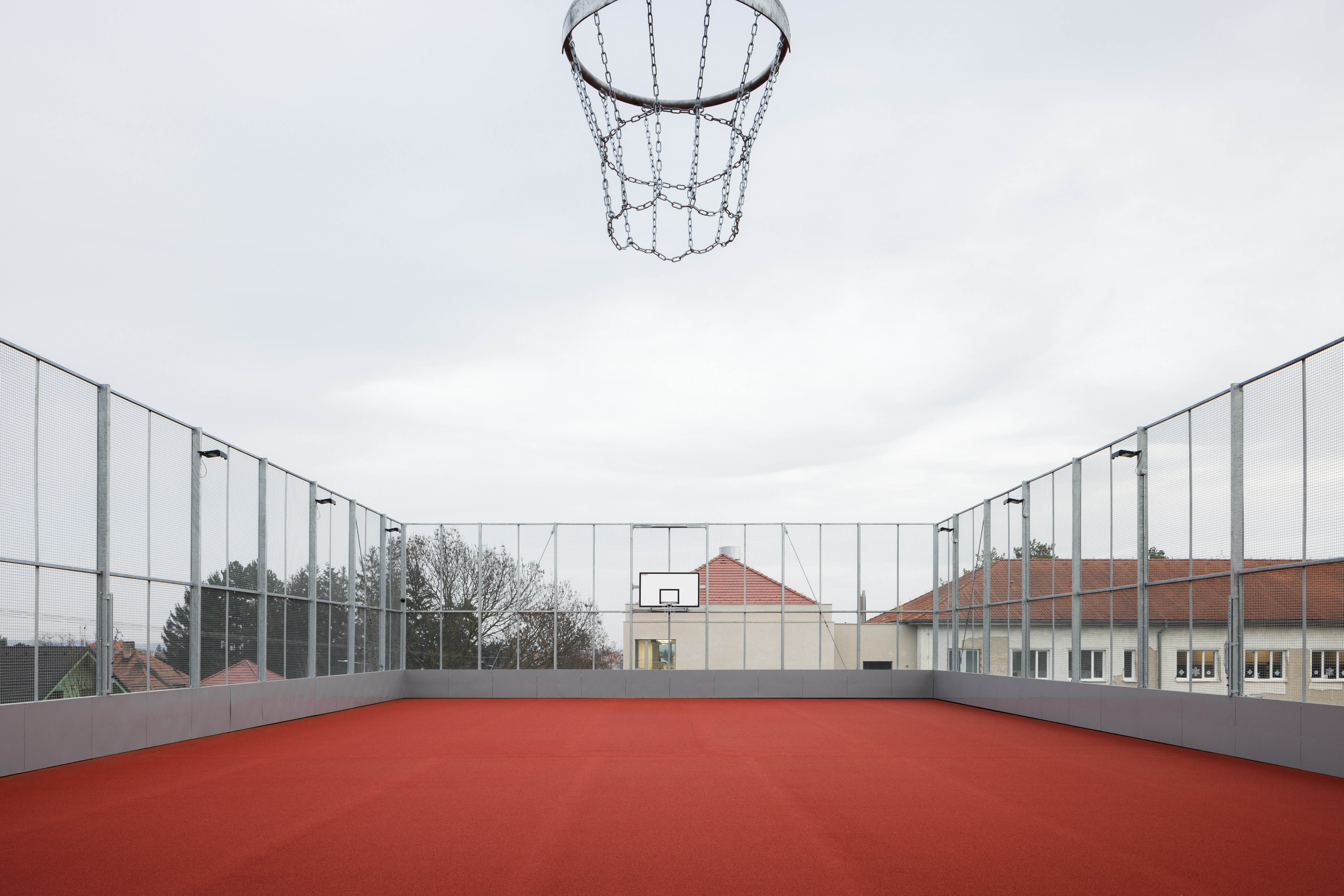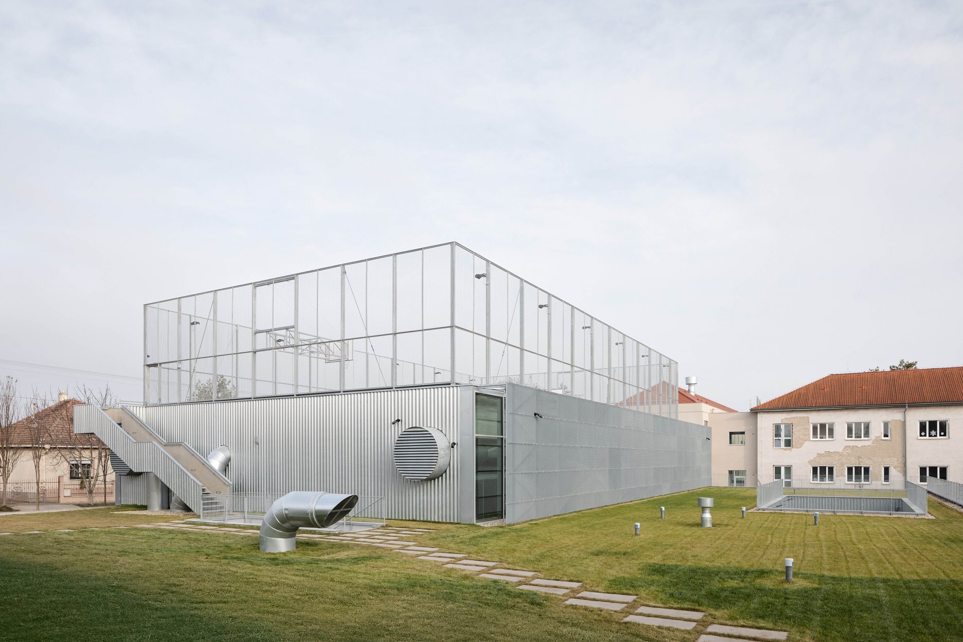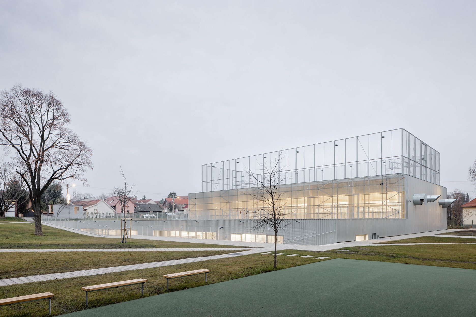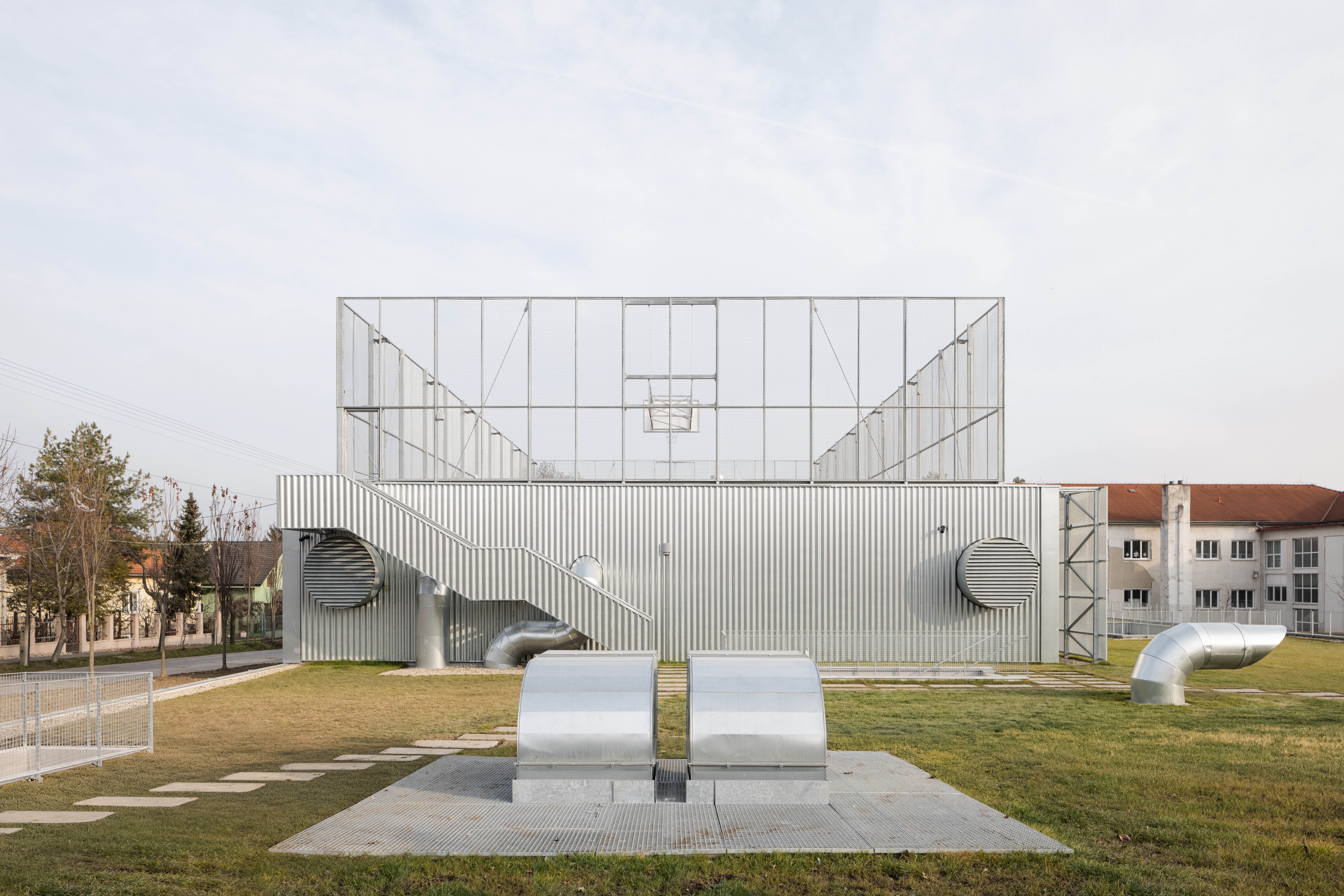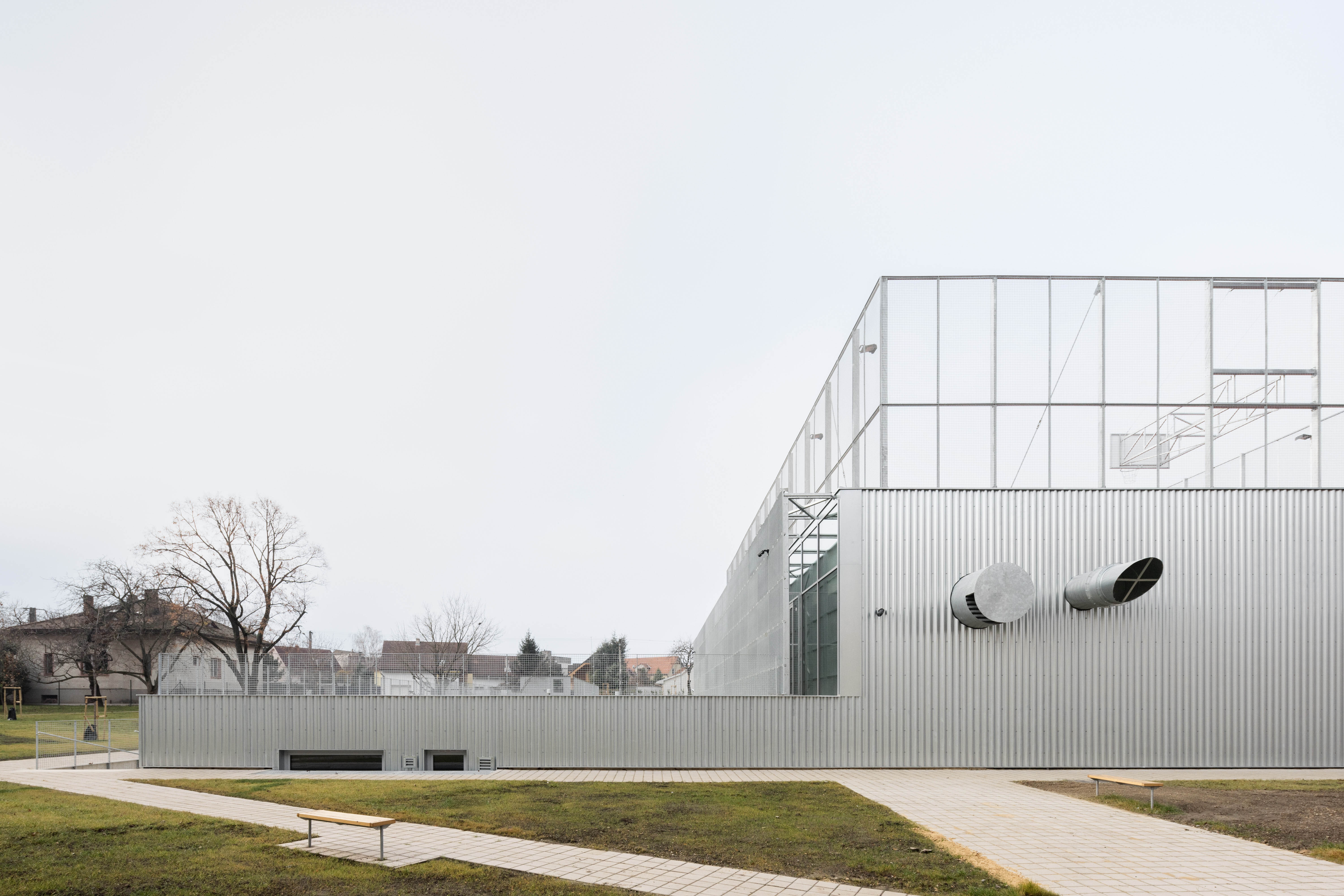 Autori umne využívajú stúpajúci terén parcely. Rozsiahly objem haly umiestňujú čiastočne pod úroveň terénu. Strechu objektu využívajú ako ďalší priestor pre exteriérové hrisko.