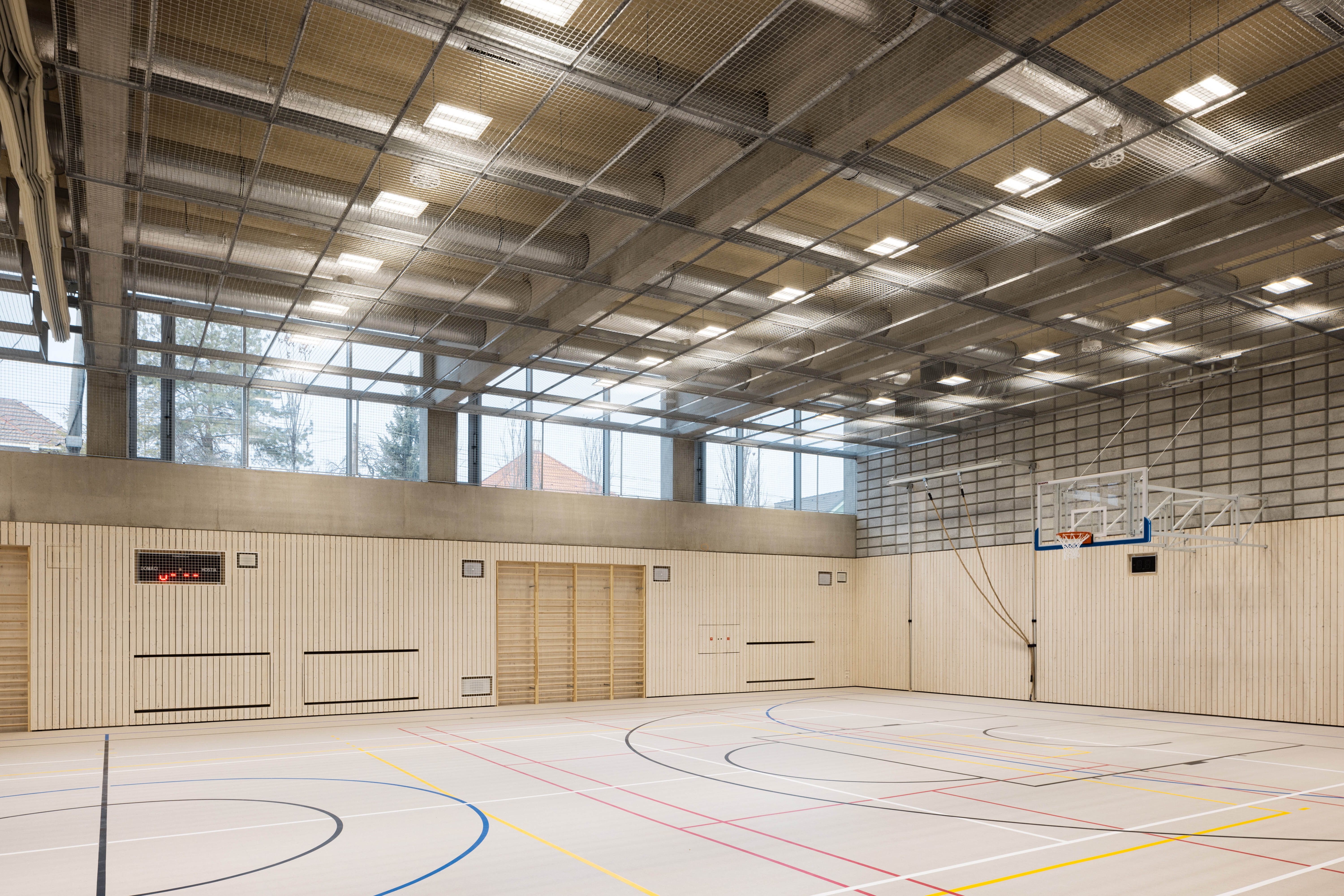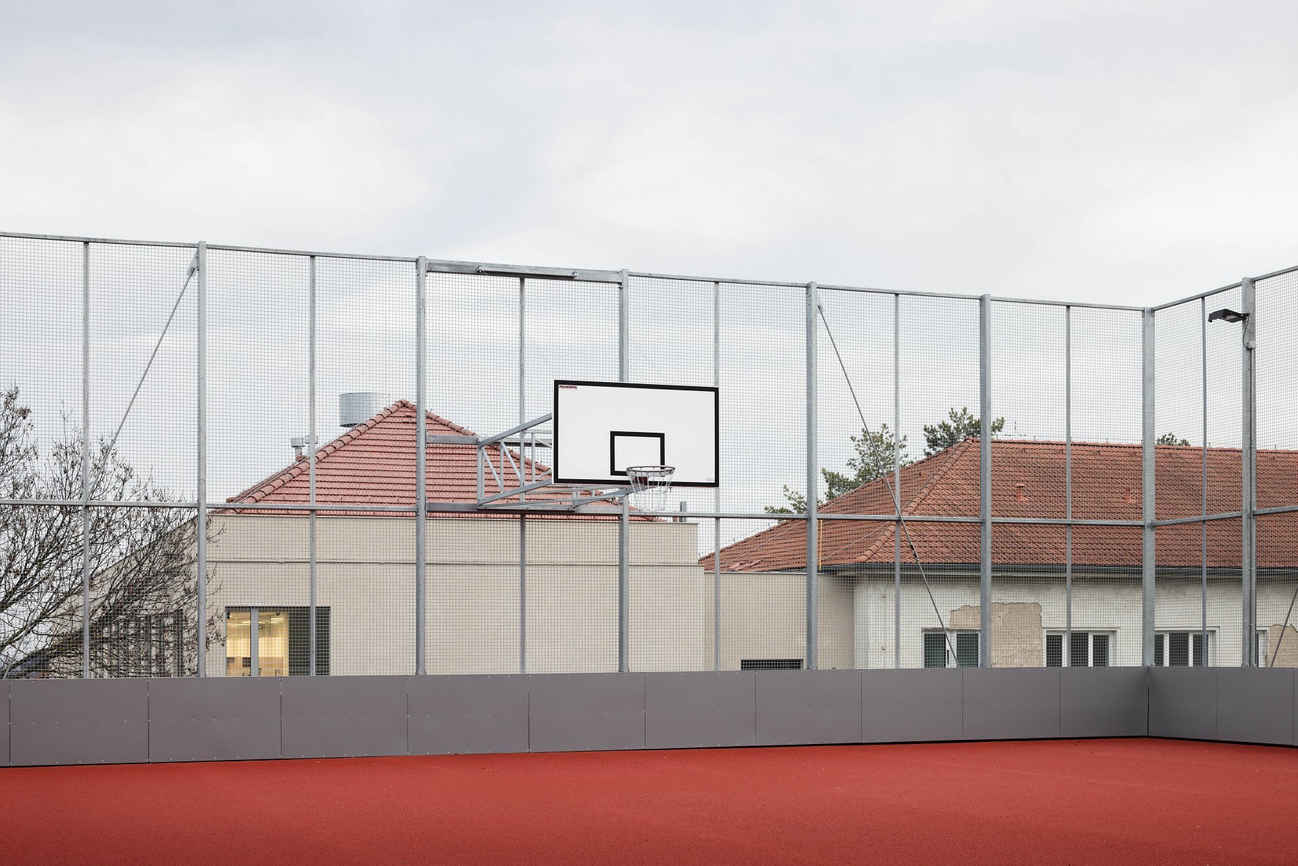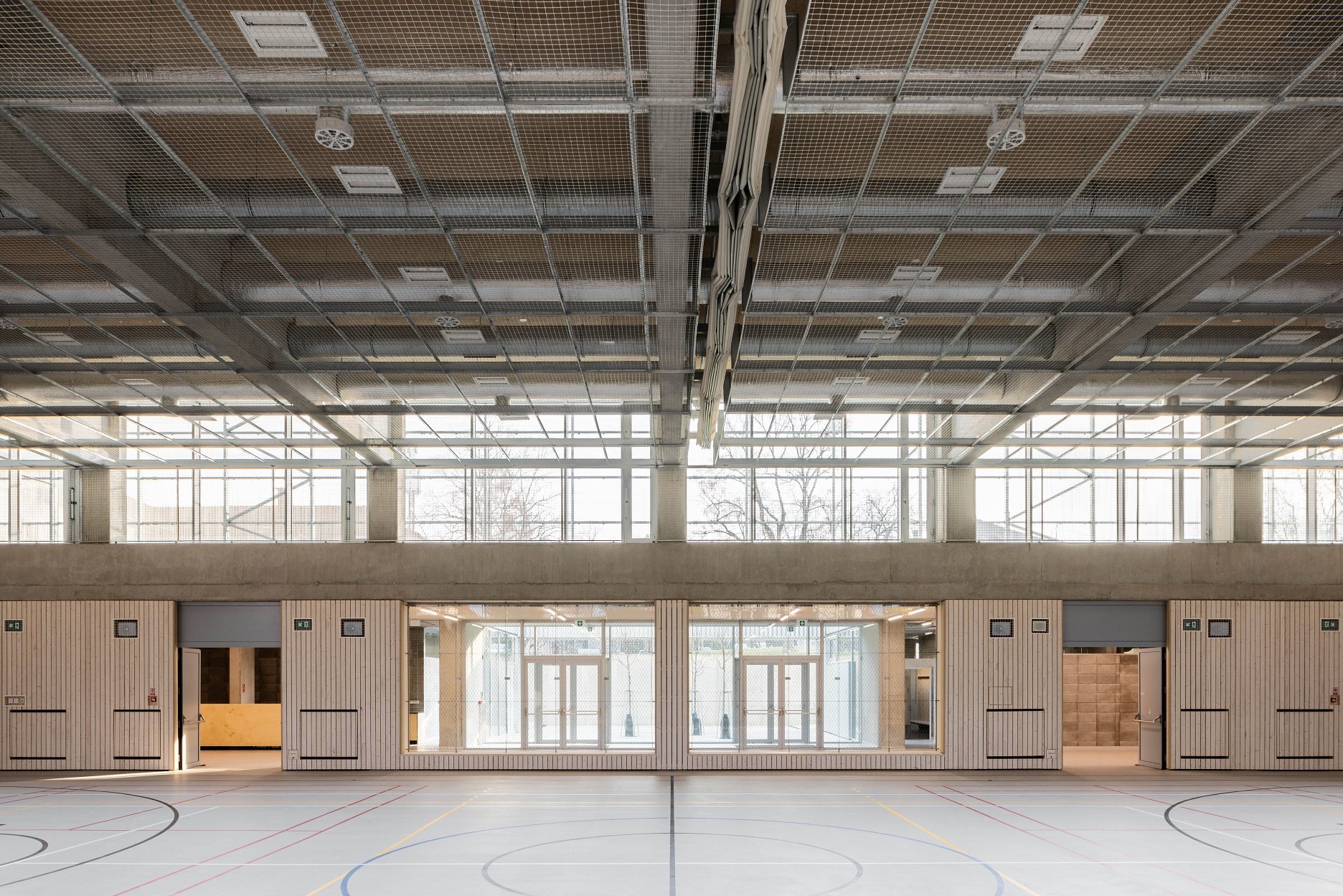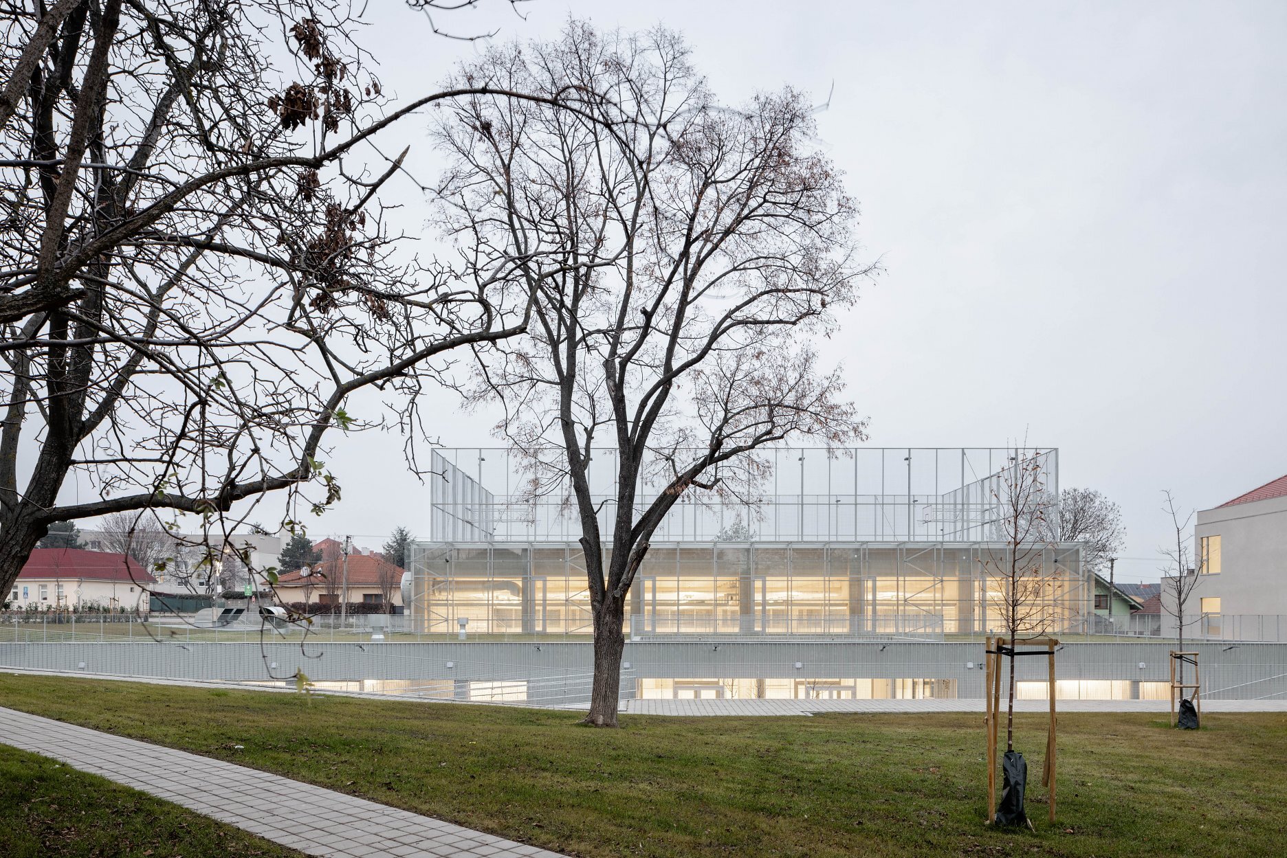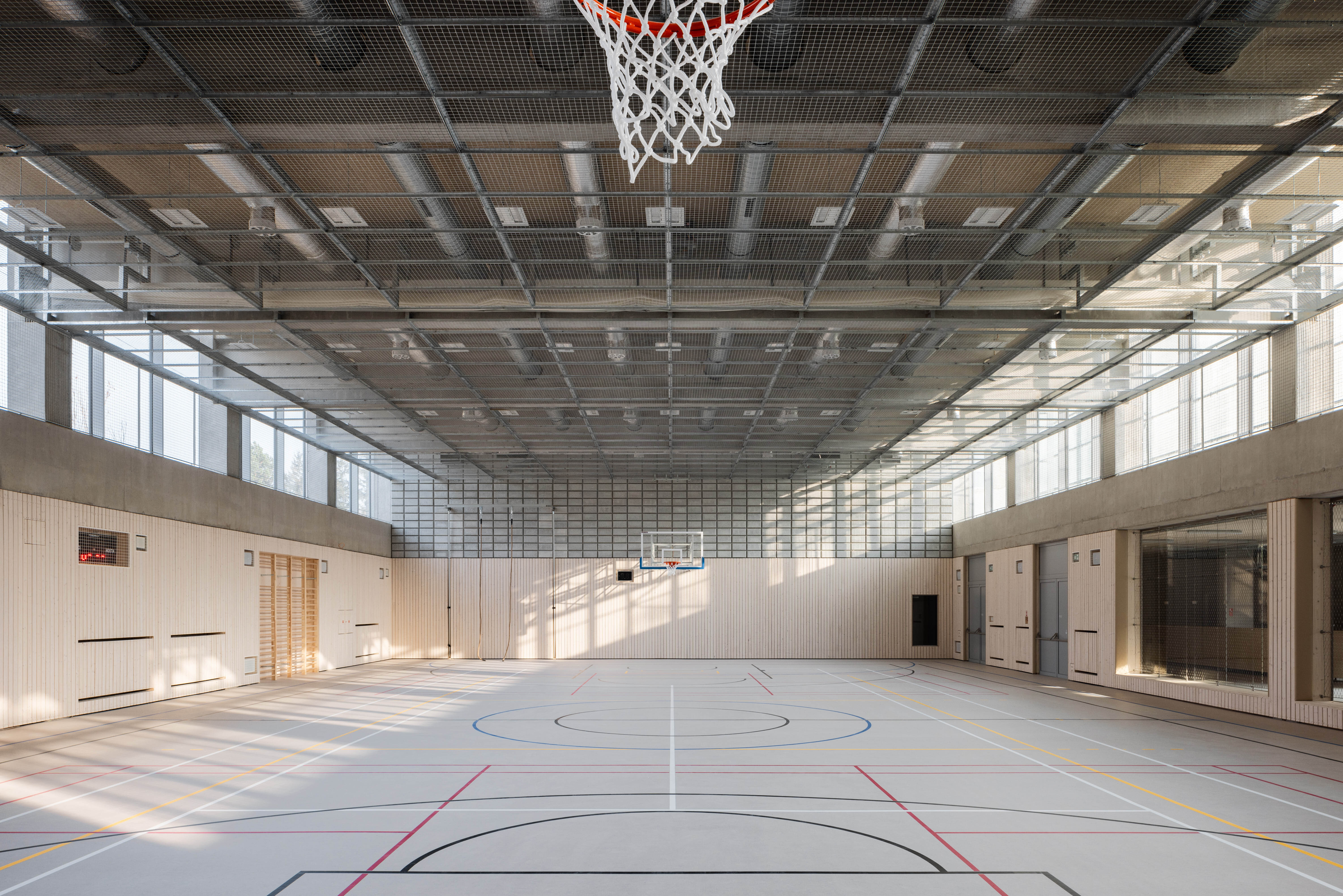 Autori umne využívajú stúpajúci terén parcely. Rozsiahly objem haly umiestňujú čiastočne pod úroveň terénu. Strechu objektu využívajú ako ďalší priestor pre exteriérové hrisko.
