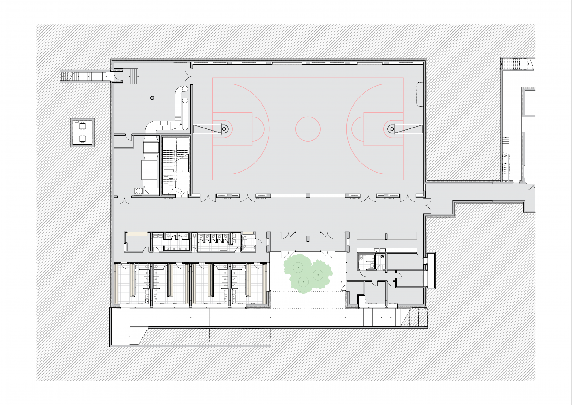 V nižšej hmote so zelenou pochôdznou strechou, ktorá sa zarezáva do terénu je vyrezané vstupné pátio prístupné rampou a schodiskom, na ktoré viaže priestranné foyer. V tejto časti sú umiestnené taktiež batérie šatní s hygienickým zázemím, strojovne technologických zariadení a sklady.